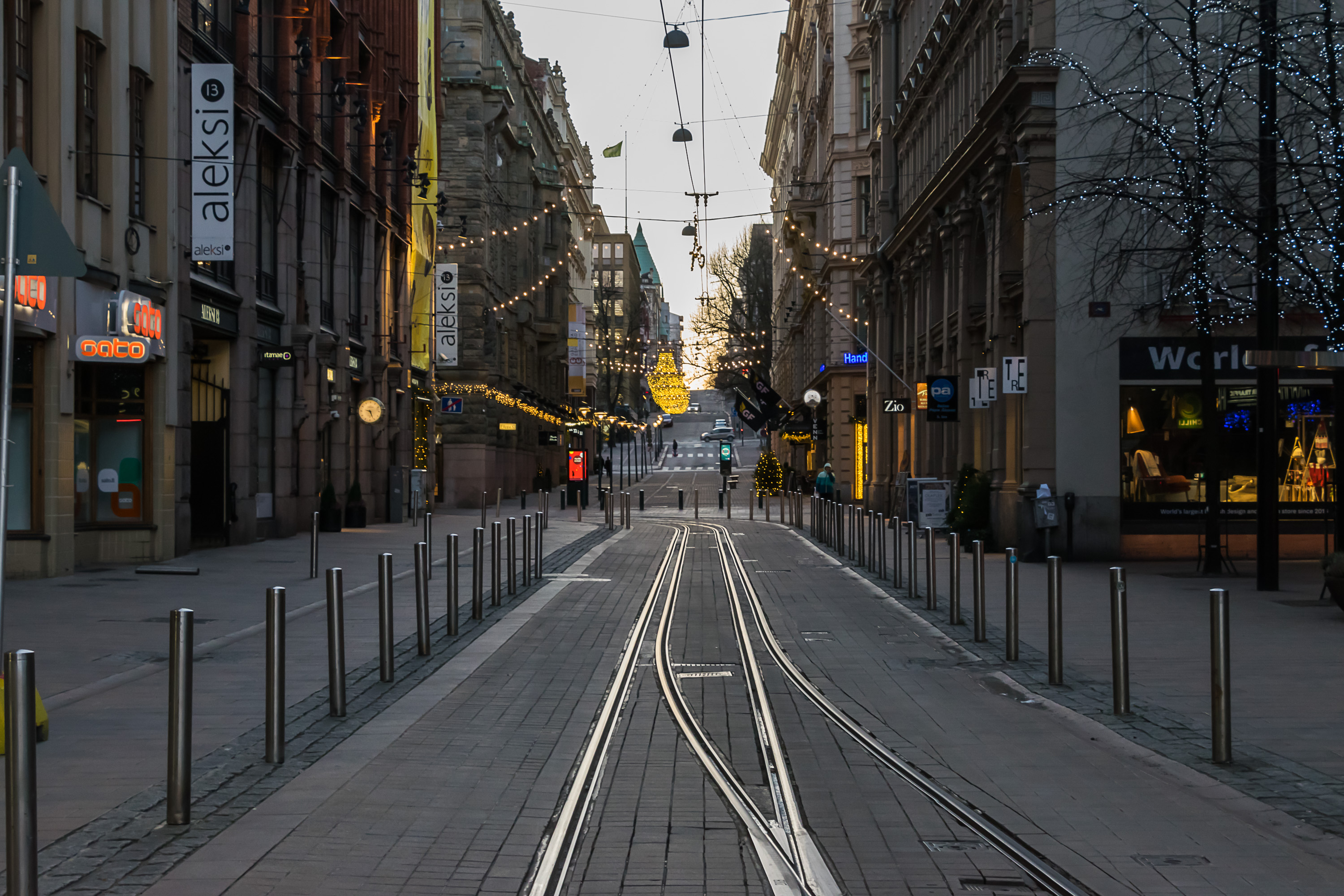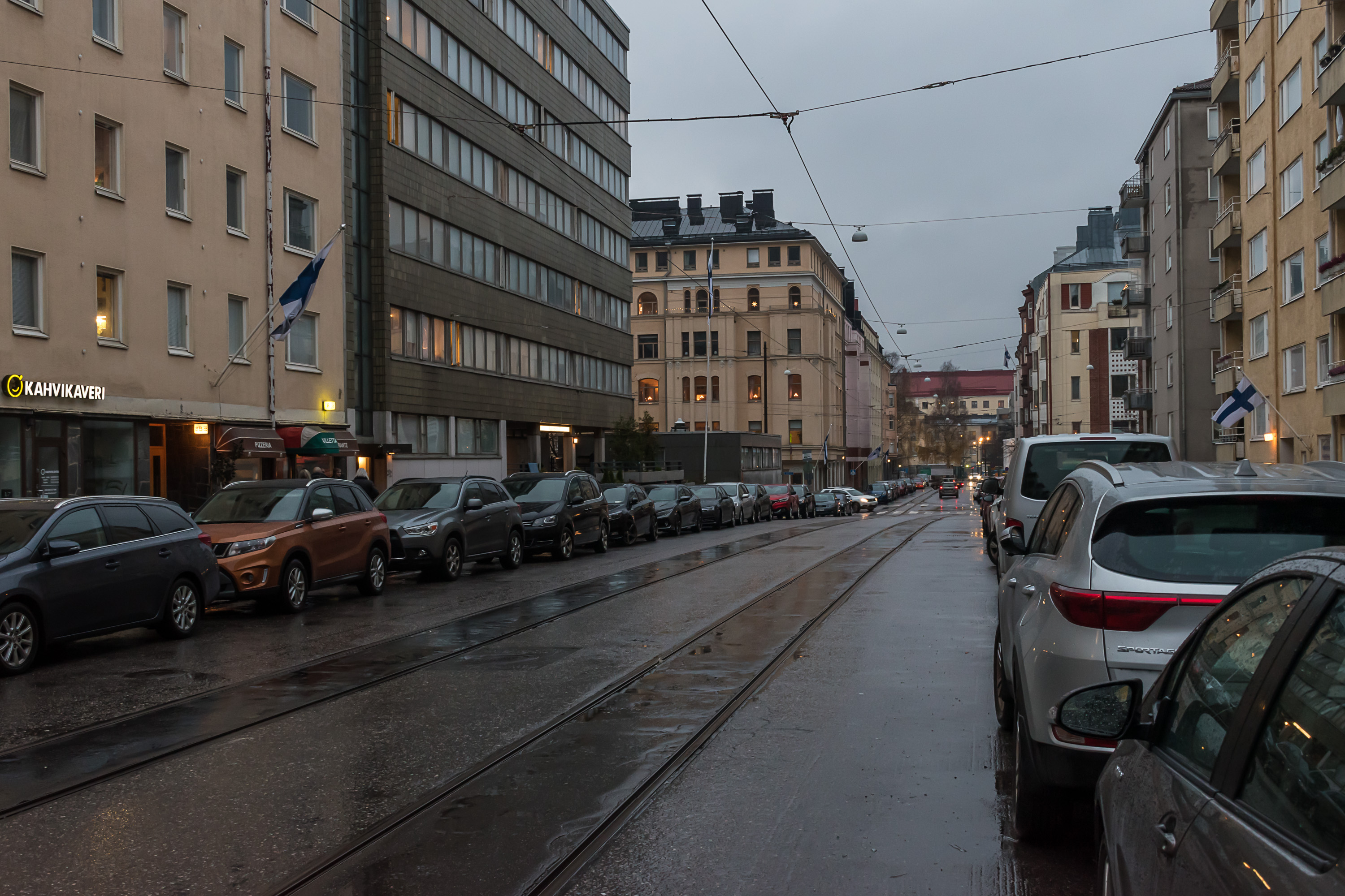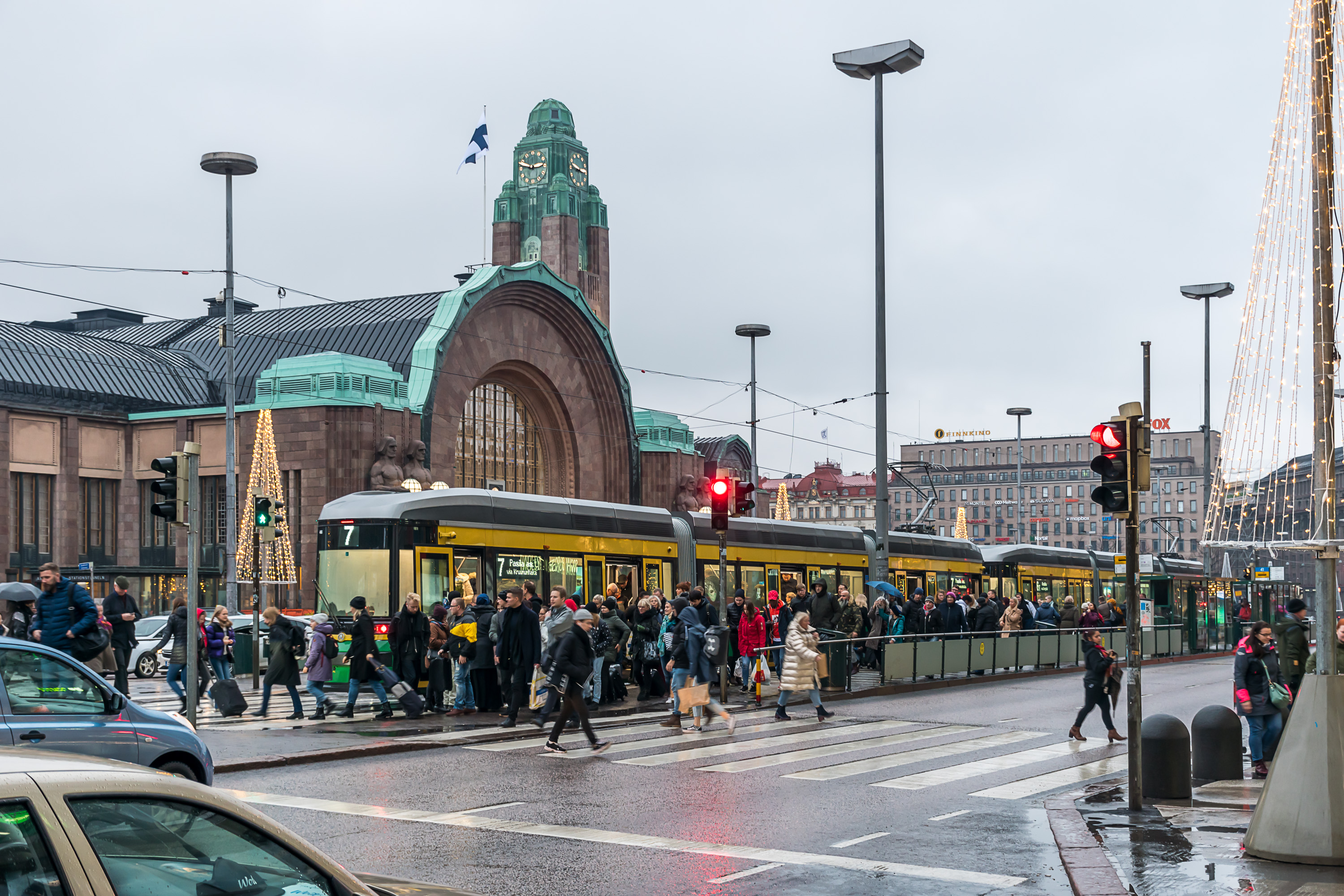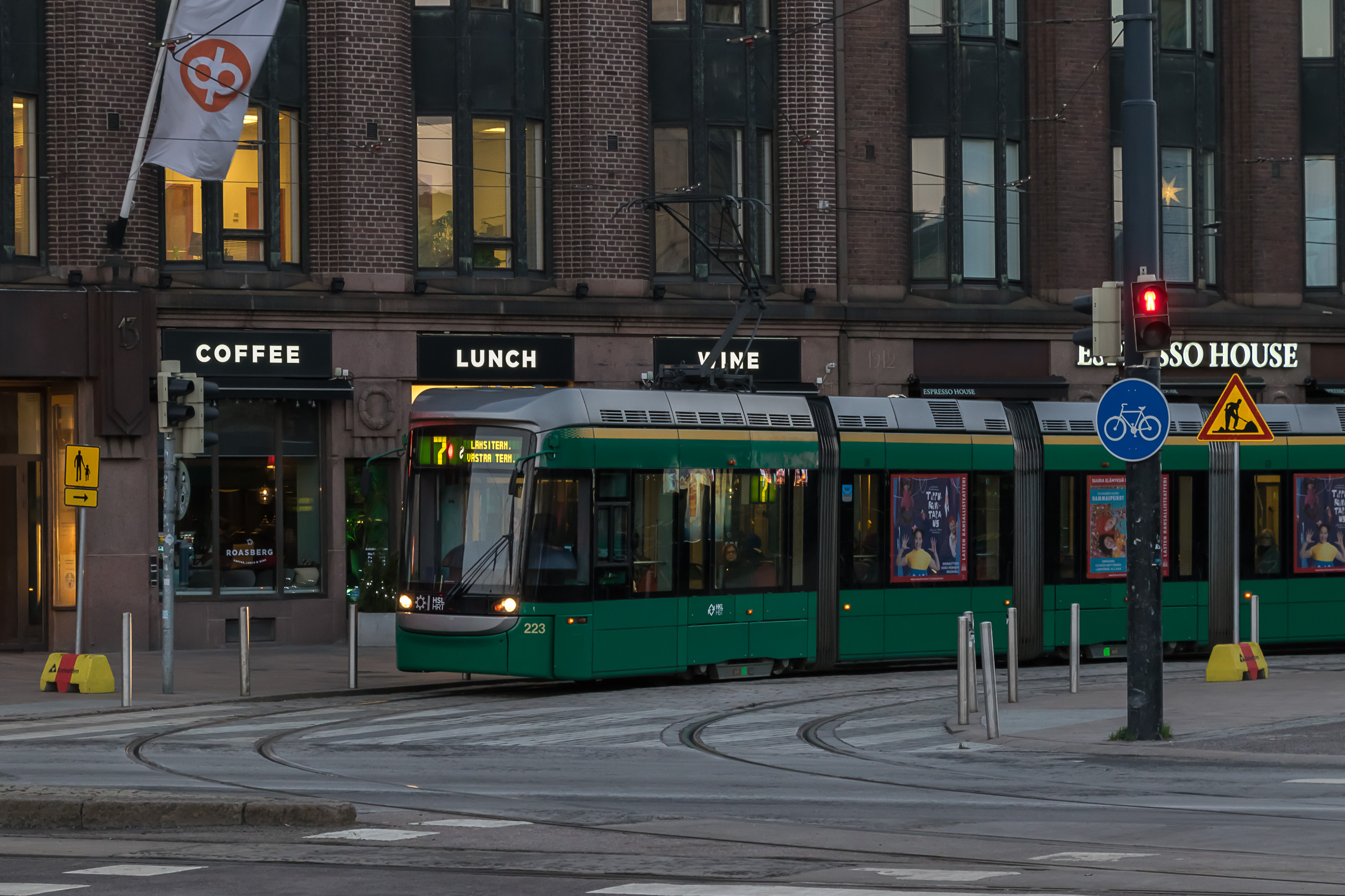 В центре Хельсинки существует довольно плотная трамвайная сеть, продолженная как на крупных улицах, так и в узких переулках. На улице Алексантеринкату (Aleksanterinkatu), главной пешеходной улице Хельсинки, движение разрешено только трамваям и такси. Трамвайные пути по возможности обособлены, и на перекрестках у них обычно бывает приоритет, как и предписано ПДД в большинстве стран; иногда также устанавливаются специальные треугольные светофоры, останавливающие все остальное движение, пока проезжает трамвай. Тем не менее, система неидеальна и трамвай местами может встать в пробку, хотя очень больших пробок в Хельсинки и не бывает.