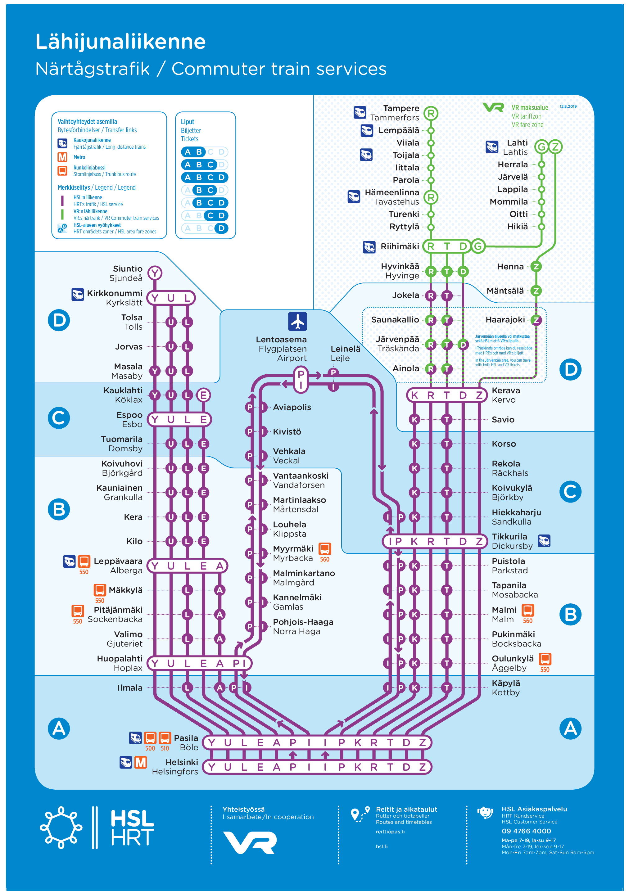 На данный момент в зоне HSL используется 8 маршрутов электричек, обозначаемых буквами; все они начинаются на вокзале Хельсинки.