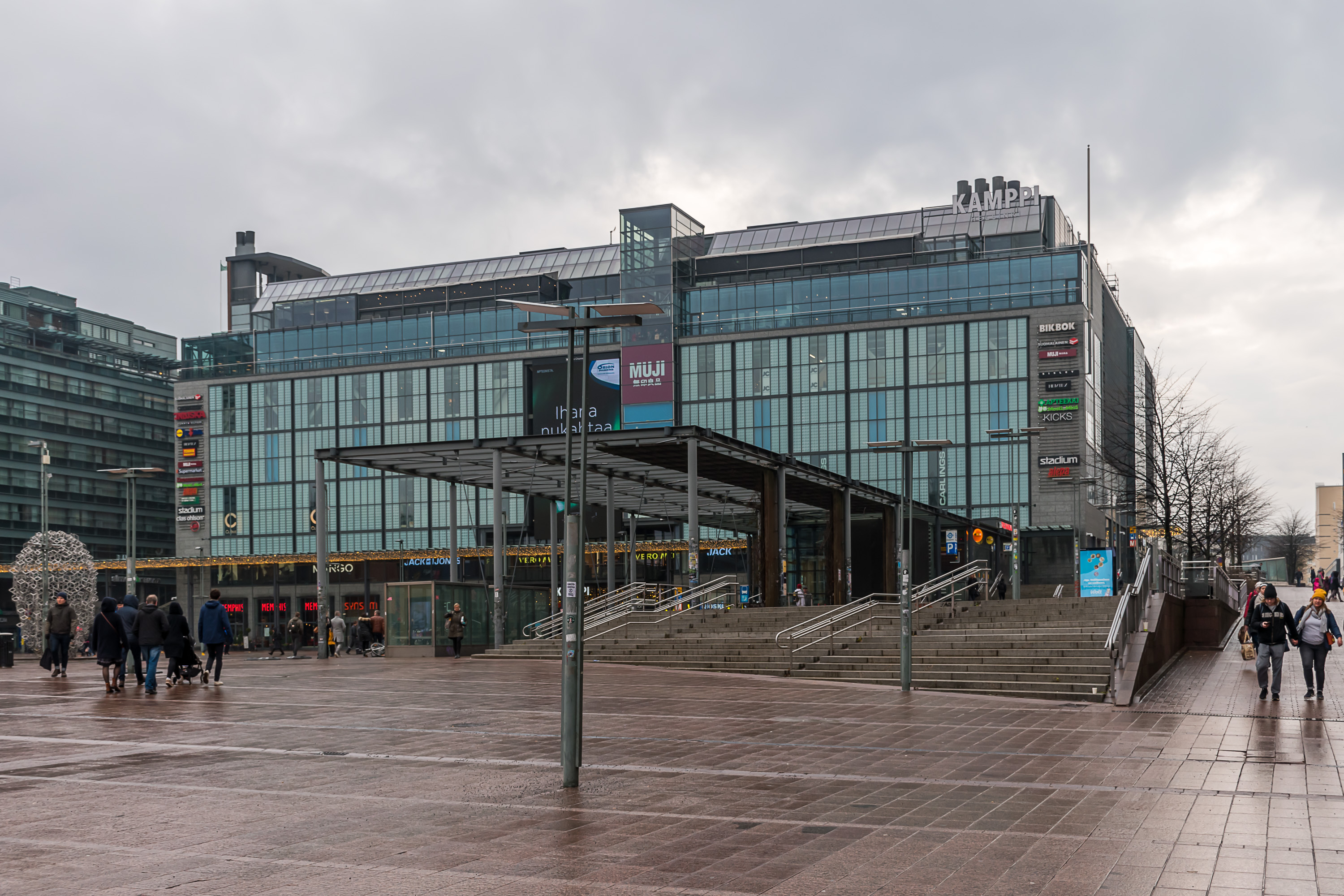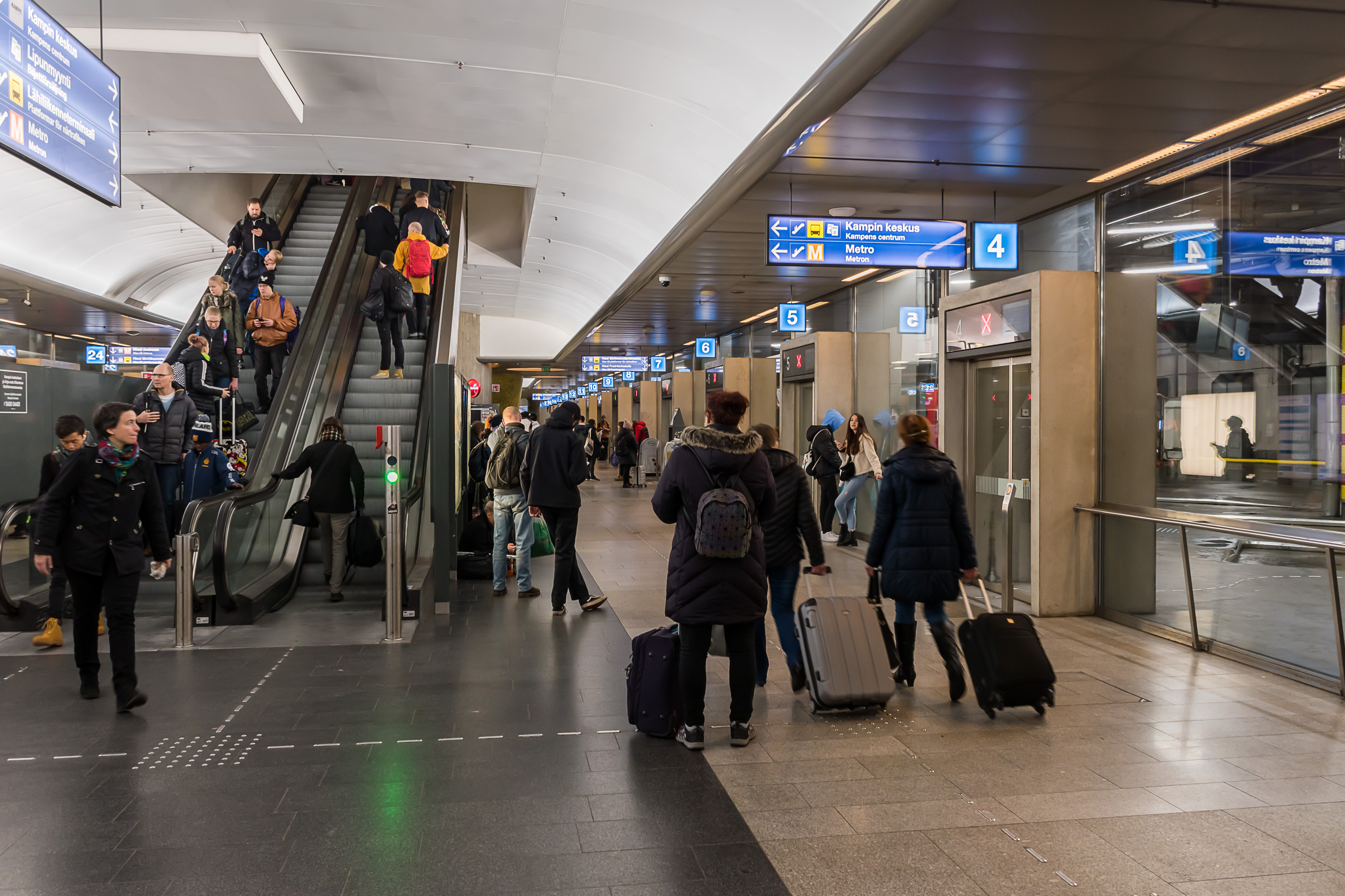 Центральная станция Раутатиеасема (Rautatieasema, Железнодорожный вокзал) имеет прямой выход в здание ж/д вокзала, а станция Камппи (Kamppi) — в подземный автовокзал с как местными, так и междугородными автобусами. В центре Хельсинки на самом деле существует целая сеть пешеходных туннелей и проходов между различными ТЦ, так что с Раутатиеасема до Камппи можно полностью под землей пройти и пешком при желании (через туннели и ТЦ Форум). За пределами центра автобусные терминалы действуют при станциях Тапиола, Матинкюля и Итякескус. Большинство станций за пределами центра также имеют перехватывающие парковки.