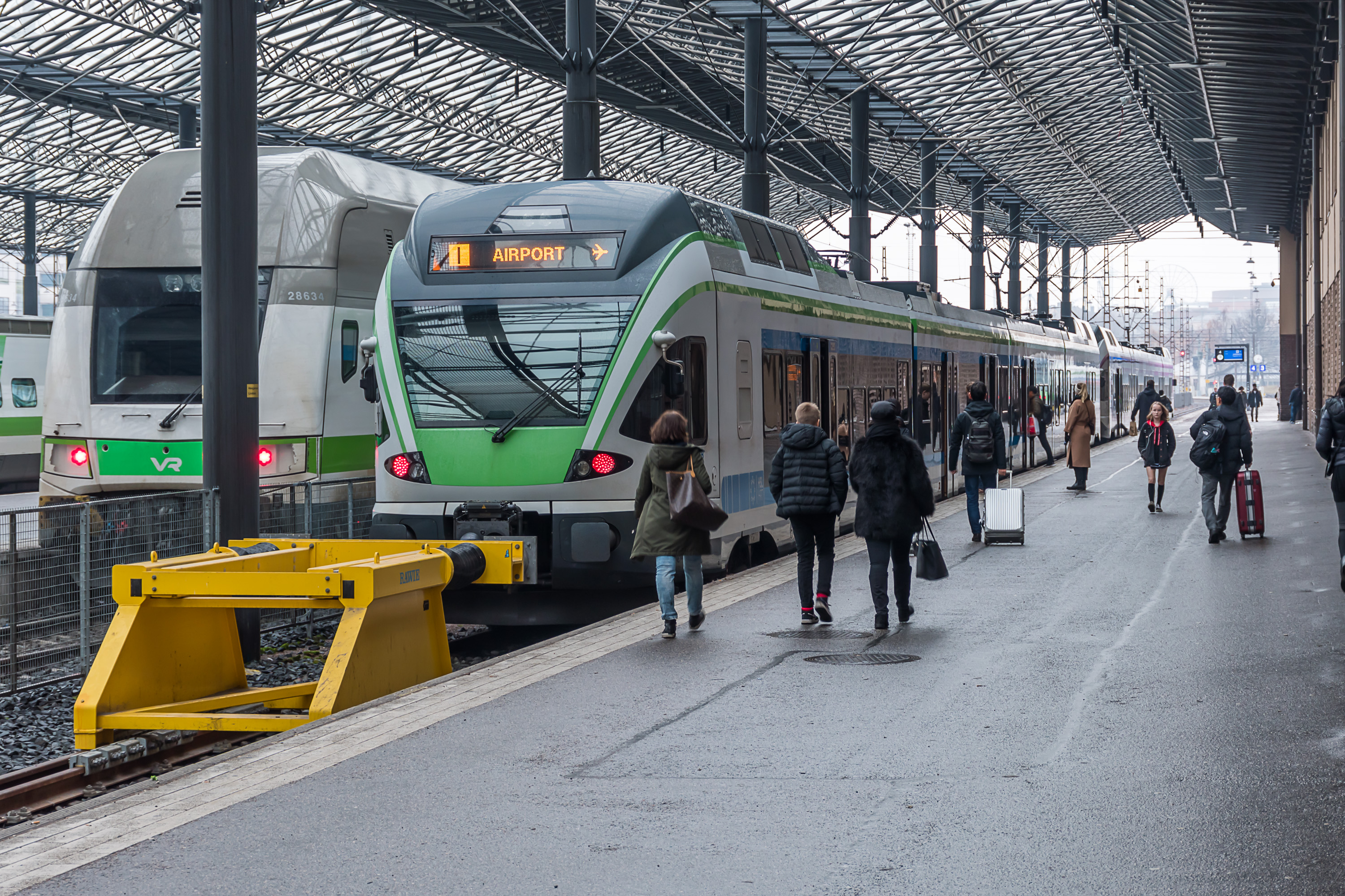 - I и P: Хельсинки-Аэропорт-Хельсинки, по Кольцевой ж/д. P — по часовой стрелке, I — против часовой. Интервалы 10-30 мин по будням, 15-30 мин по выходным. Часы примерно 04:30-01:30. Останавливается на всех станциях. Весь круг занимает около часа, а поездка с вокзала Хельсинки в аэропорт — около получаса на любом из маршрутов (на I чуть-чуть быстрее). 1-2 секции Sm5