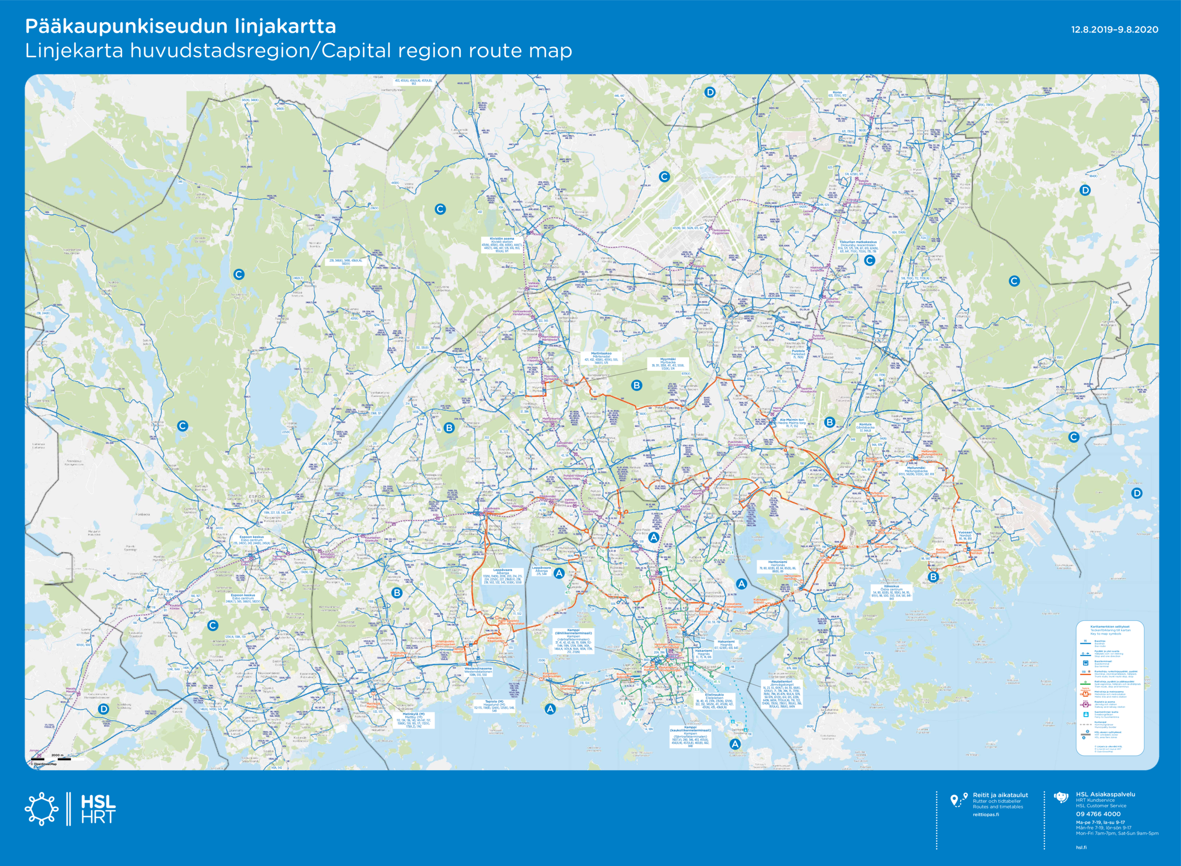 По номеру машрута можно примерно понять, где он ходит. Двузначные номера (самый маленький сейчас — 14) предназначены для автобусов, идущих не очень далеко от центрального Хельсинки. 1xx, 2xx, 3xx, 4xx, 6xx, 7xx и 8xx обслуживают "секторы" вокруг Хельсинки, например 1xx — Эспоо вдоль Западного шоссе (Länsiväylä), а 4xx — Вантаа вдоль Хямеэнлиннского шоссе (Hämeenlinnanväylä). 5xx для поперечных/хордовых маршрутов, а 9xx для внутренних маршрутов дальних городов Большого Хельсинки, таких, как Керава. Буквы A, B, K, Z, V могут означать вариант маршрута. Буква N означает ночные автобусы.