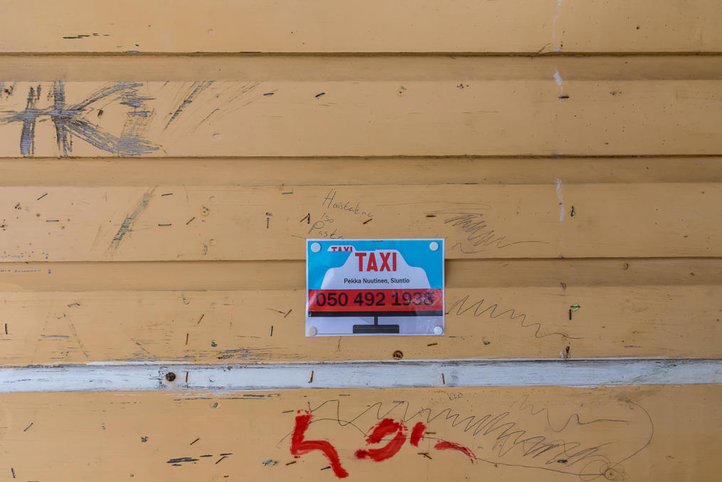 27. Телефон местного такси от Пекки в павильоне на станции. На стене нацарапано "понюхайте большое говно".