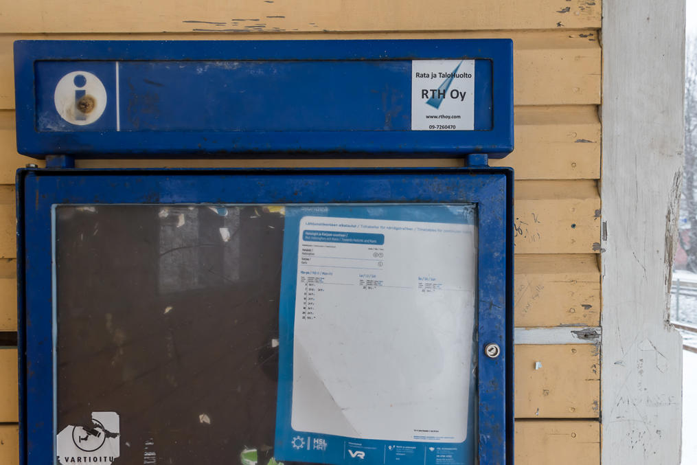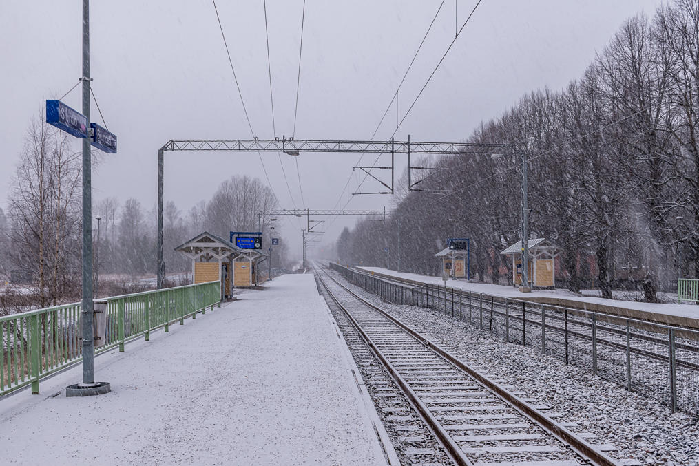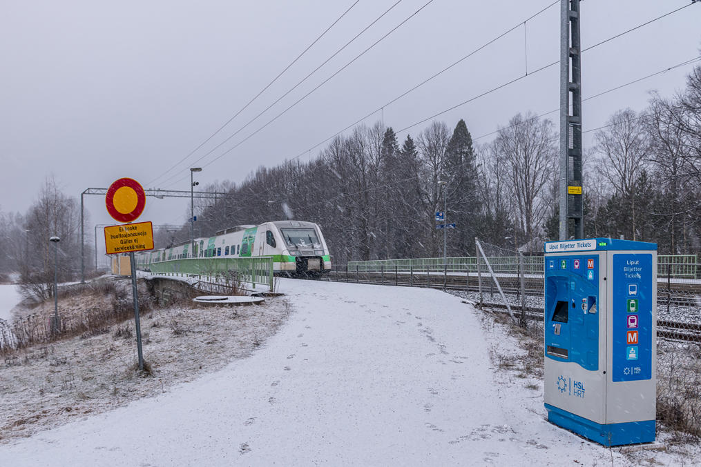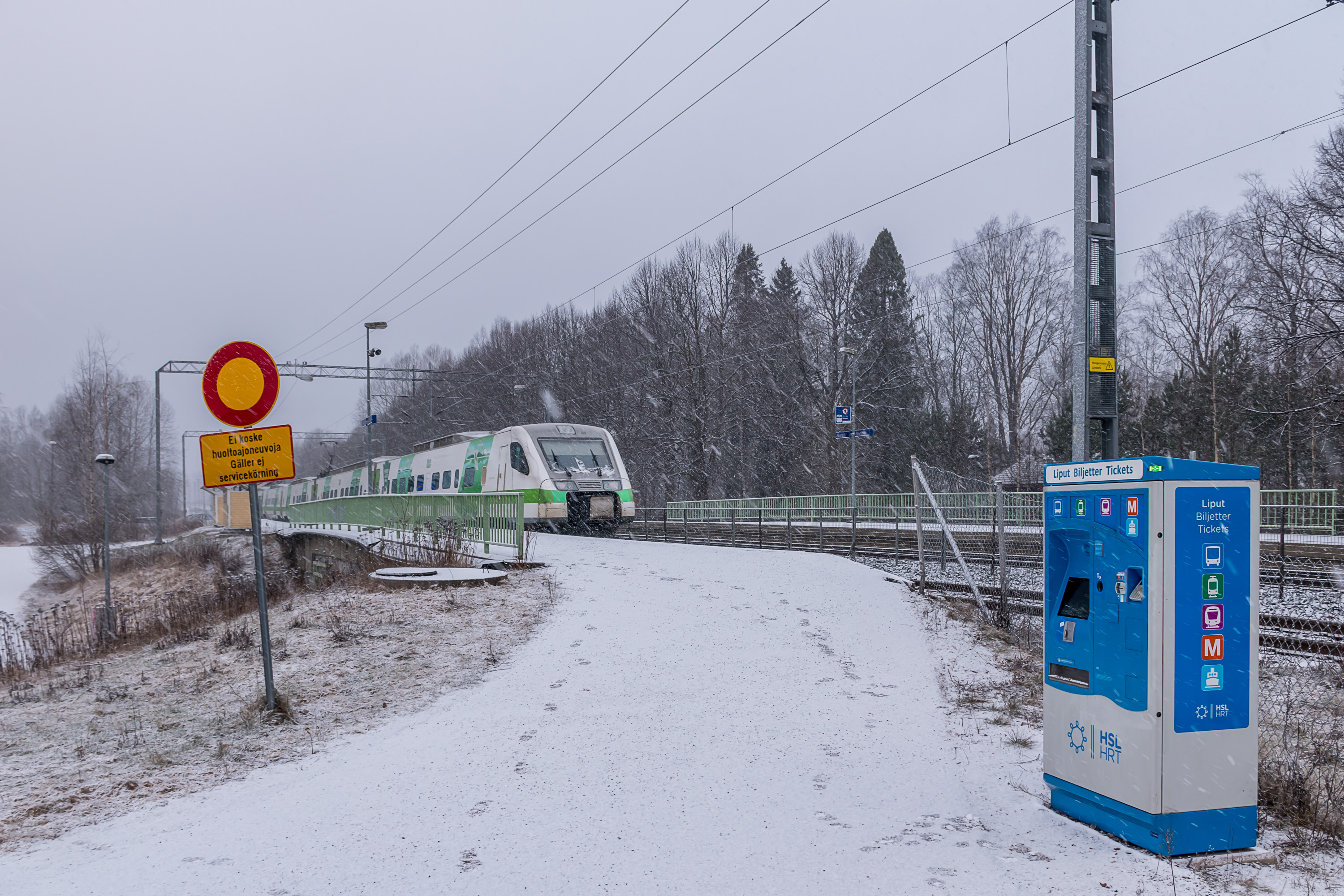24. На самом деле это не станция, а разъезд — я застал поезд Пендолино на Турку, сделавший здесь техническую остановку, пропуская встречный Интерсити на Хельсинки (почти весь Приморский ход однопутный, 2-й путь кончается в Киркконумми). С поездов дальнего следования выйти или зайти здесь нельзя. Раньше у станции было какое-то путевое развитие и подъездной путь на кирпичный заводик, но сейчас от всего этого (и заводика тоже) никаких следов не осталось. Автомат по продаже билетов от HSL в таком месте, конечно, забавно смотрится. Я даже смеха ради специально купил в нем на транспортную карточку себе проездной на следующий месяц, как раз пора было.