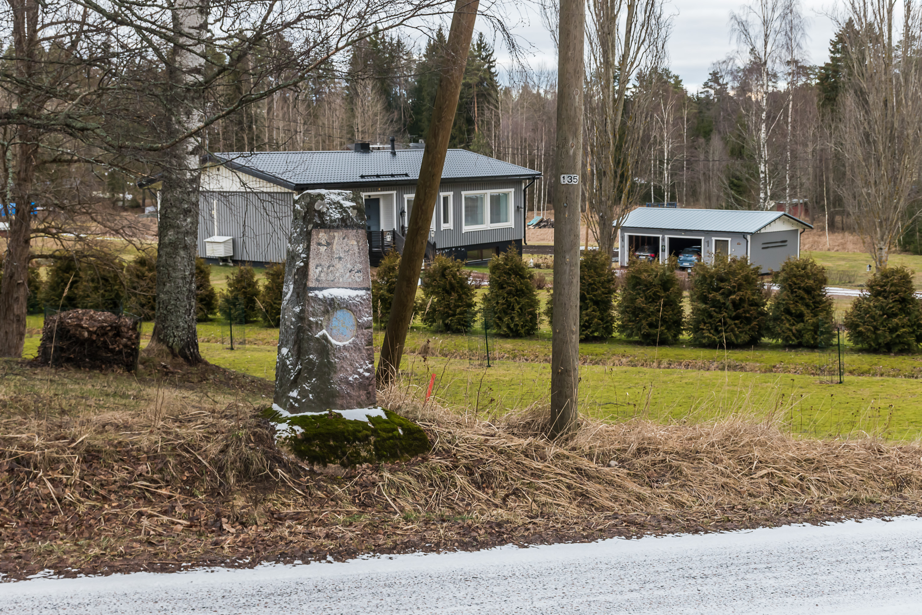 48. Еще одно свидетель старого Королевского тракта — каменный километровый столб, с уже почти нечитаемыми цифрами. Такие столбы ставились в 1920-1930-х, позже от них отказались, и сейчас их можно увидеть в основном как раз у старых дорог, давно спрямленных с тех пор. Синяя отметка означает, что дорога относилась к национальным трассам второй категории (kantatie, фин. главная дорога); такую же категорию имеет и современная трасса 51, параллельная старой дороге, только для таких дорог сейчас используются желтые номера вместо синих.