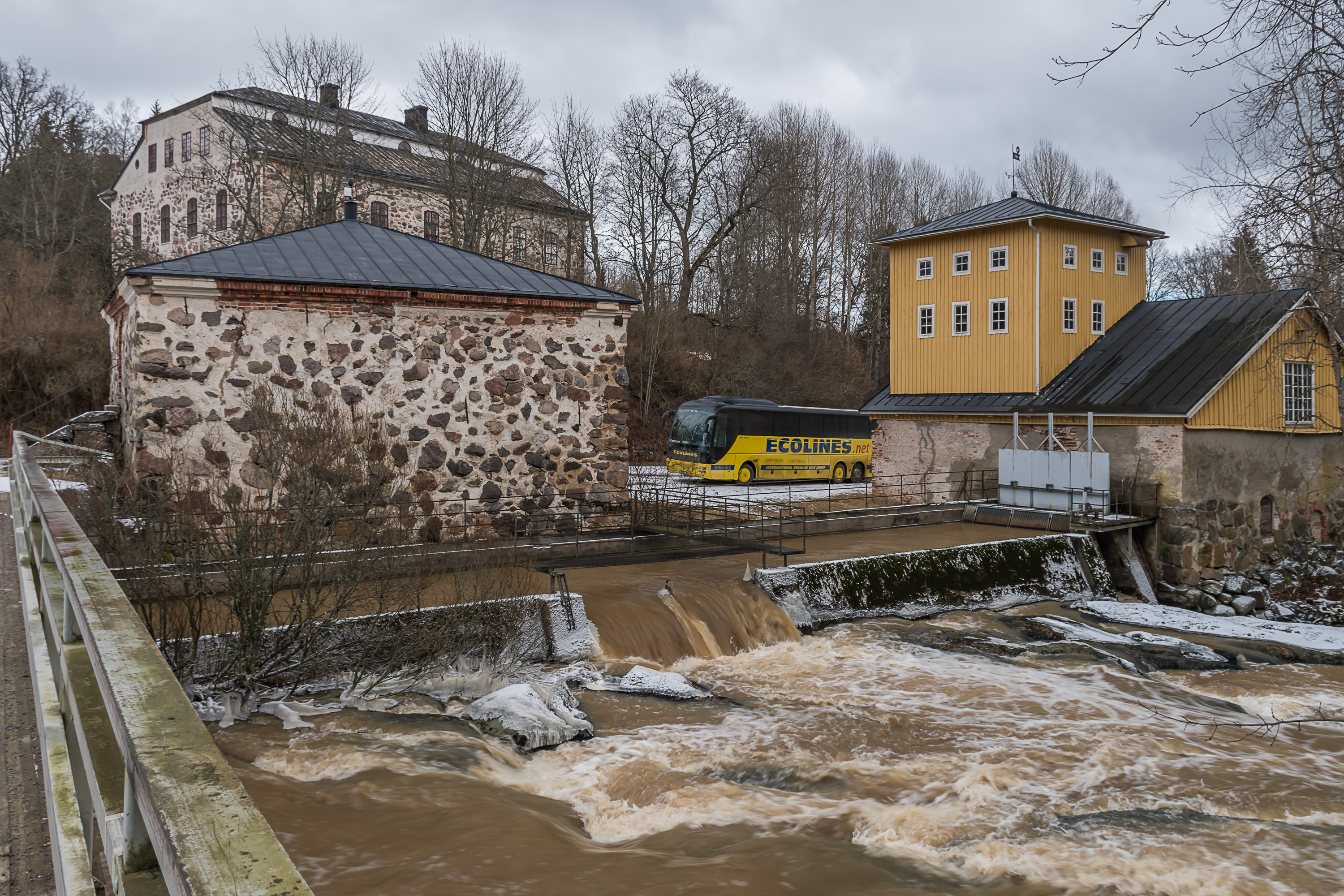 4. Усадьба стоит у порогов реки Сиунтионйоки (Siuntionjoki), или Шундео-О (Sjundeå å). Эта не слишком большая река, вытекающая из одера Эняярви под Нуммелой в Вихти, длиной около 50 км, считается одной из сохранившихся лучше всего в первозданном виде рек области Уусимаа Южной Финляндии. В числе прочего здесь сохраняется популяция кумжи. Плотин на реке нет, исключая эту в Шундбю, не перекрывающую реку полностью. Здесь до сих пор действует маленькая частная ГЭС, исключительно для нужд самой усадьбы. Больше я таких усадебных ГЭС в Финляндии сходу не припомню, хотя уверен, что где-нибудь еще да есть.