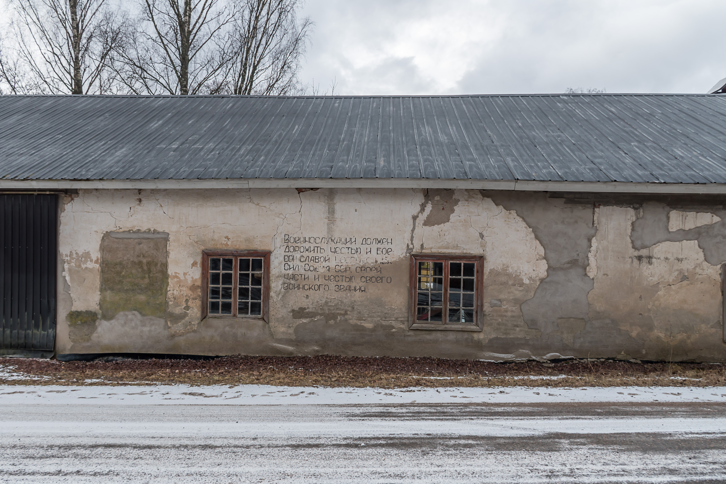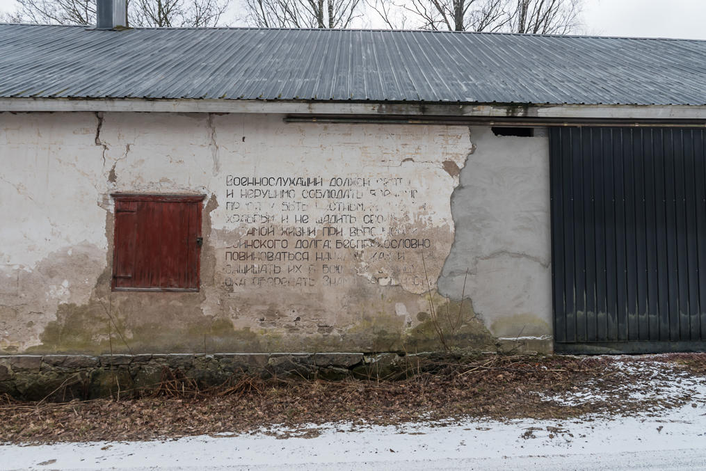 Гулял я вчера по округе села Сиунтио (Siuntio, шв. Шундео, Sjundeå), примерно в 40 км на запад от Хельсинки. Интересное место; городские автобусы еще ходят, а по будням даже и электричка, но местность уже полностью сельская, новых многоэтажек не строят. Иду по проселочной дороге, и тут из-за поворота, внезапно! "Военнослужащий должен дорожить честью и боевой славой Вооруженных сил Союза ССР, своей части и честью своего воинского звания..."