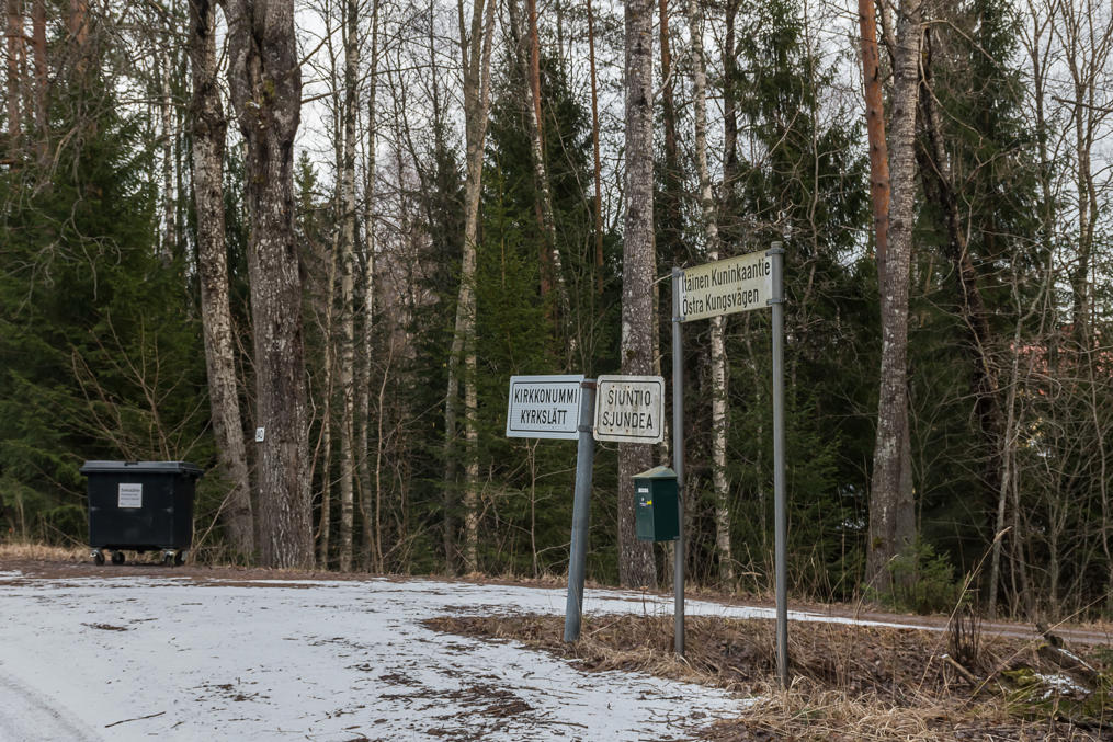 47. Пограничный знак Сиунтио и Киркконумми на старой дороге — Королевском тракте (Kuninkaantie). На территории Сиунтио дорога так и зовется, Восточный Королевский тракт. Когда-то это была главная дорога Турку-Выборг. Сейчас здесь ездят редко (современная трасса 51, Хельсинки-Киркконумми-Карьяа, проходит несколькими километрами южнее и обходит населенные пункты), и сохранился знак границ муниципалитетов старого образца.