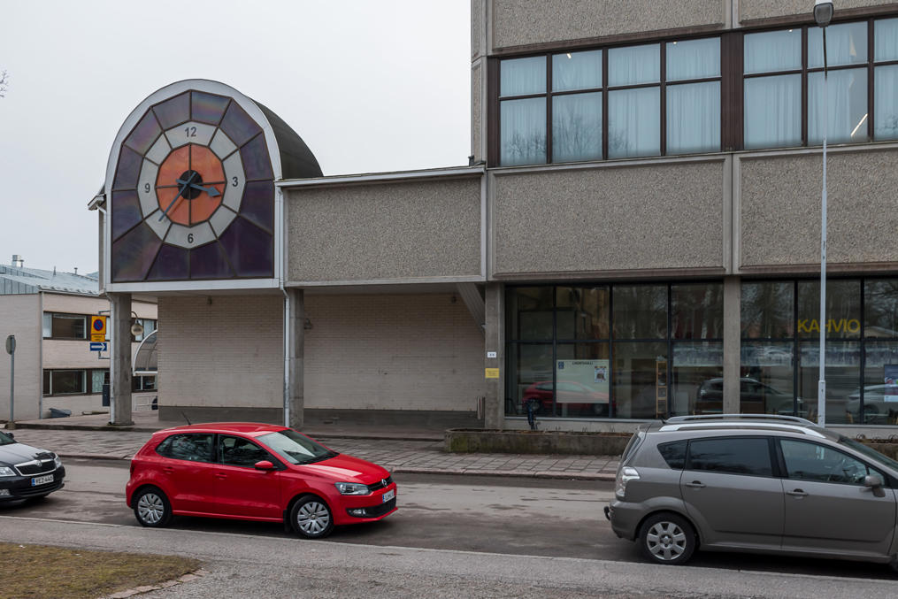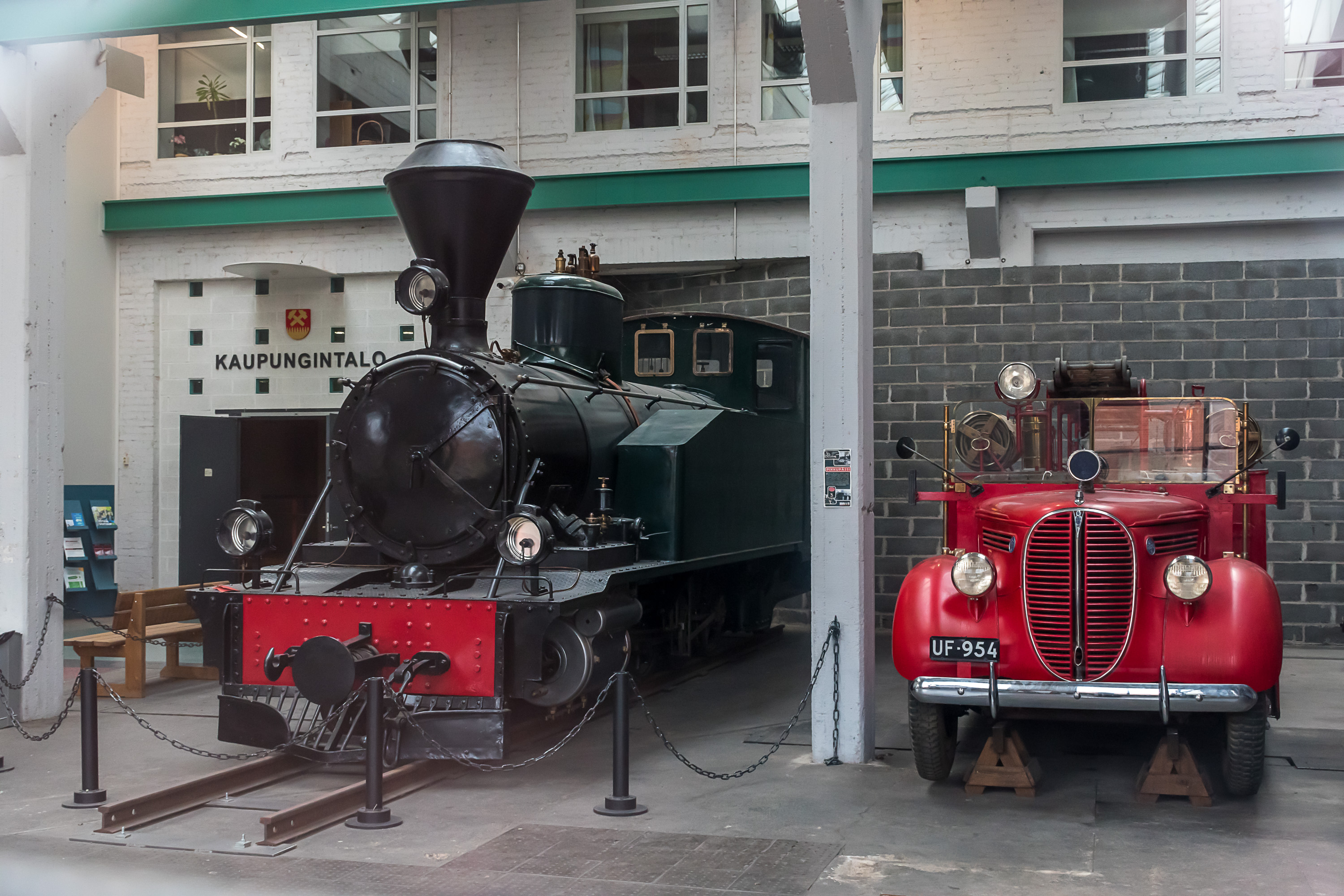 Паровоз, HKR 3, модели Hb 68, построен на заводе Тампелла в Тампере, известен также как "барашек" (Pikkupässi). Он стоит на самом деле под крышей, в фойе здания, так что найти его мне удалось с некоторым трудом. Здание городской администрации, конечно, было закрыто в субботу, так что я смог сфотографировать паровоз лишь снаружи через стекло. Что за машина стоит справа — не знаю и онлайн ничего не нашел.