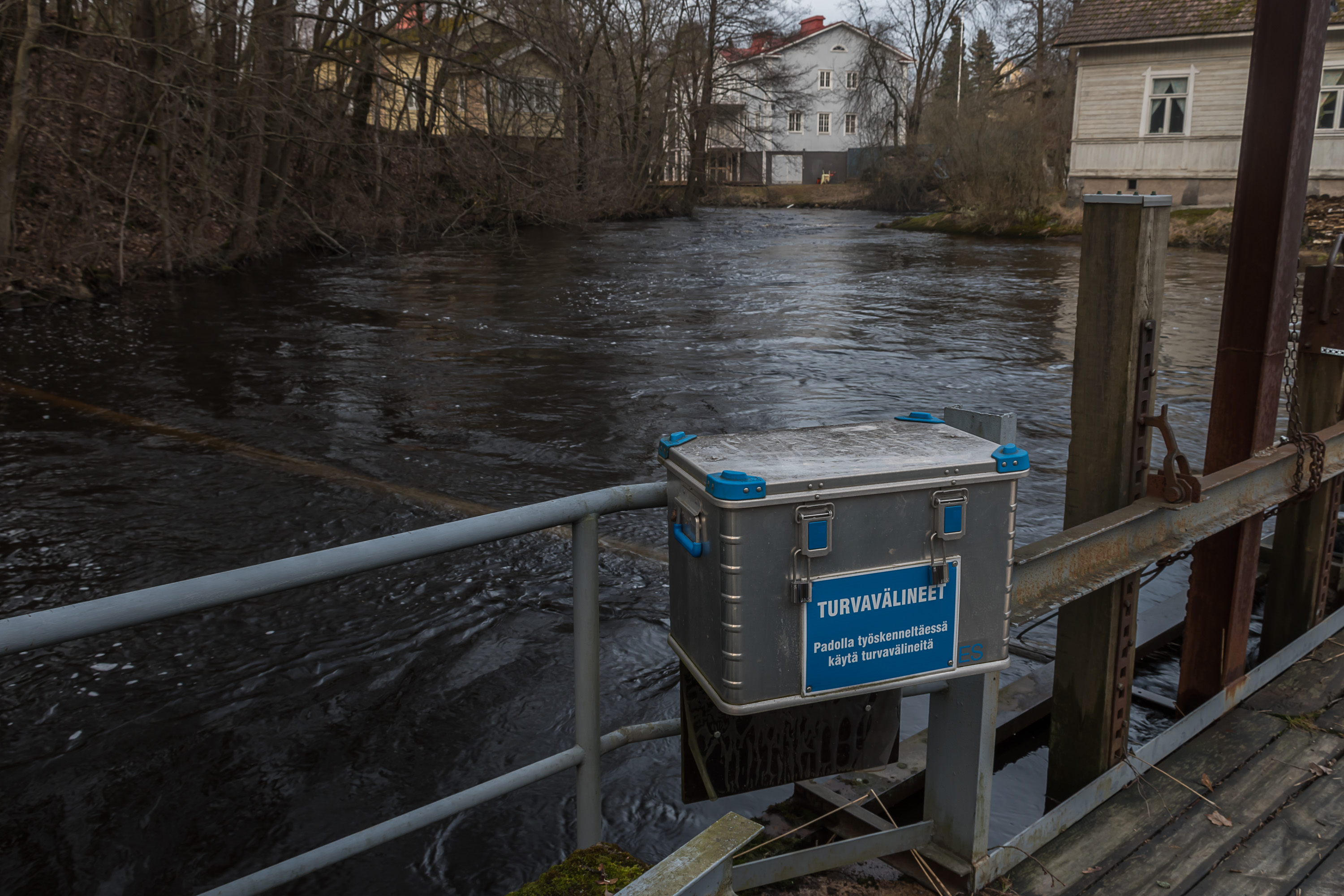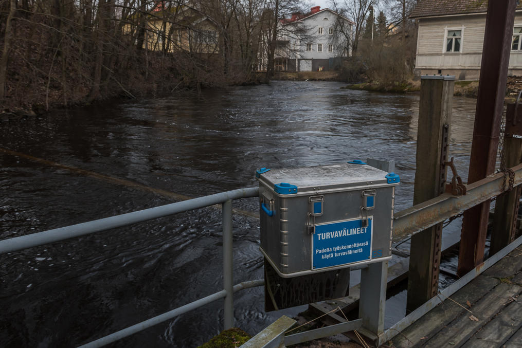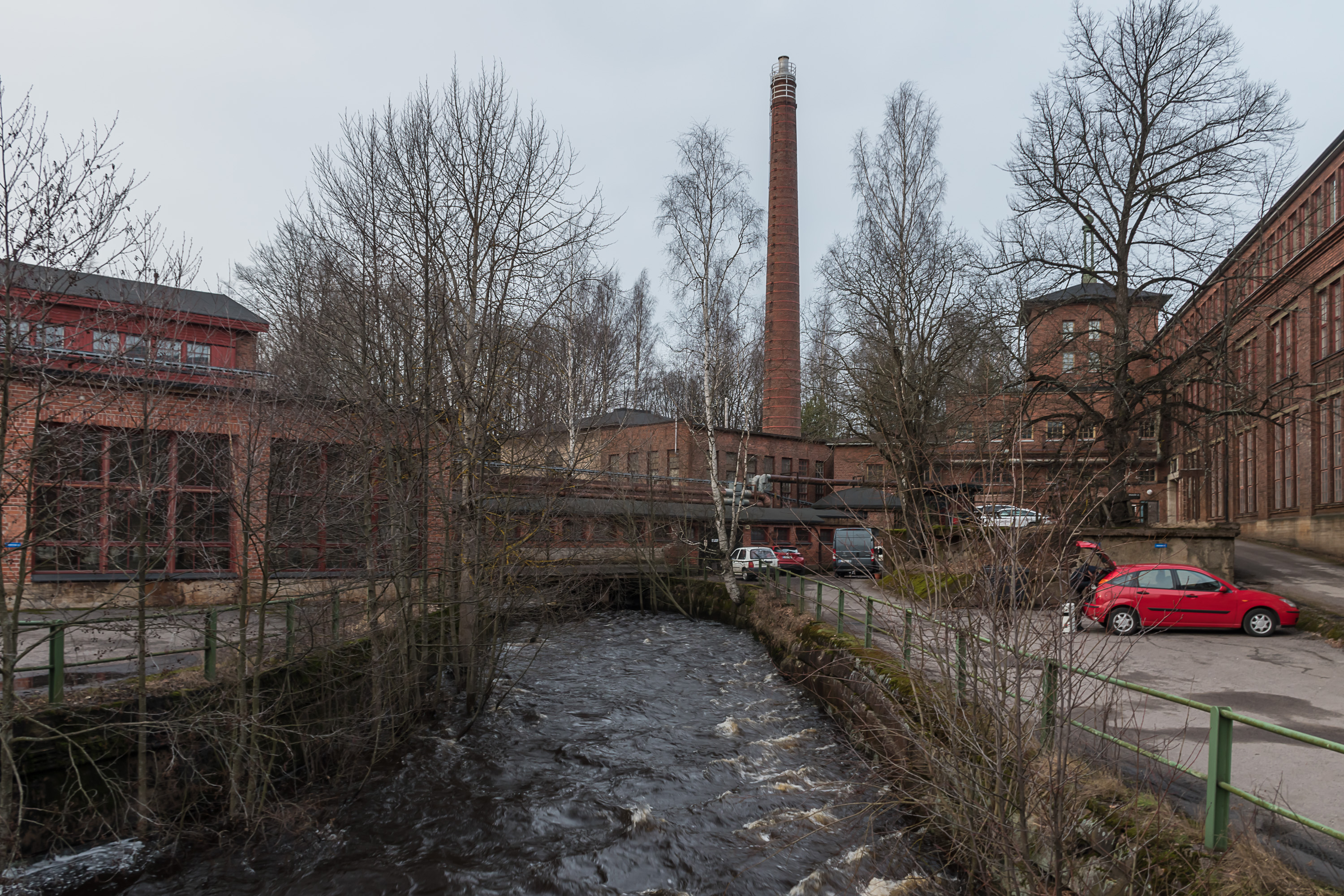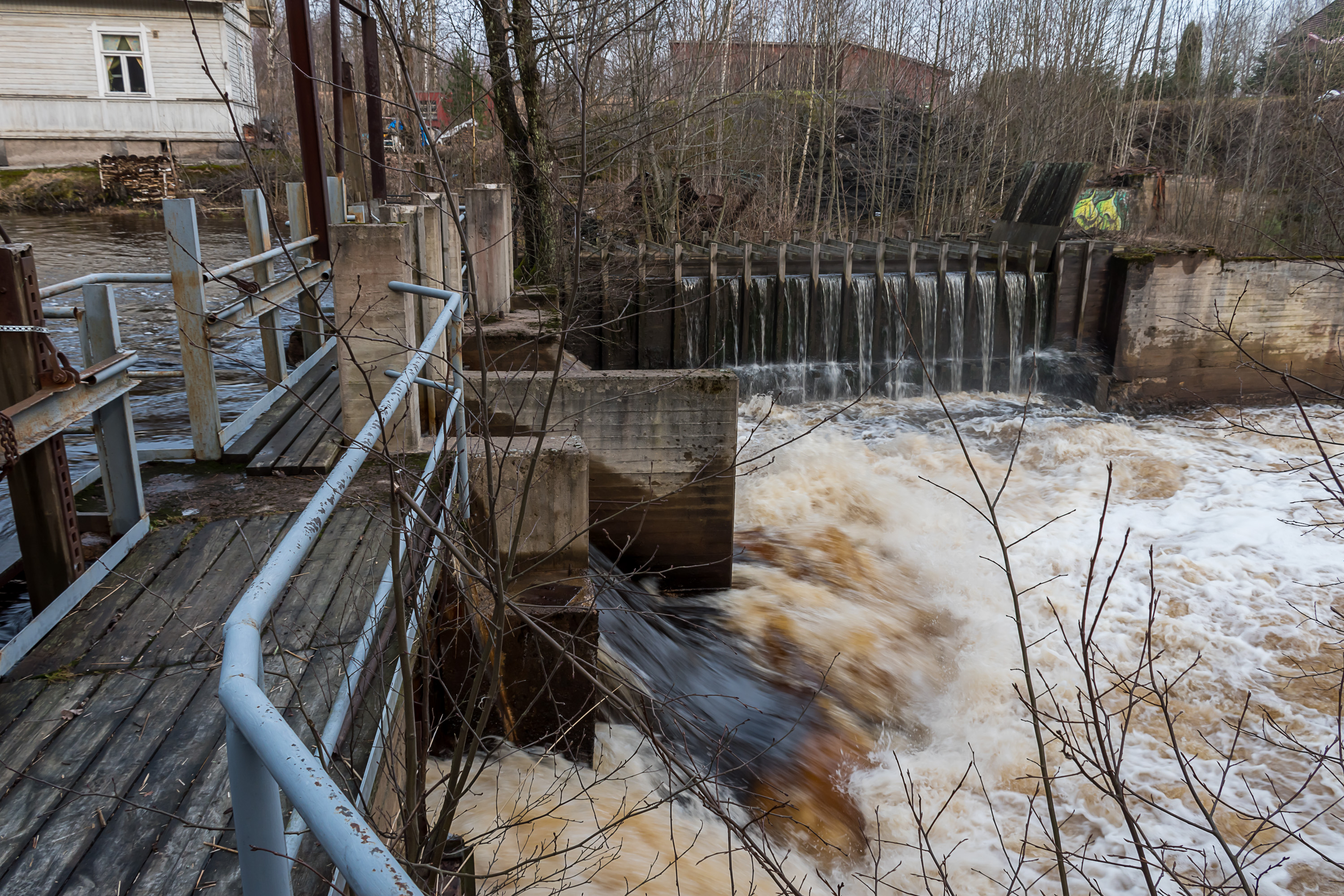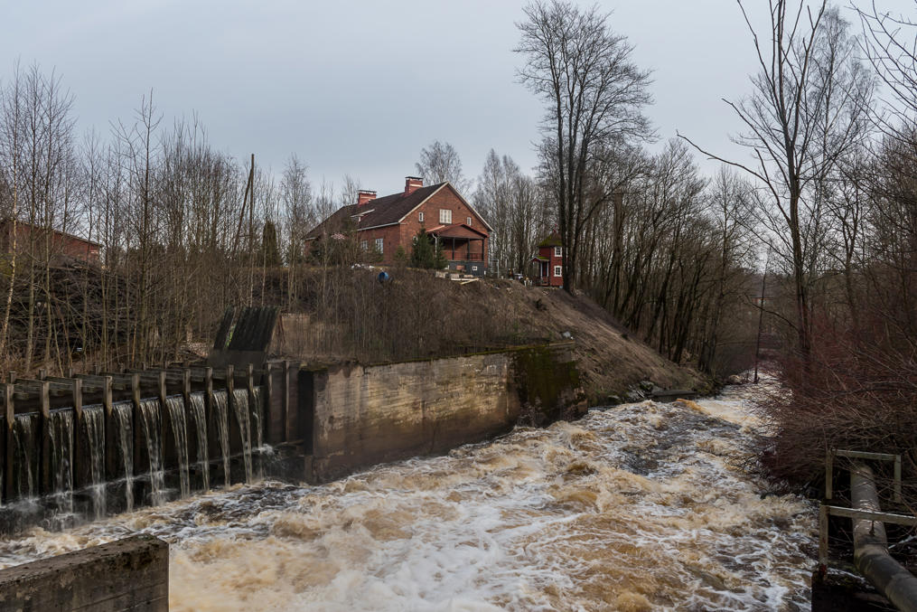 1. Территория старого завода расположена всего в полукилометре западнее центра Карккилы. На самом деле эта территория невелика, и здесь не так уж и много чего можно посмотреть. Самая очевидная достопримечательность — старая плотина на реке Карьяанйоки. На плотину можно зайти и постоять в считанных сантиметрах от бурлящего потока. Хотя сейчас, скорее всего, воды много из-за весенного паводка, и в большинство других времен года поток будет потише.