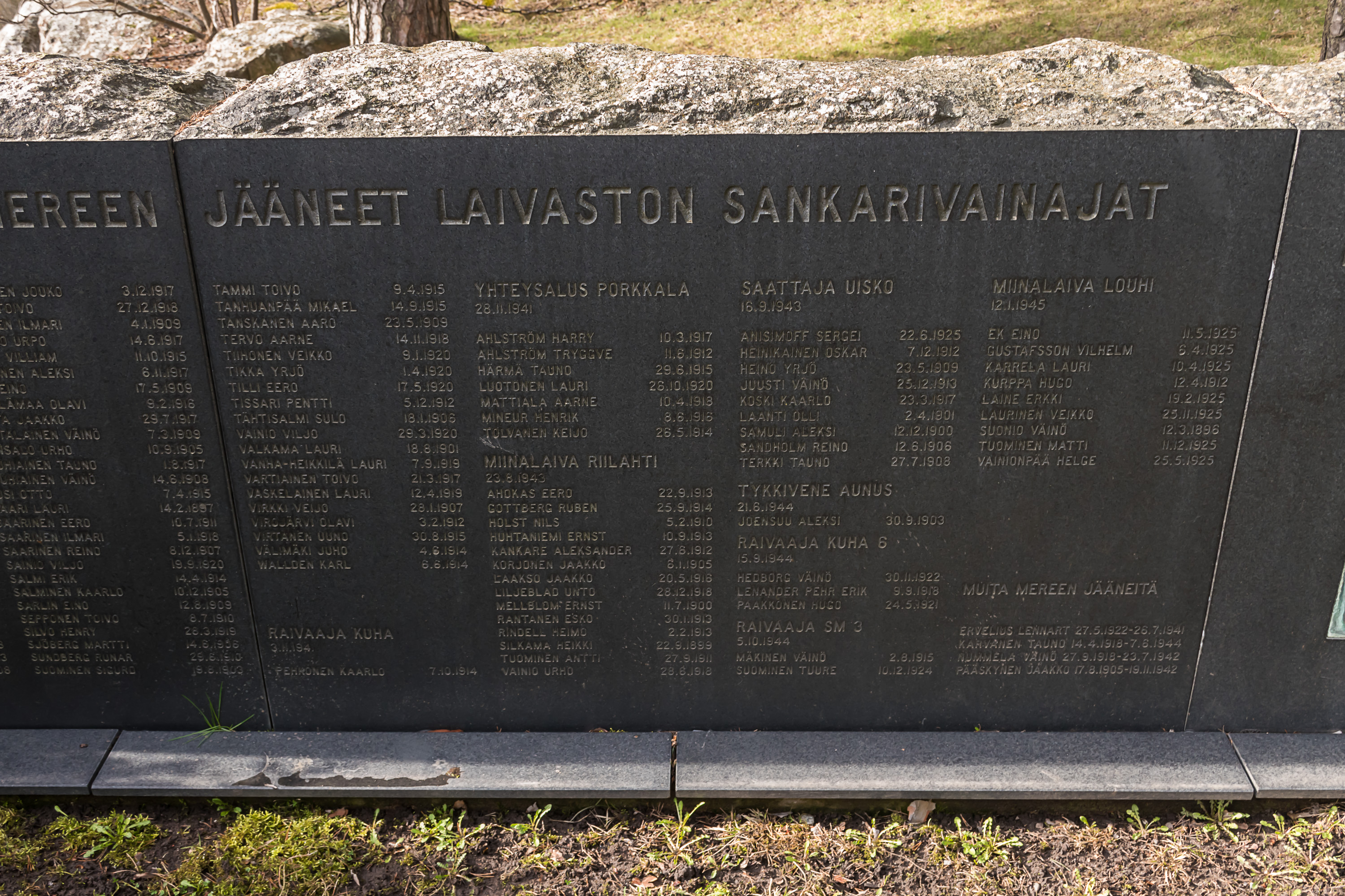 Согласно табличке невдалеке, 79 финских моряков погибло в Зимнюю войну 1939-1940, 638 — в Войну-Продолжение 1941-1944, и еще 28 при тралении мин после войны в 1945-1950. На памятнике перечислено 403 имени.
