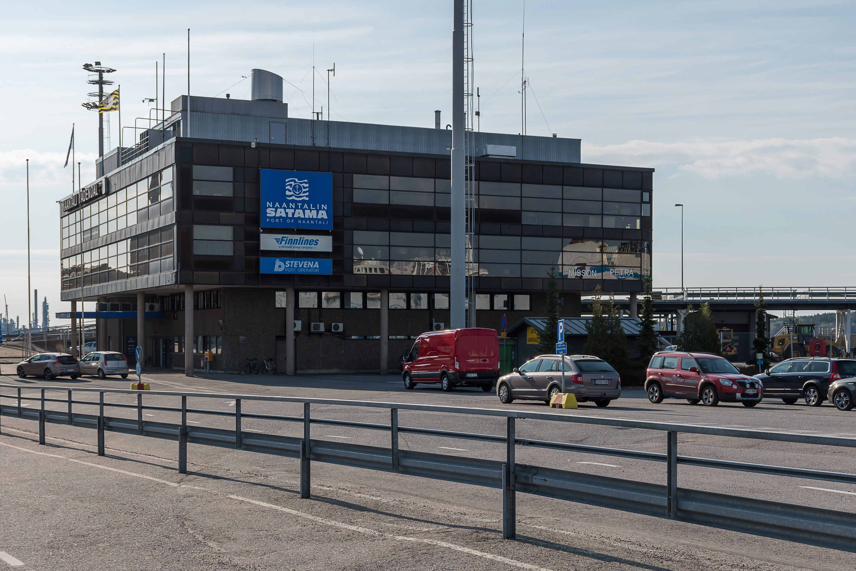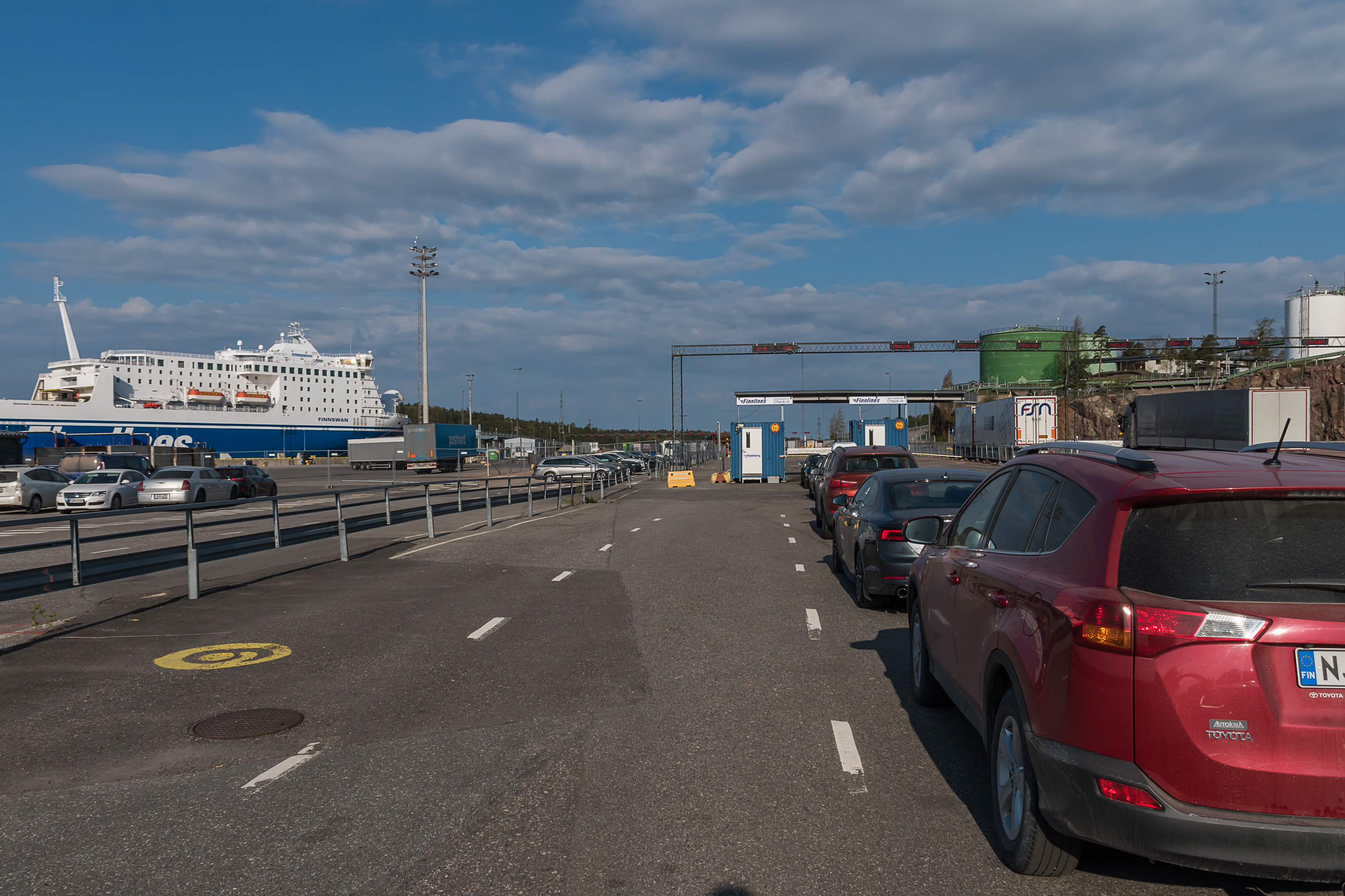 38. Ну и под конец переместимся почти на год в прошлое, в начало мая 2019. Я тогда грузился с машиной на ро-пакс-судно Finnswan ("Финнлебедь") в порту Наантали. Это очередь на регистрацию и довольно произаичного вида регистрационные будки.