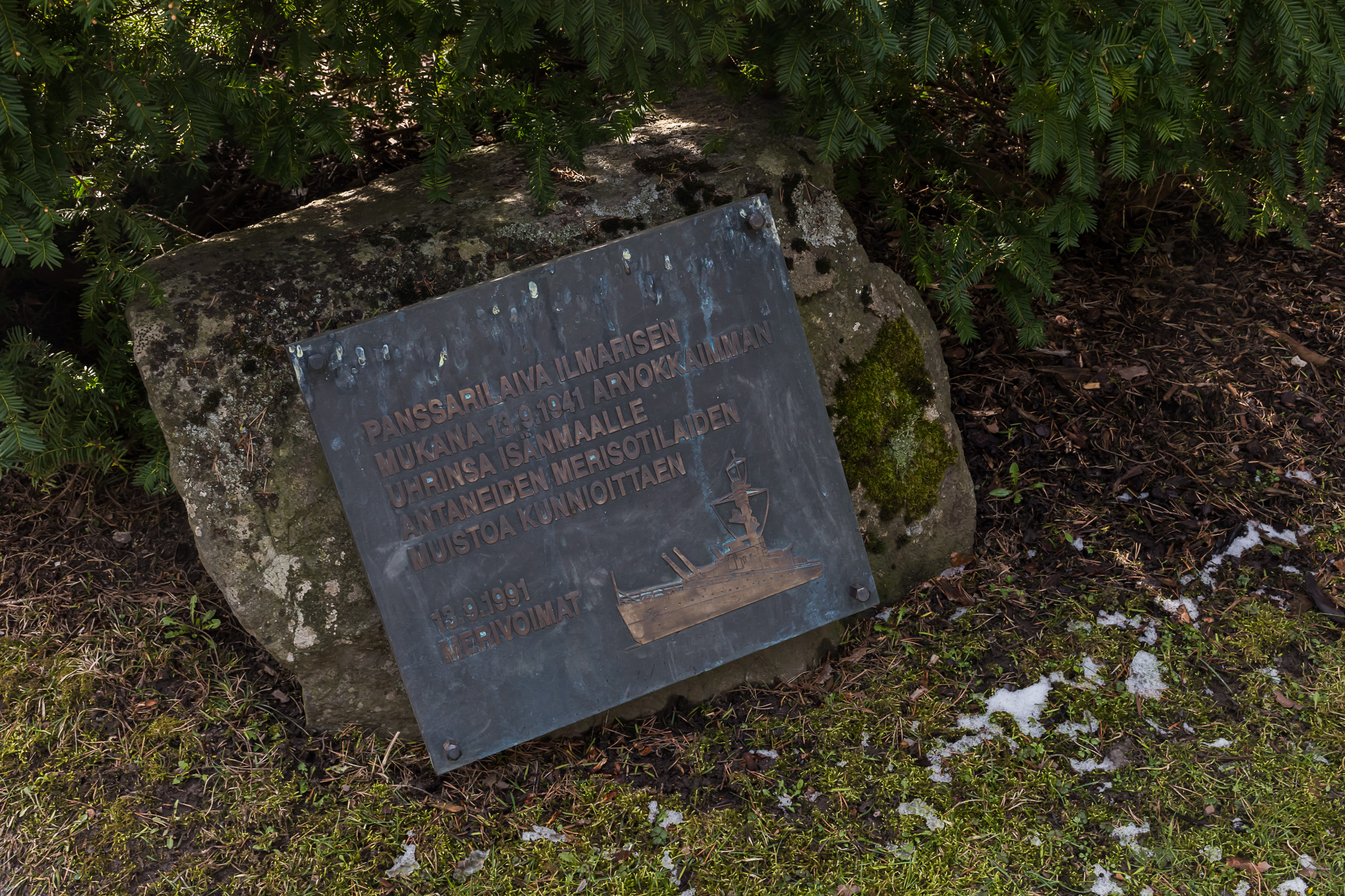 34. Отдельная табличка посвящана броненосцу "Ильмаринен" (Ilmarinen), самой большой морской потере Финляндии. "Ильмаринен", названный в честь легендарного кузнеца из эпоса "Калевала", был флагманом финского флота, хотя и довольно сильно устаревшим. Он был построен в 1927 году в Турку, имел длинну 93 м, водоизмещение 3900 т, и на момент гибели 13.9.1941 на его борту находилось 403 человека. "Ильмаринен" с другими судами должен был участвовать в совместной немецко-финской операции "Нордвинд", которая была не более чем отвлекающим маневром. Группа "Нордвинд" должна была с запада обстрелять и высадить десант на стратегически важные эстонские острова Сааремаа и Хийумаа, занятые советским гарнизоном — в то время, как настоящий удар на эти острова, операция "Беовульф", планировался немцами с востока. Однако вскоре после того, как группа "Нордвинд" покинула Турку и вышла из архипелагов в открытое море, в 24 милях к юго-западу от острова Утё "Ильмаринен" подорвался на мине. Корабль получил катастрофические повреждения и затонул за считанные минуты. С ним погиб 271 человек; остальных сумели спасти другие суда группы "Нордвинд", вынужденной вернуться обратно. Операция была сорвана, что, впрочем, в итоге совершенно не помешало немцам таки высадиться на Сааремаа и Хийумаа и благополучно занять острова, уничтожив или взяв в плен большую часть советского гарнизона. Чья именно мина уничтожила "Ильмаринен", так и остается загадкой — могла быть как советская, так и оказавшаяся в этом месте по ошибке немецкая или финская.