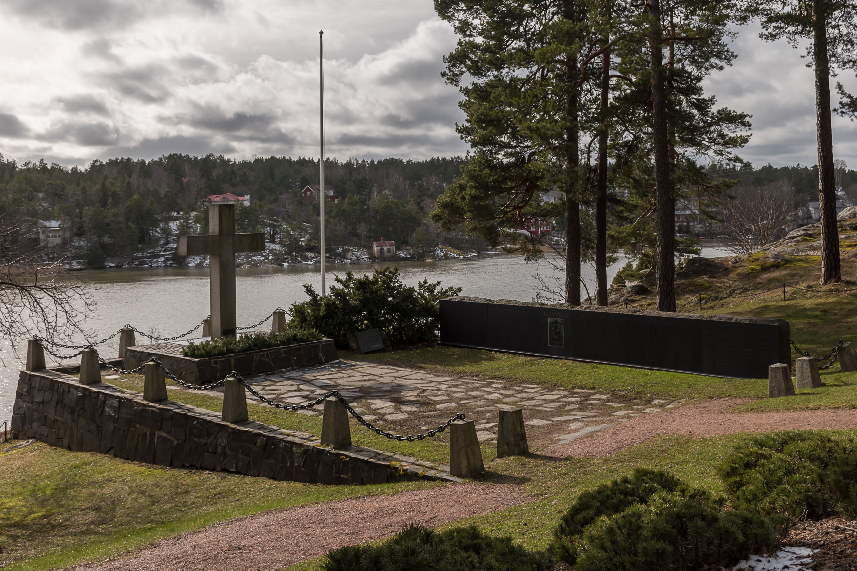 35. Другую мемориальную табличку можно заметить на берегу ниже креста. Она посвящена военно-морской базе, действовавшей в Наантали в военные годы.