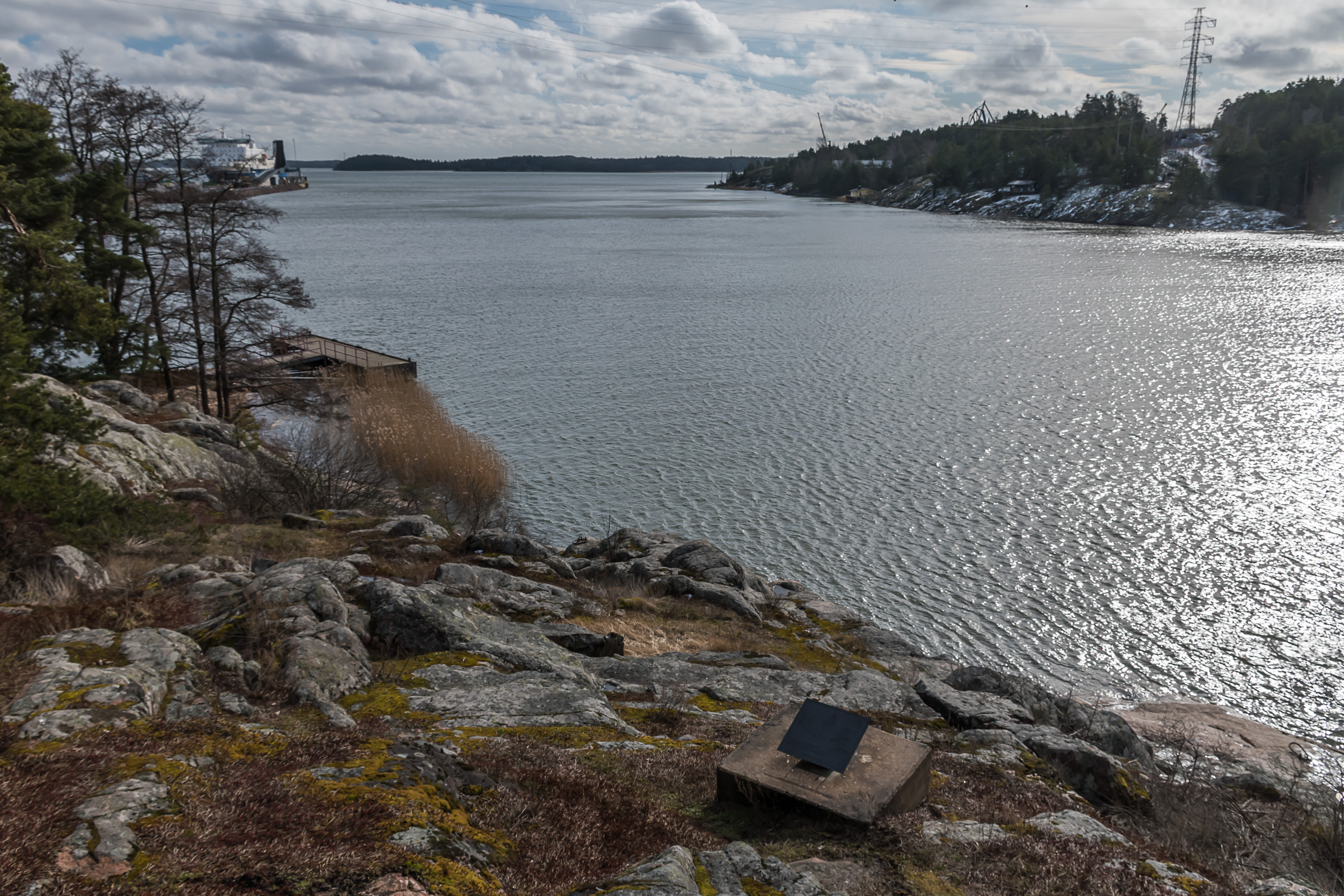 32. Вернувшись с моста на холм Купаривуори и спустившись с него на южной стороне, мы видим стоящий над морским проливом крест. Это памятник потерям финского флота в войнах 1939-1945. На этом месте несколько раз в войну и после войны отпевали моряков, не вернувшихся из моря.