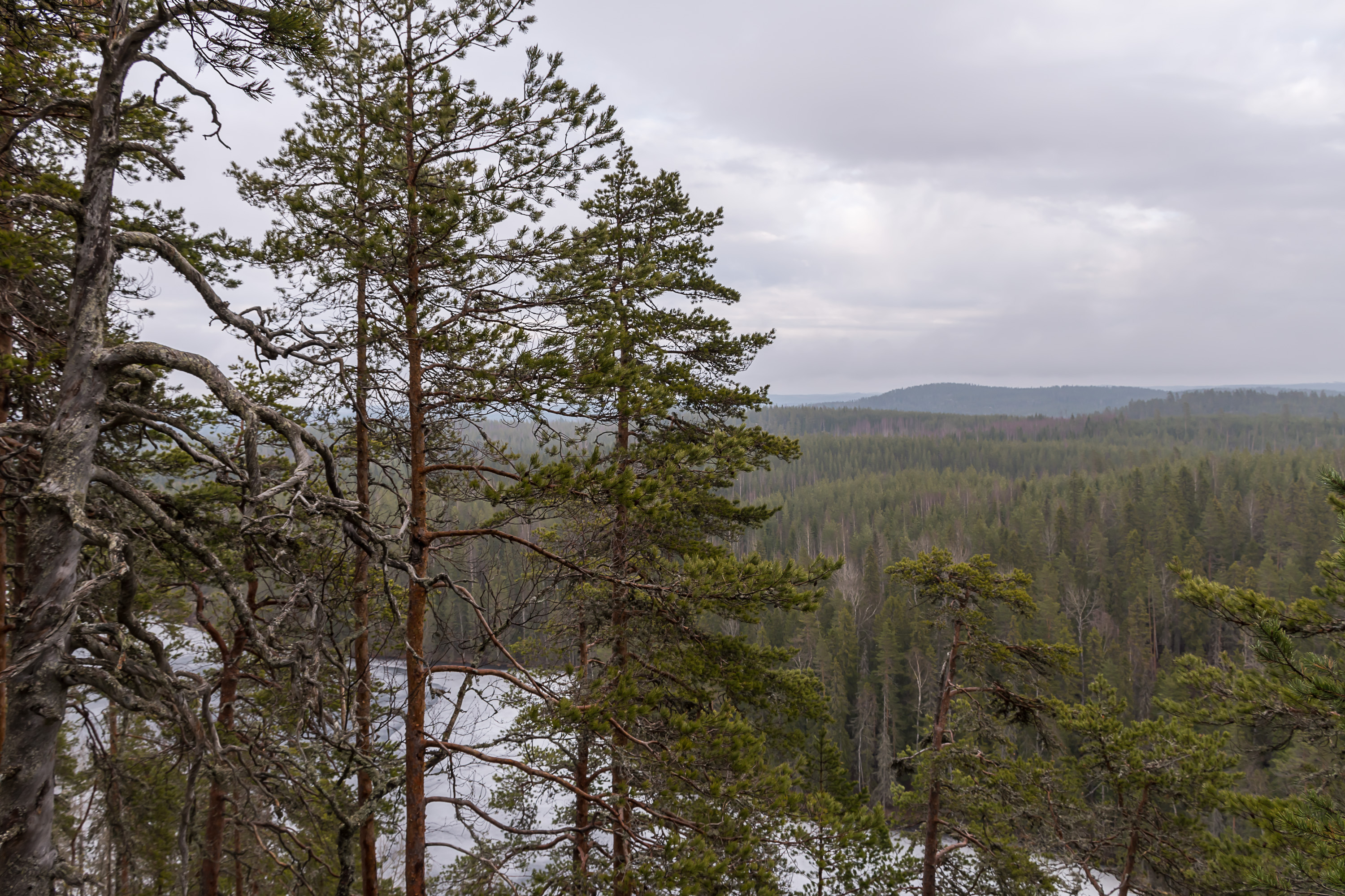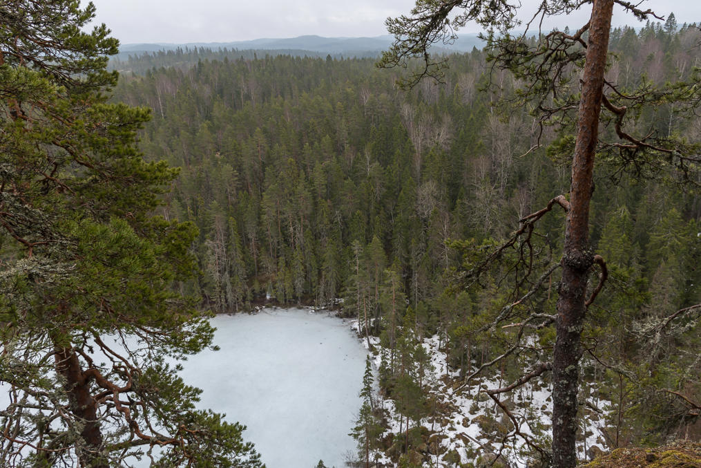 32. А дальше тропа уходит от берега насовсем, но взглянуть на озеро в последний раз все-таки можно; тропа забирается до смотровой площадки (ну как площадка, просто место над обрывом, где деревья обзору почти не мешают) на склонах холма Лоуккувуори. Собственно площадка находтся чуть в стороне от нашей длнной тропы Kolmen Vuoren Vaellus, но всего в 200 м, да и к тому времени все равно уже почти до нужной высоты тропа и доходит; так что нет причины не зайти в это место, и оно того определенно стоит.