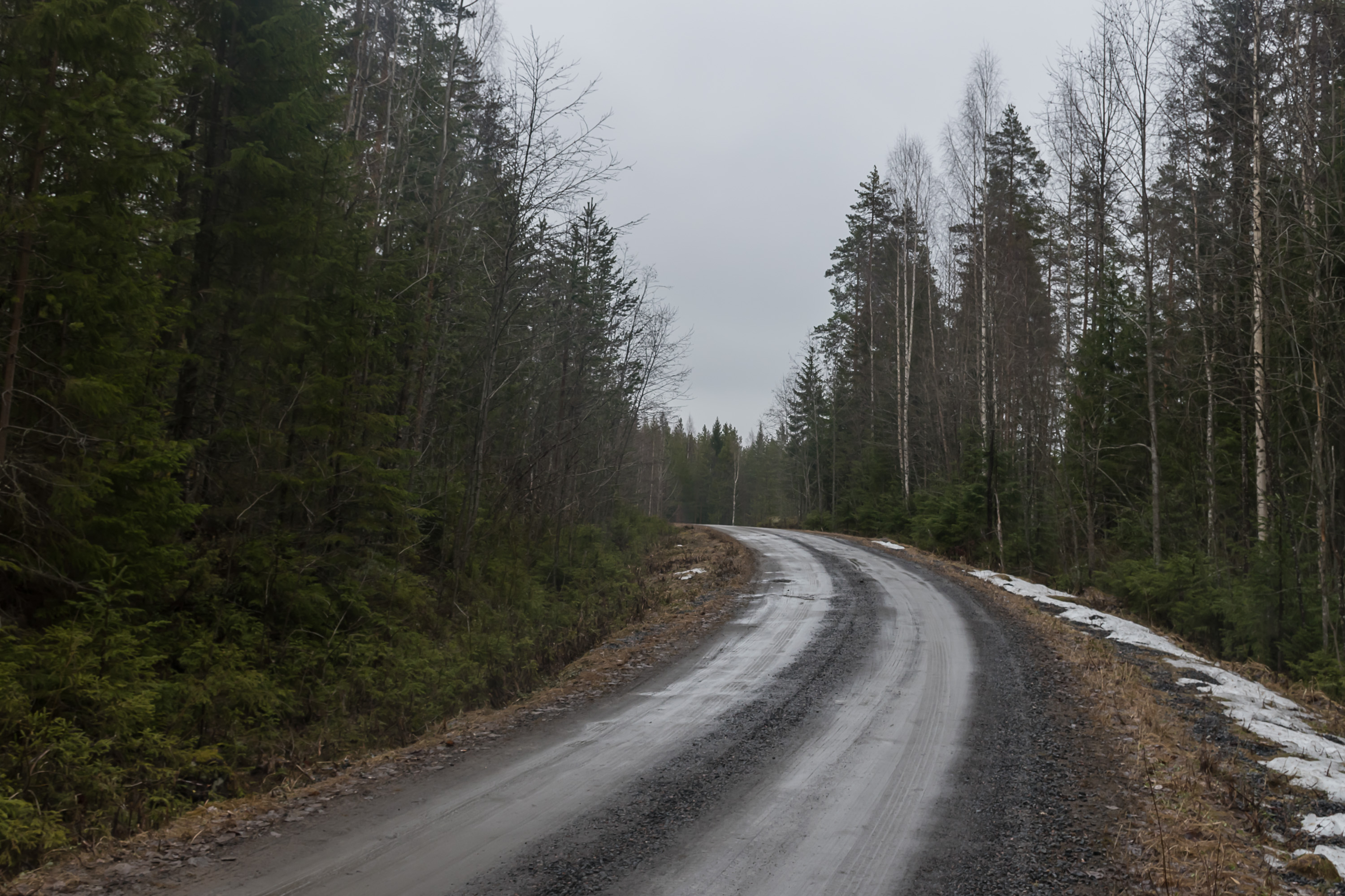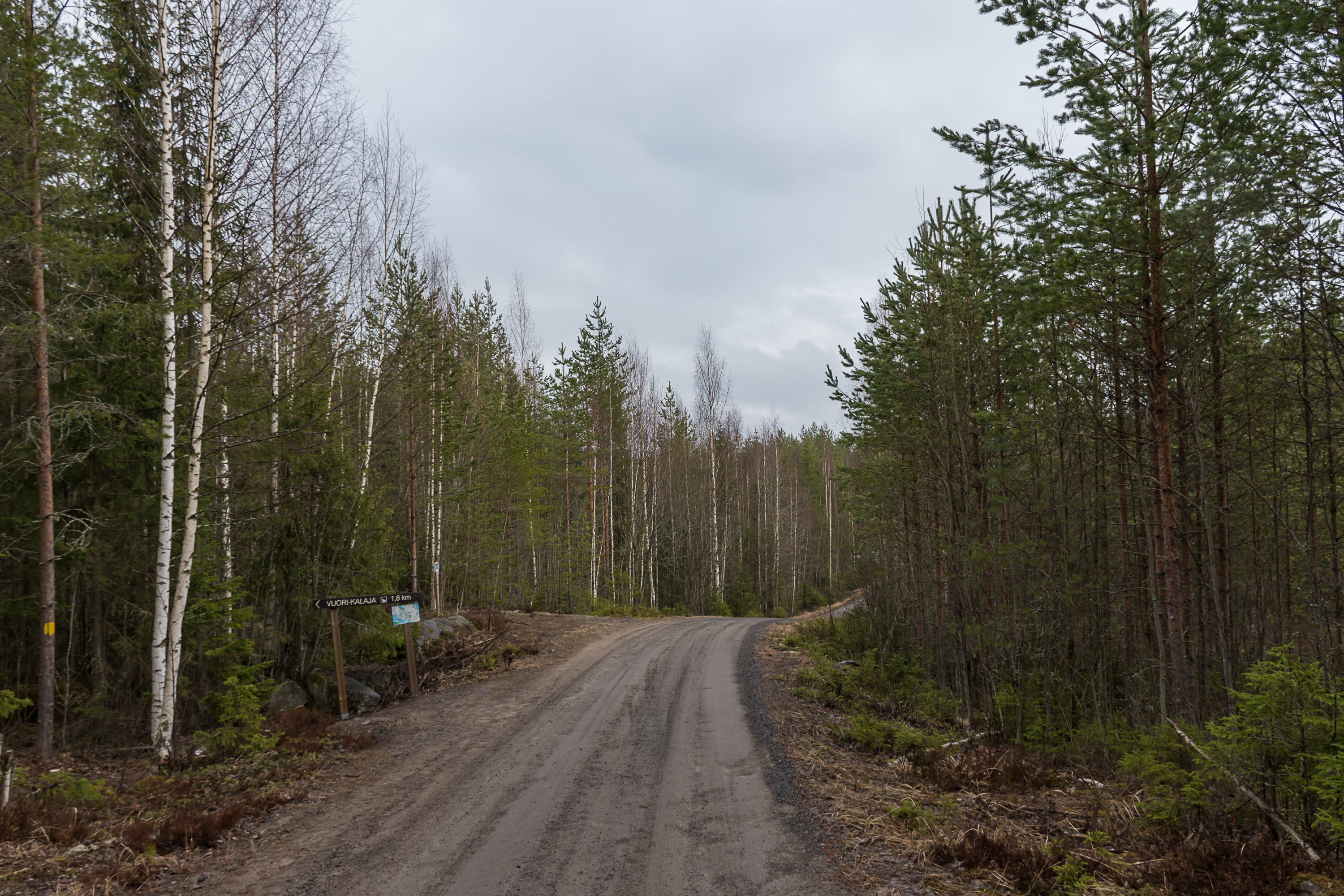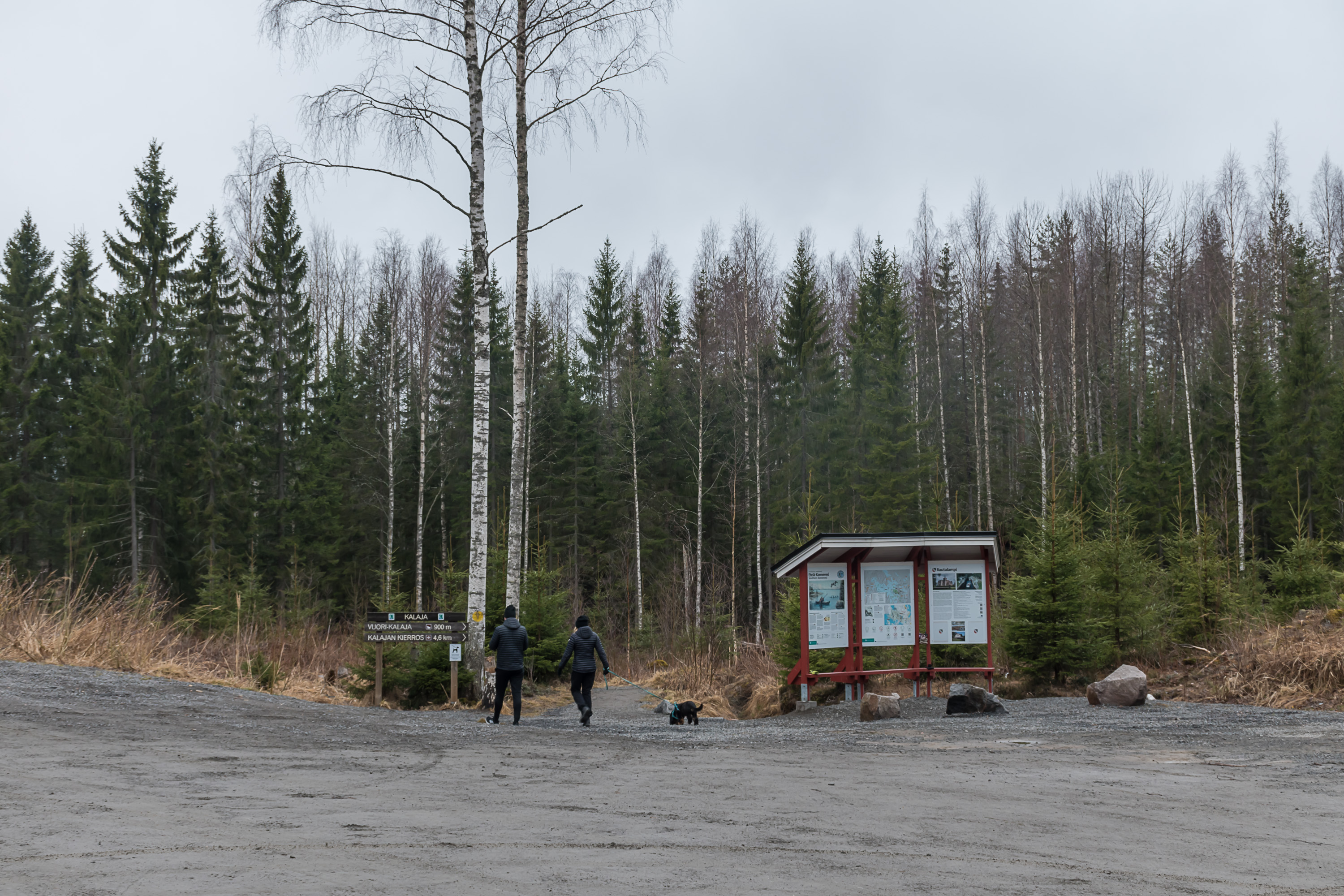 Тропы начинаются со стоянки, под названием Калайя (Kalaja), по адресу Törmälän metsätie 136, Rautalampi. Ведущая к стоянке узкая гравийная лесная дорога длиной 1.5 км (Törmälän metsätie, фин. Тёрмяльская лесная дорога) зимой не чистится. Я из-за этого немного беспокоился; на тот момент в этой части Финляндии еще чуть-чуть снега в самых темных местах оставалось, а шины у меня уже были летние, форсировать крупный участок тающего снега или льда могло бы быть чревато. Но в итоге таких участков не было и мы без проблем доехали до стоянки. Альтернативой было бы оставить машину на другой стоянке, у начала этой лесной дороги (адрес Konnekoskentie 552, Rautalampi), у некоего учебного центра Тёрмяля (Törmälä), чем бы он там не был; до него можно доехать по дороге хоть и тоже гравийной, но широкой и с полноценным зимним обслуживанием. Но, конечно, это прибавило бы еще 3 км (полтора туда, полтора обратно) к и без того длинному походу.