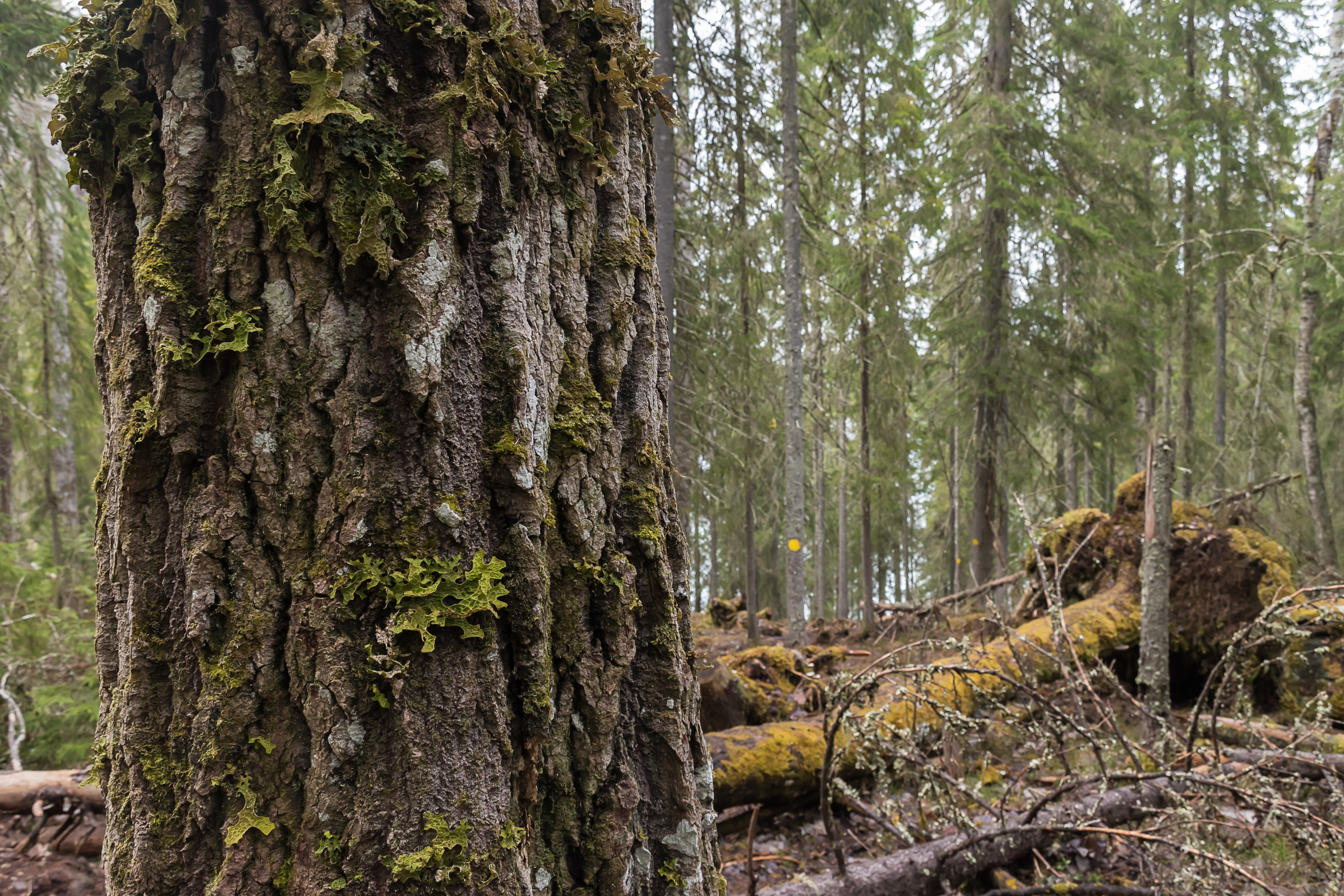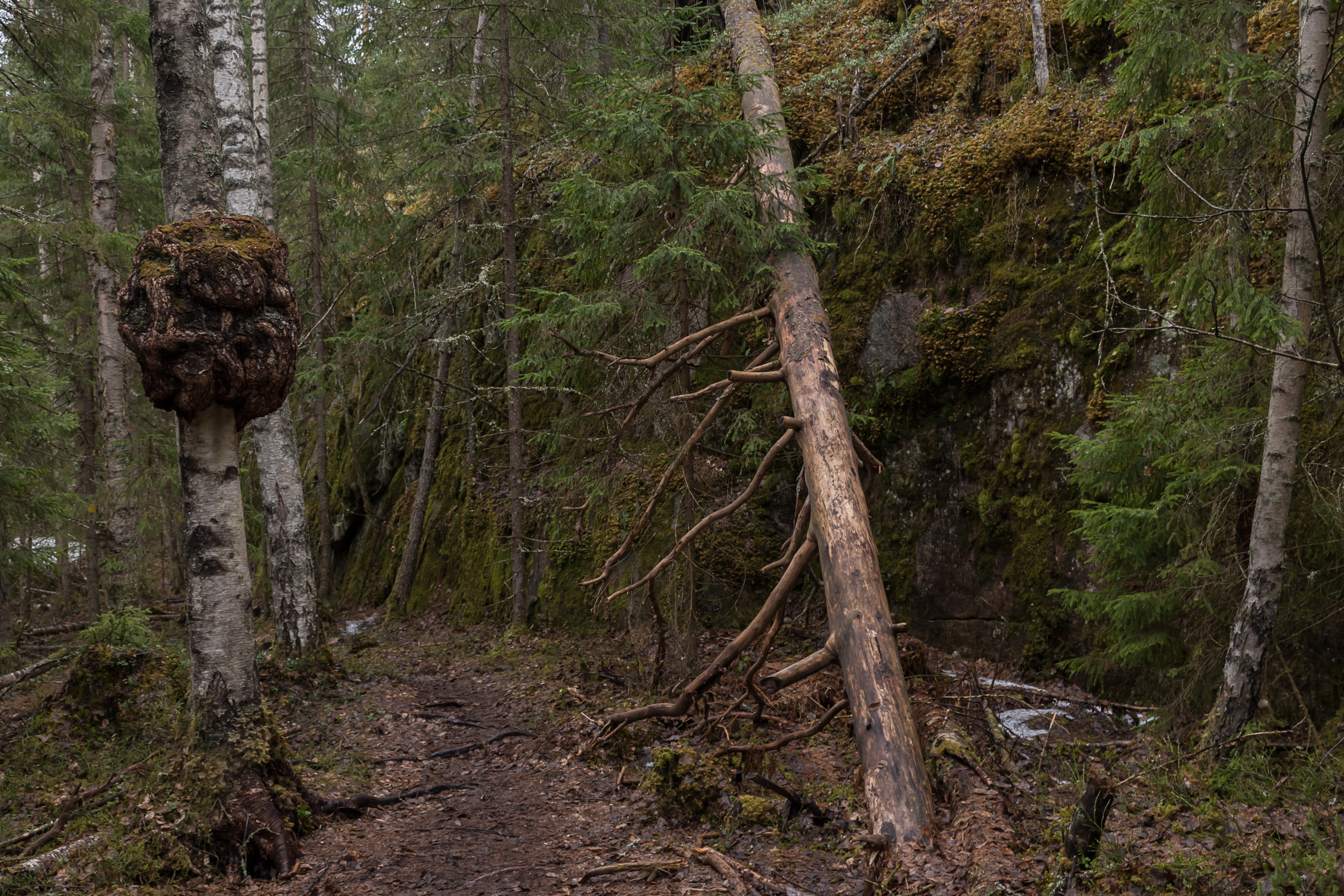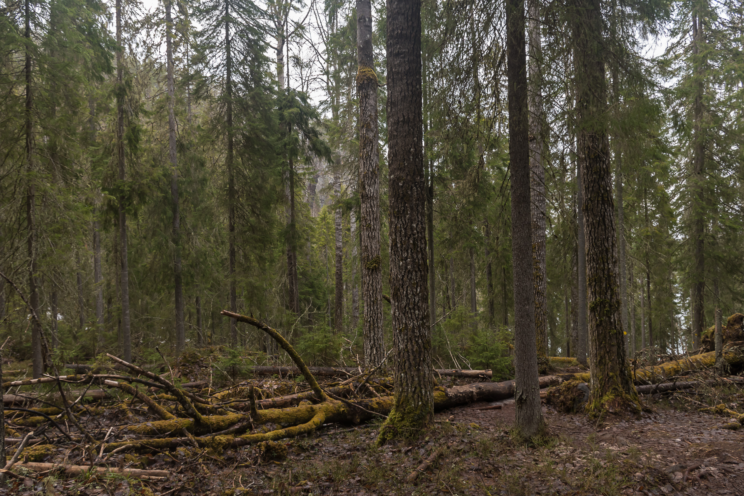9. Национальный парк пересекают несколько гравийных дорог, и вдоль одной из них тропа даже идет какое-то расстояние. Дороги напоминают о том, что охраняемый статус у этой территории появился достаточно недавно, и на ней поддерживались лесовозные дороги, как и в большинстве финских лесов. Но фактически никаких вырубок на территории Южного Конневеси не было много десятилетий (последний раз в некоторых местах в 1960-х, если правильно помню), и лес здесь местами старый, хотя и не девственный. Крупный шторм Аста в 2010 году существенно повредил лес; поваленные им деревья тоже так и остаются там, где упали, гнить в естественных условиях.