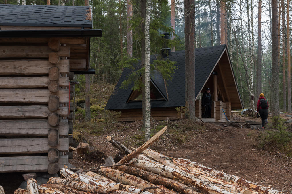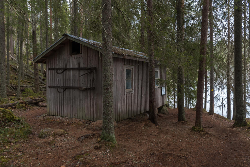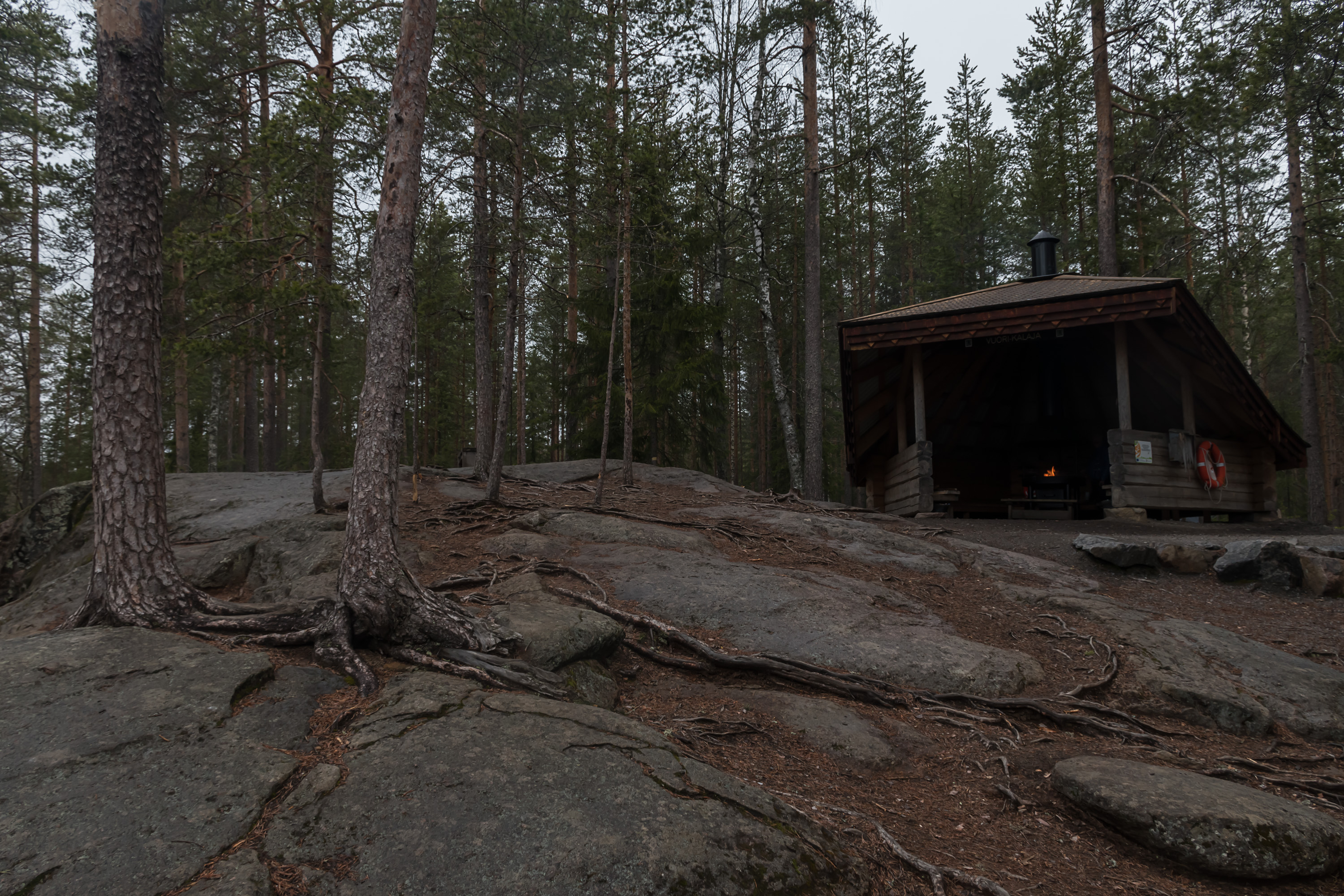 4. Вуори-Калайя — навес-лааву и место для костра на берегу маленького (около 600x250 м) озера под названием, собственно, Вуори-Калайя (Vuori-Kalaja, фин. Горная Калайя; что такое "kalaja", я не знаю; "kala" значит "рыба", а "-ja" — суффикс деятеля или профессии, но "рыбак" будет "kalastaja", а не "kalaja"). До этого лааву могут добраться на самом деле даже инвалиды, для них есть специальная отдельная автостоянка у другой лесной дороги, от которой до лааву рукой подать по широким ровным дорожкам и деревянным гатям.