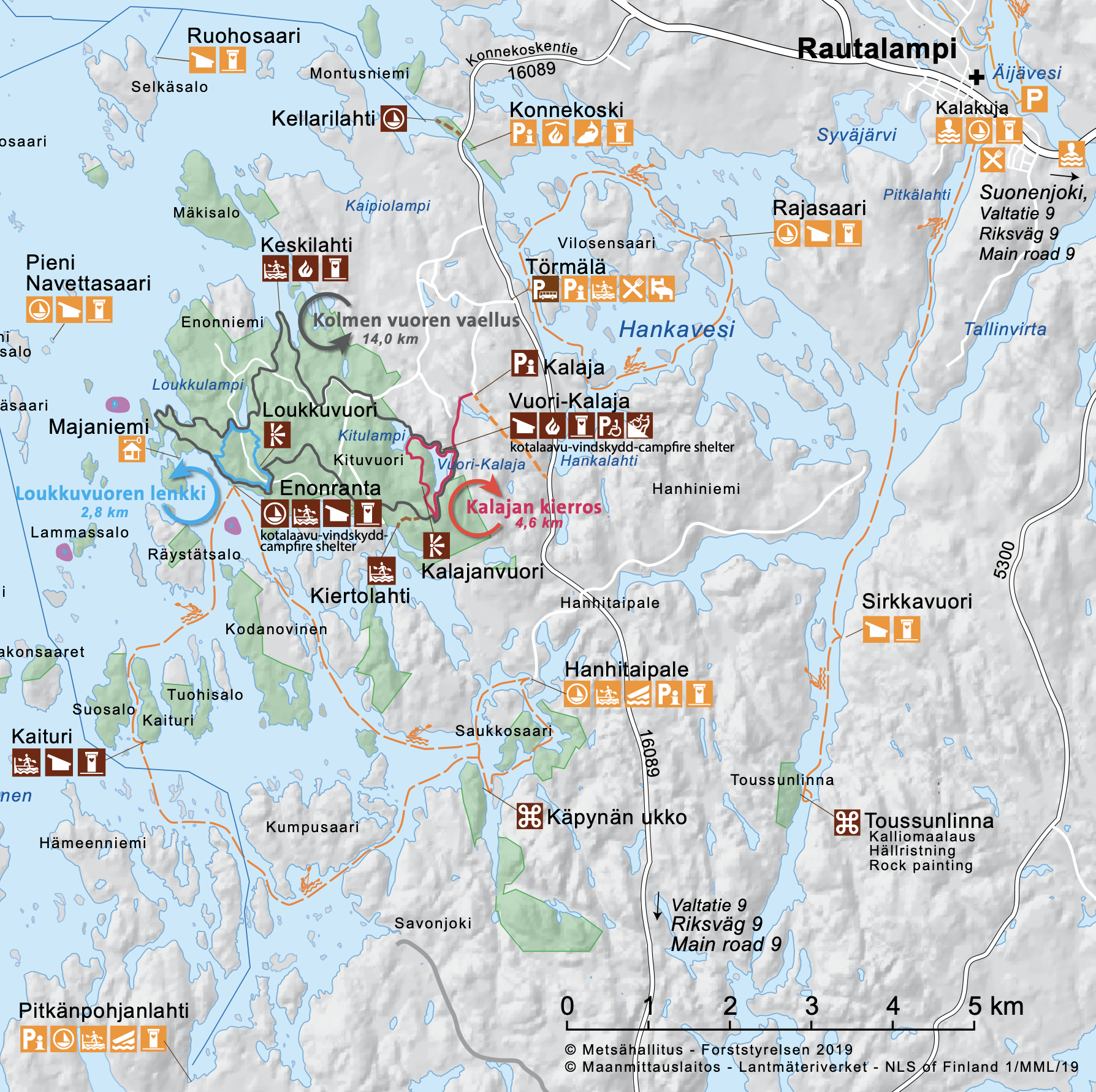 Некоторые достопримечательности национального парка (пороги Коннекоски, наскальные рисунки Тоуссунлинна, скала Кяпюнян-Укко в форме человеческого лица) не находятся ни у каких троп. Пороги видны по дороге к национальному парку от Рауталампи, прямо у моста, у которого можно встать; а другие два места можно увидеть только с воды на лодке.