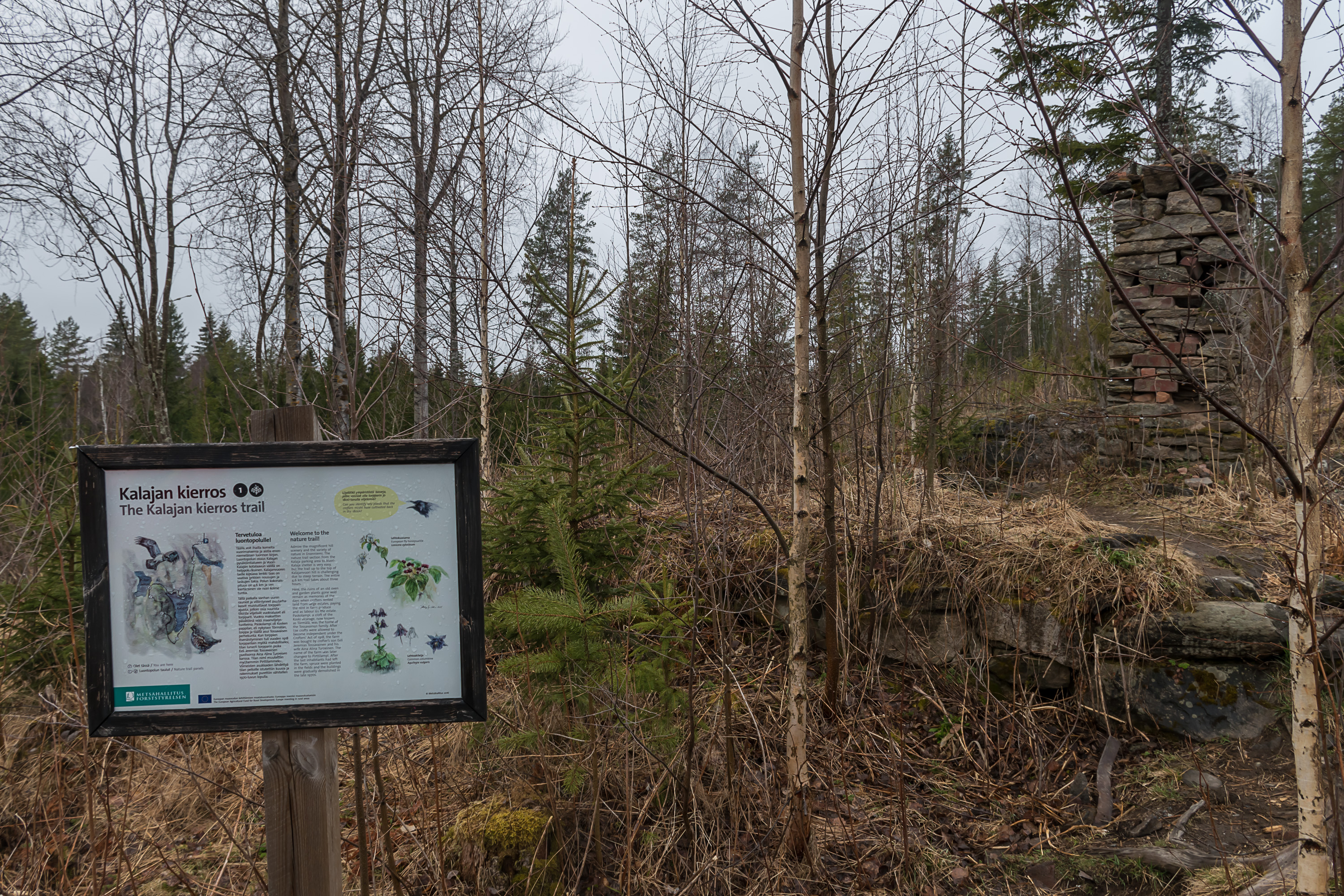 2. Первая часть тропы, до лааву Вуори-Калайя — самая простая, по широкой и в основном отсыпанной гравией дорожке. Дорожка идет мимо озерца под названием Пасколампи (Paskolampi), что буквально означает "дерьмовый пруд" (и я могу заверить, что в Финляндии очень много мест, называющихся подобным образом) и этих развалин, которые, как говорит нам информационный щит, были раньше домиком торпаря (безземельного крестьянина, обрабатывающего арендованную землю).
