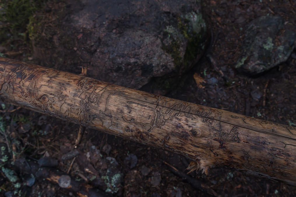 41. Поваленное дерево без коры, где можно поразглядывать узоры, выточенные на нем древоточцами.