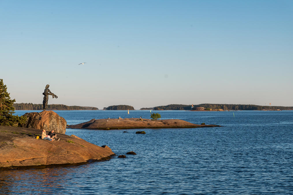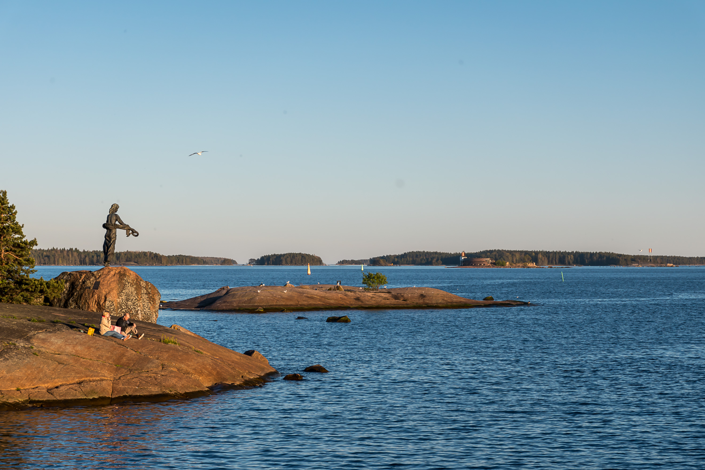 3. Остров Куусинен, помимо гавани, занят в основном небольшим лесом. Народ в хорошую погоду любит здесь культурно проводить время на прибрежных скалах. Памятник на фото посвящен морякам, погибшим в Роченсальмских сражениях. Эти сражения произшли в Войну Густава III, предпоследнюю русско-шведскую войну 1788-1790 годов, когда шведский король Густав III попытался затеять "маленькую победоносную войну", чтобы поднять собственную популярность, отвоевав часть финских земель, потерянных в Великую Северную войну и войну 1741-1743. На деле вышло все иначе, ничего у него не получилось, а вскоре после войны короля убили заговорщики. Два морских сражения произошли в Руотсинсалми (Ruotsinsalmi, фин. Шведскй залив), или, по-шведски, в Свенсксунде (Svensksund), области моря, отделяющей современную Котку от острова Куутсало. В первом сражении Швеция проиграла, а вот во втором вдруг наголову разбила российский флот. Это переломило ход войны и позволило Швеции заключить мир с Россией, по крайней мере, без дальнейших территориальных потерь (России на тот момент эта война была вообще неинтересна).