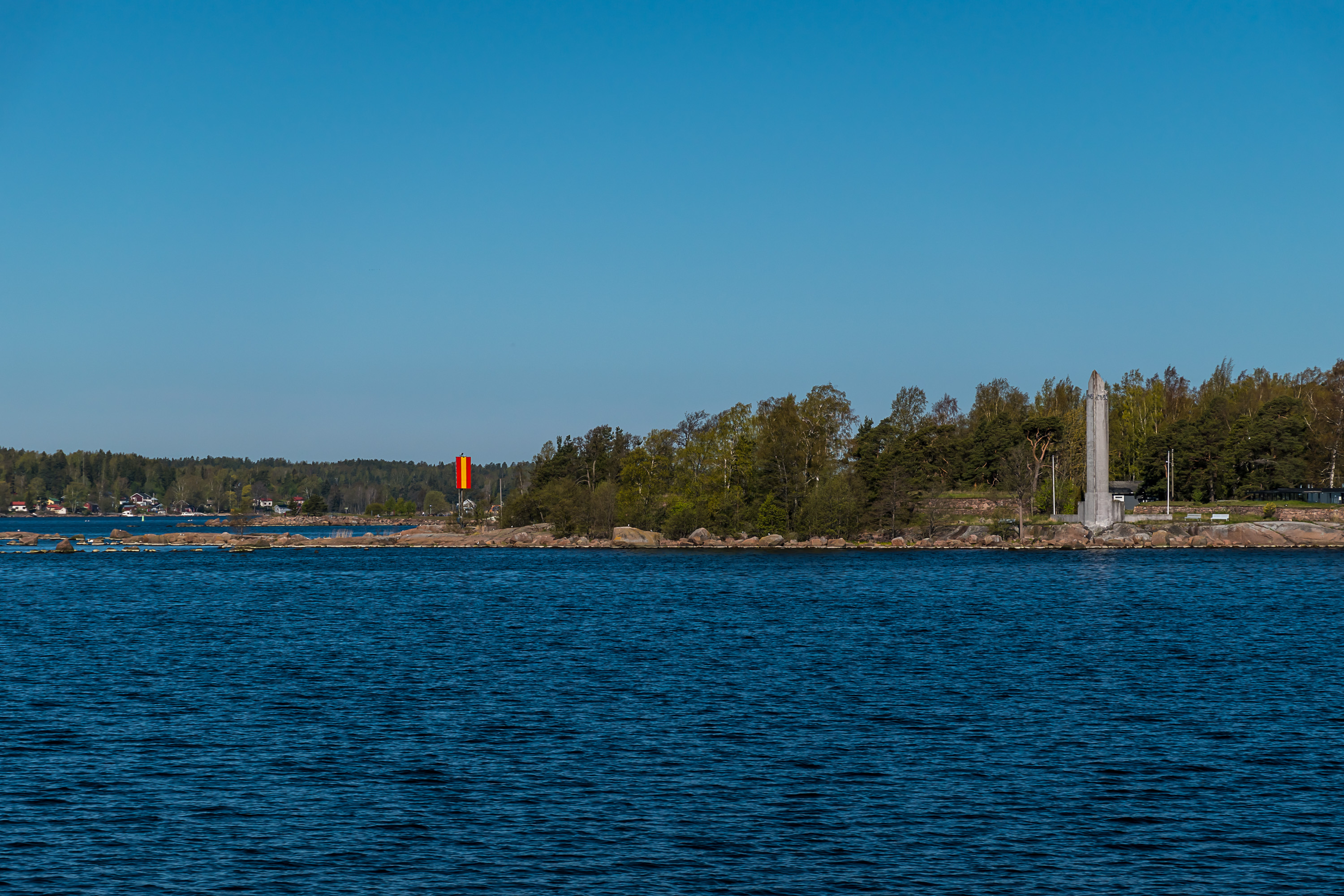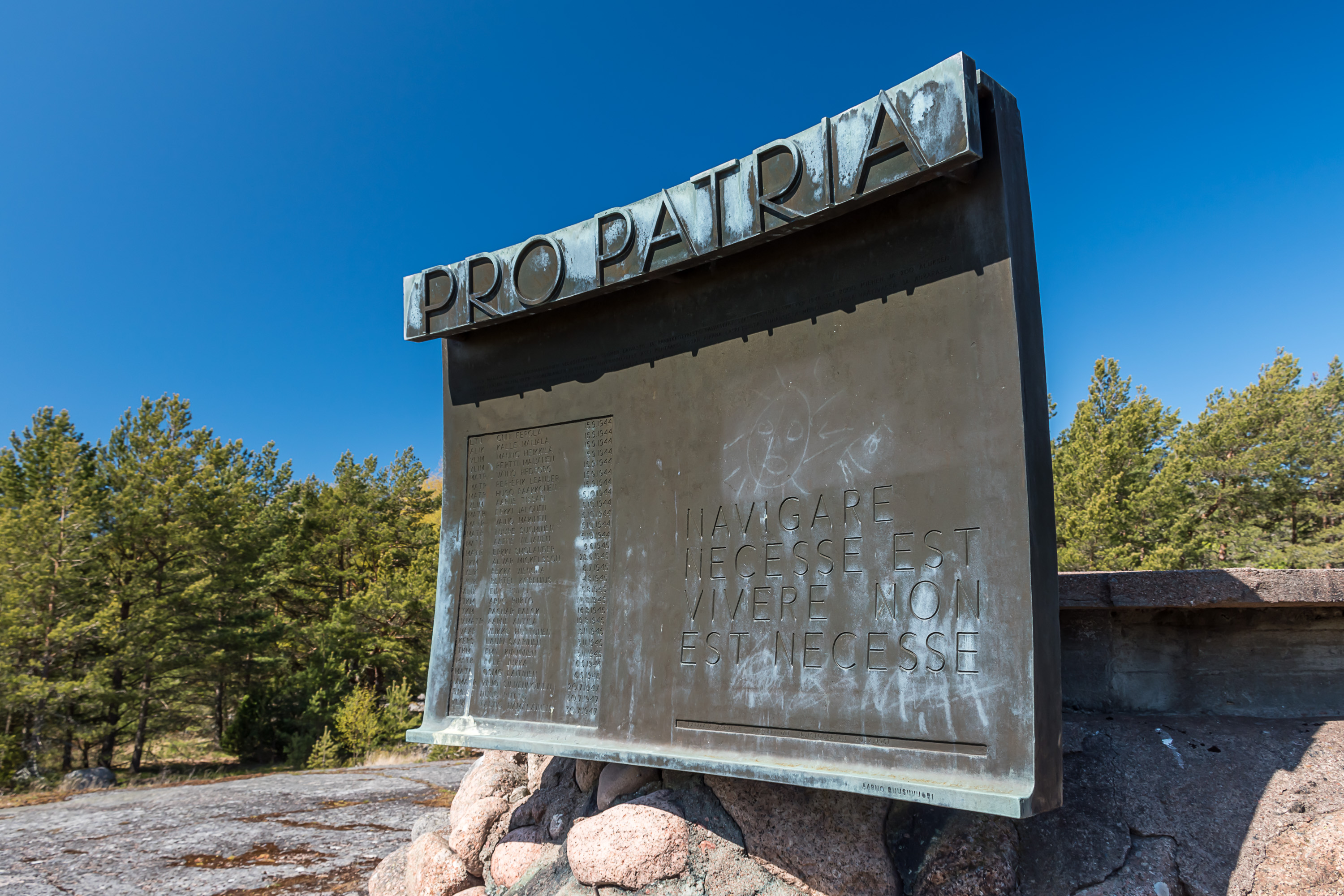 25. Единственный памятник на Хаапасари установлен на одной из этих артиллерийских позиций. Он посвящен морякам, погибшим при тралении минных заграждений после войны. Насколько я понимаю, это памятник таким морякам в целом, с самим Хаапасаари он особо не связан — не так уж и много людей погибло в этих операциях. Латинская фраза navigare necesse est, vivere non est necesse означает "плыть необходимо, а жить нет" и приписывается Помпею, который вроде бы как сказал это, отправляясь на судне с очень нужным грузом продовольствия из Африки в Рим в жестокий шторм.