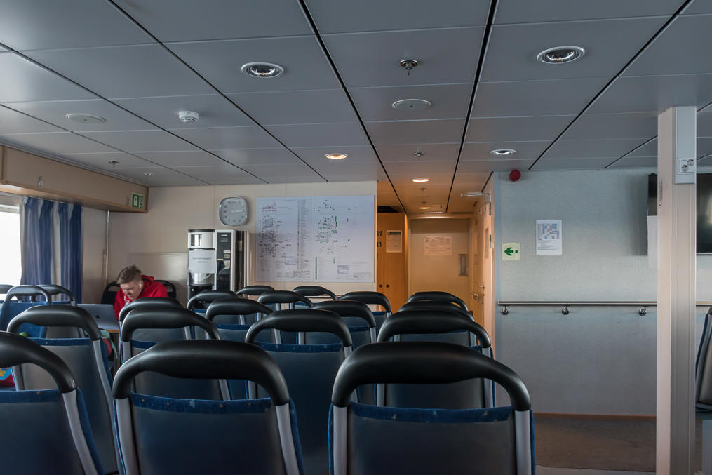 6. Пассажирский салон "Отавы". Можно сидеть и снаружи на одной из двух палуб. Погода была очень теплая и почти безветренная, так что большую часть поездки я именно так и делал. Никаких других пассажиров, выглядящих явными туристами, я не увидел. В основном пассажиры были на вид лет от 50 и больше, хотя многие и со внуками тоже.
