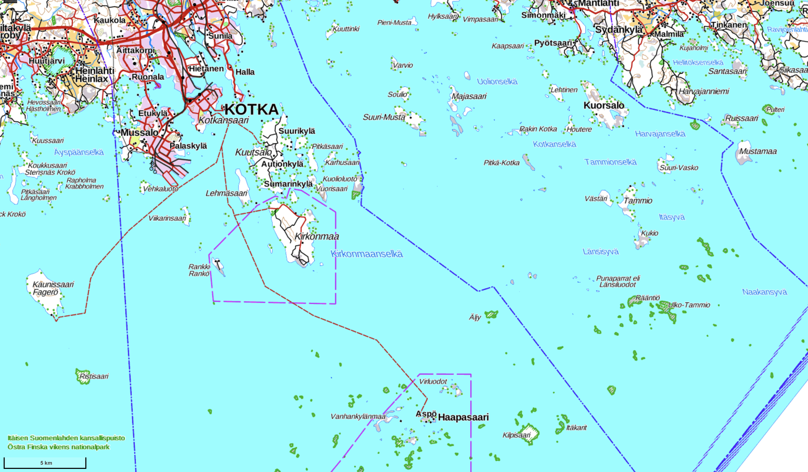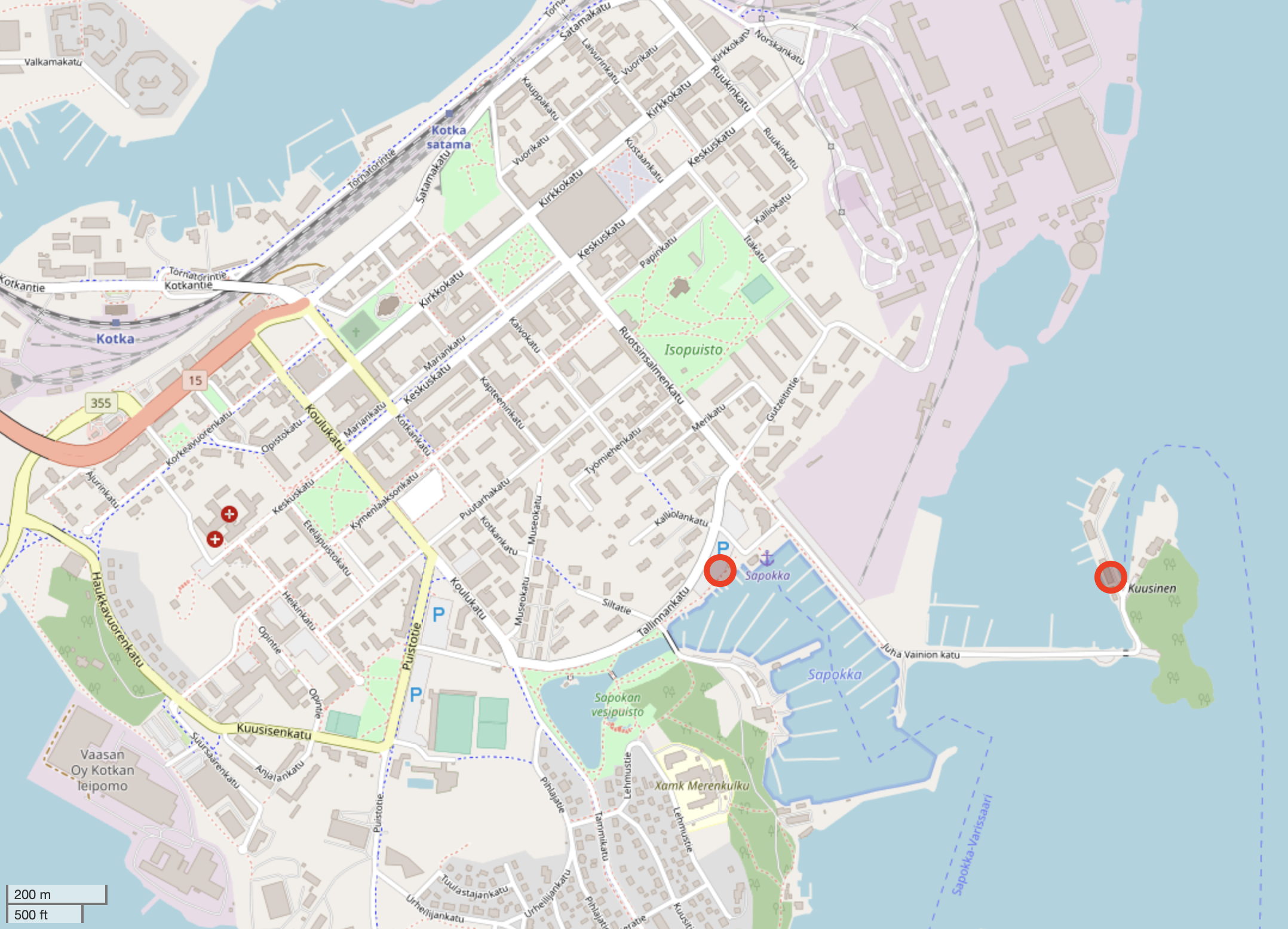 Теплоходы в Котке отправляются из небольшой гавани на острове Куусинен (Kuusinen, фин. Елочка). Это совершенно неочевидное место, и даже знаки Saaristoliikenne (фин. архипелаговое движение) показывают на неправильное место, на гавань Сапокка (Sapokka) рядом с центром Котки, куда более заметную, где рядом располагается известный парк Сапокка и океанариум "Маретариум". Правильная гавань находится в конце улицы Juha Vainion katu, начинающейся тоже в Сапокка и идущей на Куусинен по дамбе. Эта гавань используется также рыболовецкими и пограничными судами, и судами для обслуживания фарватера.