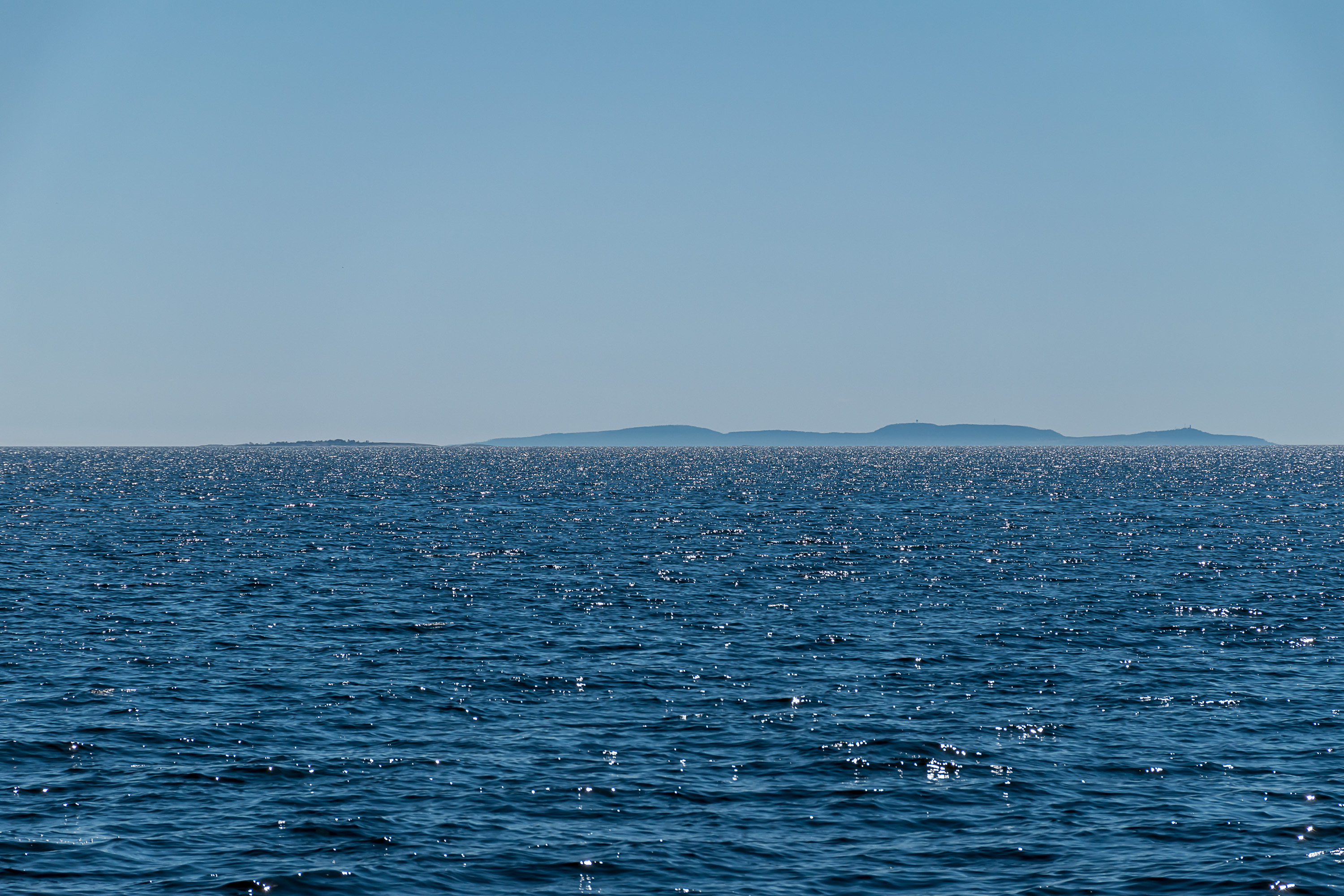 15. Этот силуэт на горизонте меня озадачил еще накануне, когда я увидел его с берегов Котки. Я был уверен, что на Финском заливе не может быть гор, которые могли были бы видны издалека в такой дымке. Я решил, что это, наверное, какое-то странное облако на горизонте. Но на следующий день "облако" не только никуда не делось, но я даже начал различать на вершинах гор какие-то постройки.