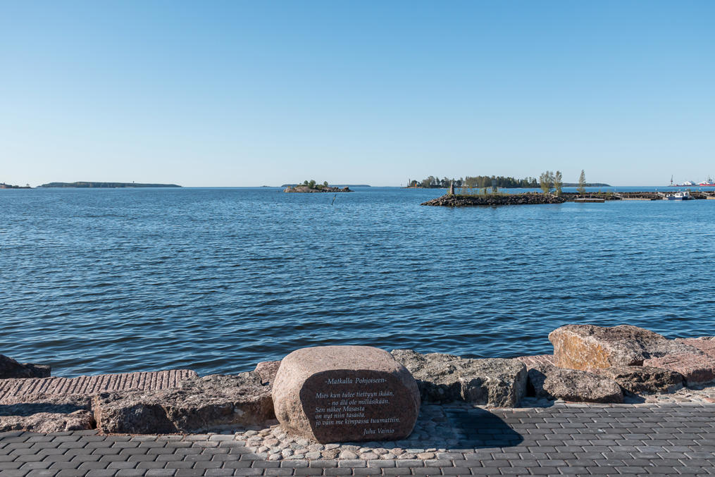 2. Дорога от Сапокки до Куусинена называтся Juha Vainion katu в честь, собственно, Юхи Вайнио (Juha Vainio, 1938-1990), выдающегося финского певца и поэта-песенника, который родился в Котке, любил море, и Котку с морем часто в песнях поминал. Вдоль этой улицы Юхи Вайнио расставлены камни с цитатами из его песен. Эта песня называется "По пути на север" (Matkalla pohjoiseen), и я подумал, что там что-то пафосное, но, если я правильно понимаю текст, который можно найти онлайн, тут поется просто про мужика, отчаянно едущего по "кривой Кааманенской дороге" на Нуоргам (крайнюю северную деревню финской Лапландии на норвежской границе), чтобы там у кого-то купить какое-то средство для лечения импотенции. Как видите, по крайней мере некоторые песни Юхи Вайнио не были особо серьезными.