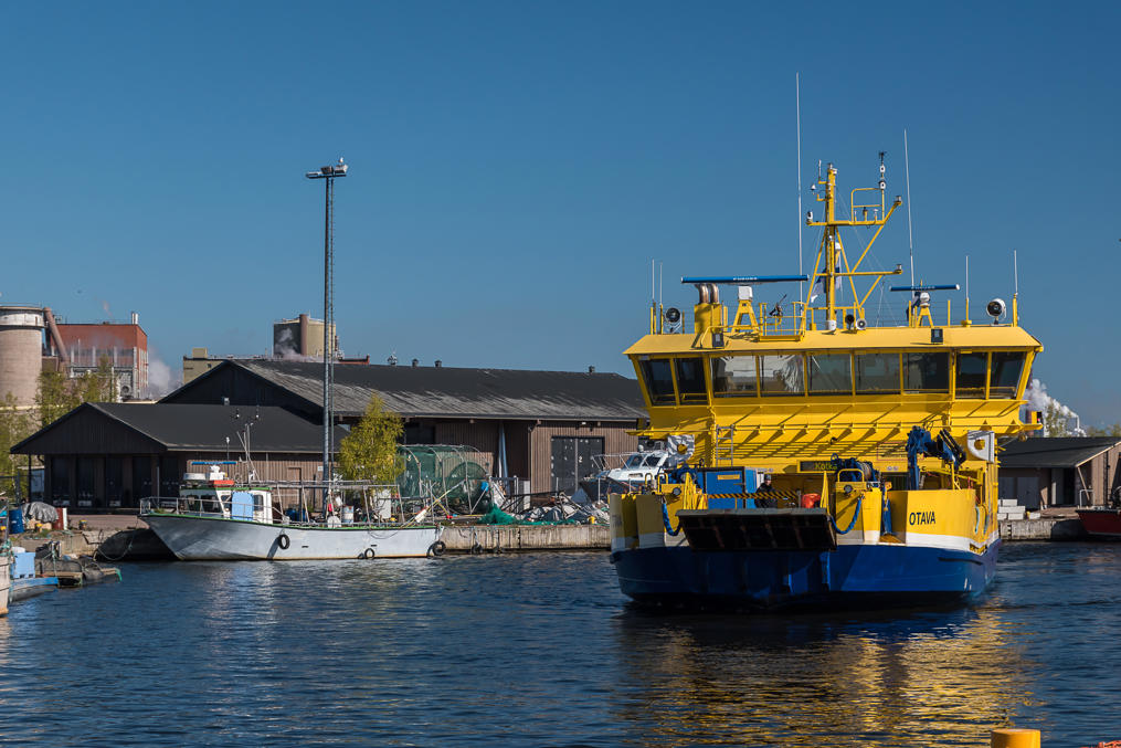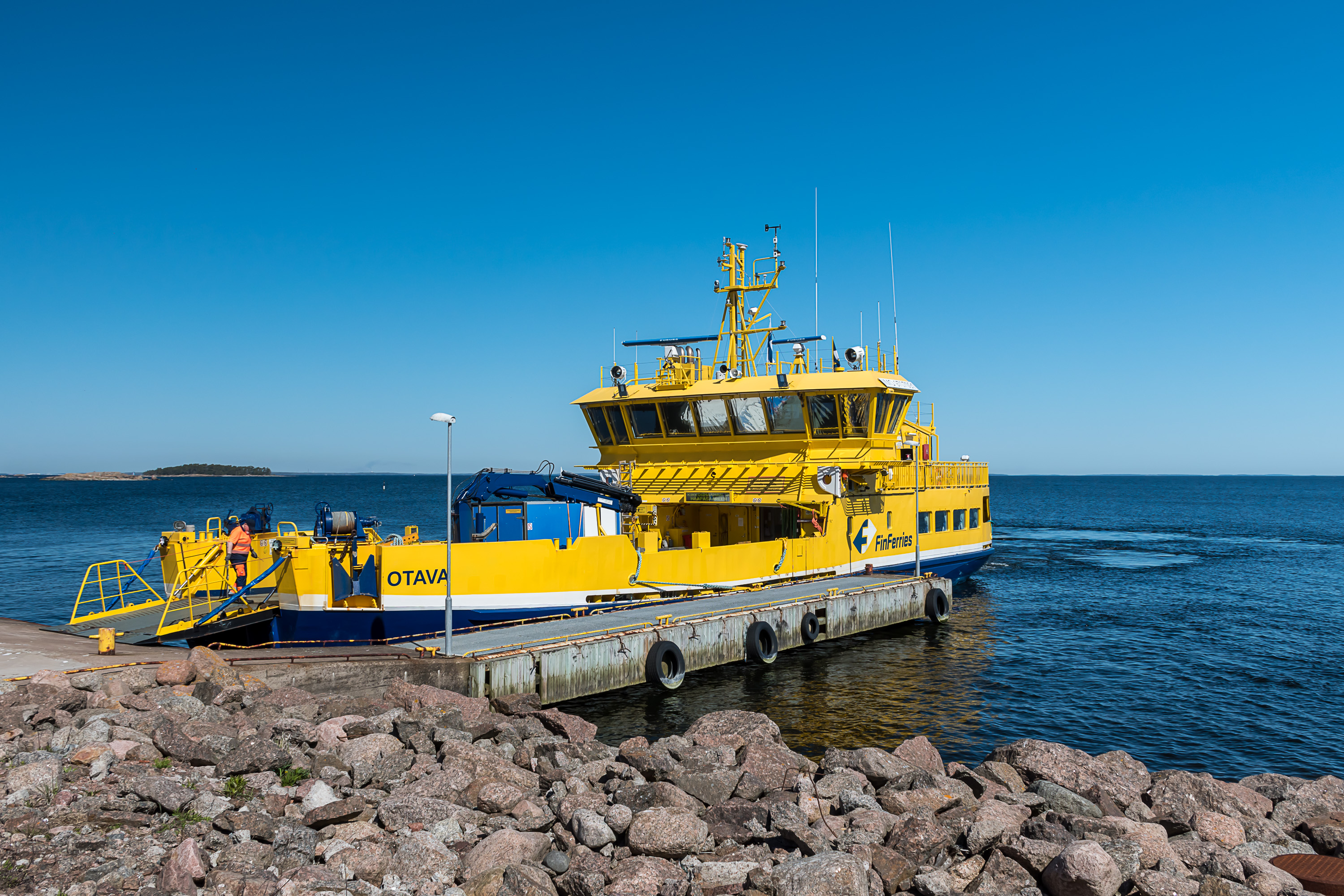 5. А вот и наш yhteysalus! Он называется "Отава" (Otava), что означает "Большая Медведица". Это довольно новое судно, построенное в 2014 году на верфи Уусикаупунки (недалеко от Турку), специализирующейся на подобных небольших пассажирских судах, паромах, пограничных катерах и т. п. Все мелкие суда в Финляндии по умолчанию заказываются именно в Уусикаупунки. "Отава" обычно имеет экипаж в 2 человека, и может перевозить до 130 пассажиров и до 8 легковых машин (или одну грузовую). Ее вторичная функция — ликвидация разливов нефти, в таком случае экипаж требуется побольше. "Отава" рано утром уже успела съездить на остров Куутсало и привозит оттуда несколько человек и одну машину.