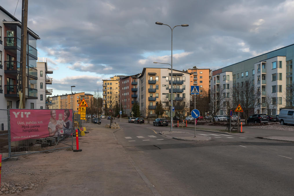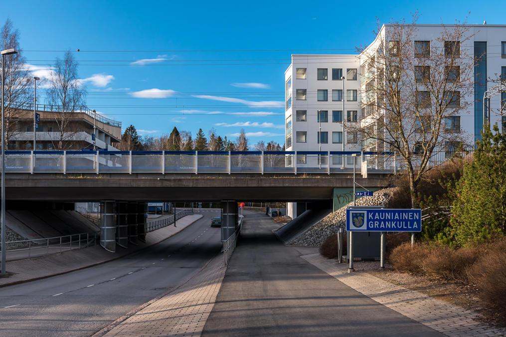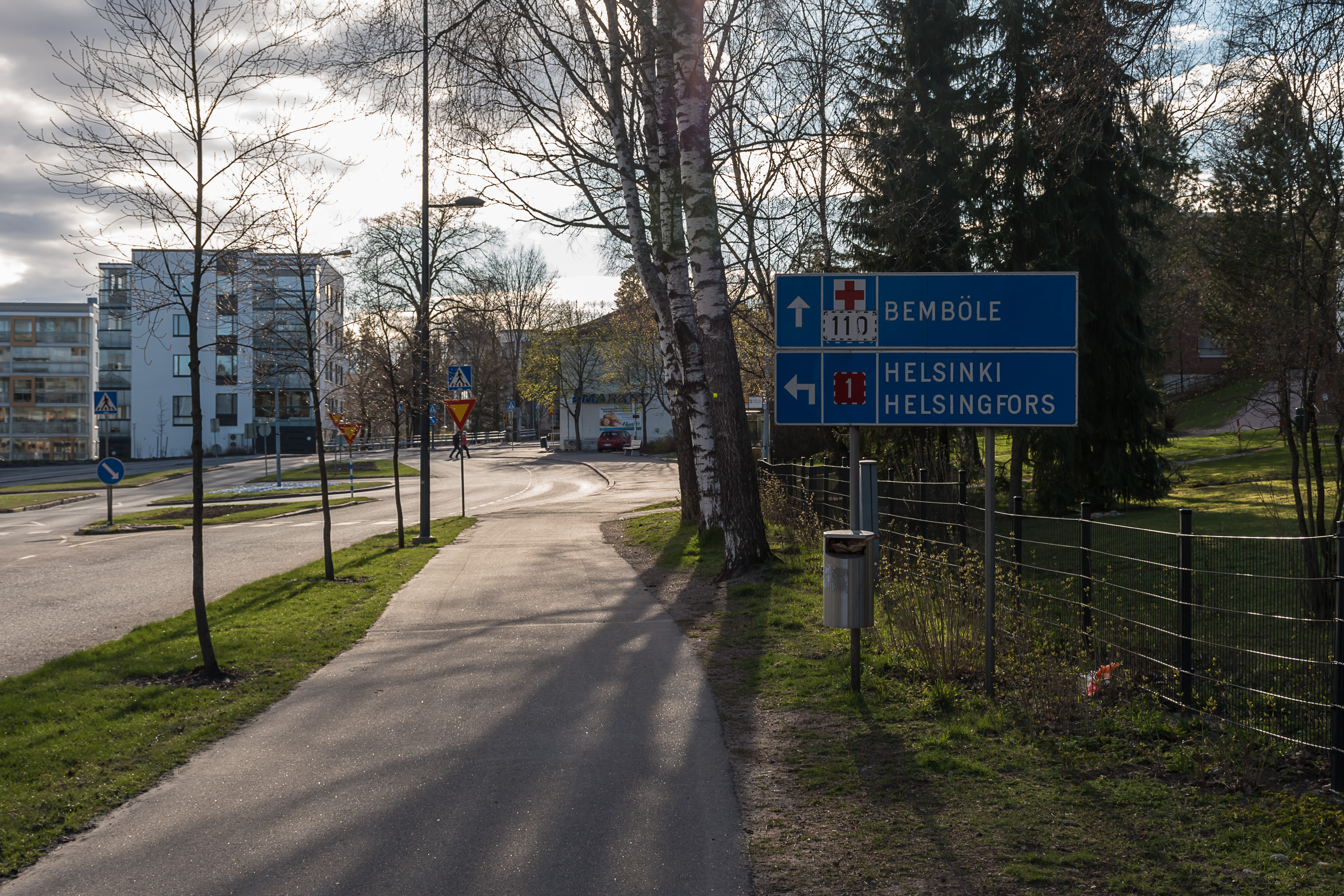 6. Одна из главных улиц Кауниайнена. Раз уж это отдельный город, то дорожные знаки с указателями на другие города — Хельсинки и Эспоо (Бембёле — его район) — на синем, а не белом фоне.
