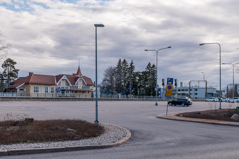 Мы смотрим сейчас на станцию с северной стороны, и на переднем плане видна большая перехватывающая парковка (бесплатная с ограничением по времени 12 часов). Она не всегда такая пустая, как на фото (помимо прочего, фото сняты в период коронавирусных ограничений) — фактически, по будням она обычно полностью заполняется, потому что пара станций в Кауниайнене — последние, входящие в тарифную зону B, а от следующих станций из зоны C ехать до Хельсинки уже значительно дороже. Так что многие жители дальних районов Эспоо, плохо обеспеченных общественным транспортом, предпочитают оставлять машину и пересаживаться на электричку в Кауниайнене, даже если до другой станции им было бы ехать ближе.