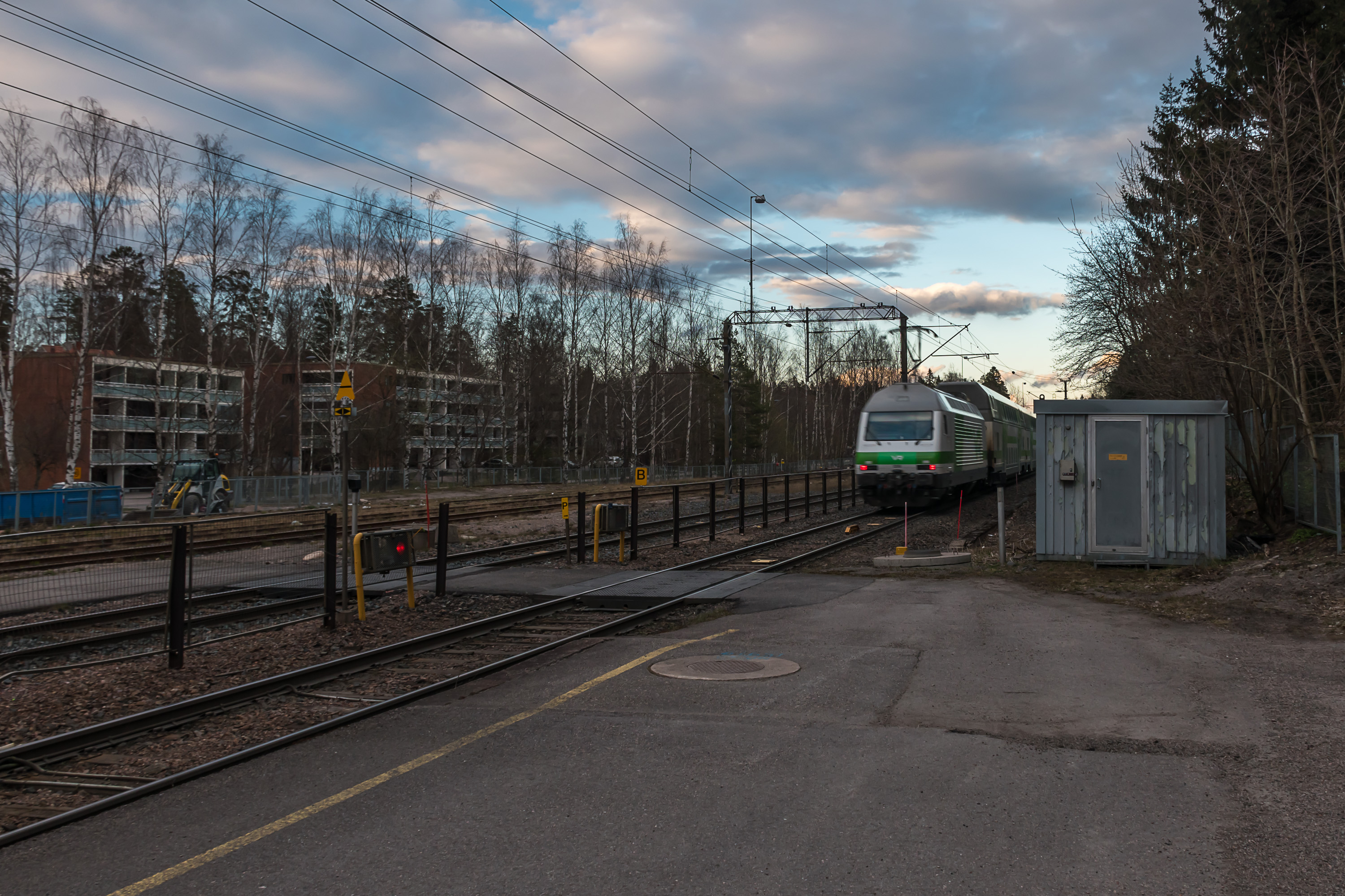 44. Станция на самом деле на удивление устаревшая; на ней низкие платформы, так что, когда заходишь в поезд, есть ступенька — всего одна и не такая уж и высокая, но инвалиду уже самому не заехать на коляске. А еще с восточного края станции на платформу, от которой отправляются поезда в западном направлении, нужно идти прямо по переходу через рельсы — а ведь тут не только останавливаются электрички, но и проезжают на довольно приличной скорости поезда Хельсинки-Турку — вон как раз на фото проехал (да, с электровозом сзади). Это очень редкая ситуация для станция в пределах пригородной зоны Хельсинки; в этом направлении, на Турку, кроме Кауниайнена такая станция, с низкими платформами и переходом через пути, всего одна — Йорвас (Jorvas), да и та уже в совсем деревне. По крайней мере я вроде бы где-то читал, что планы реконструкции пассажирской инфраструктуры станции Кауниайнен все же существуют.