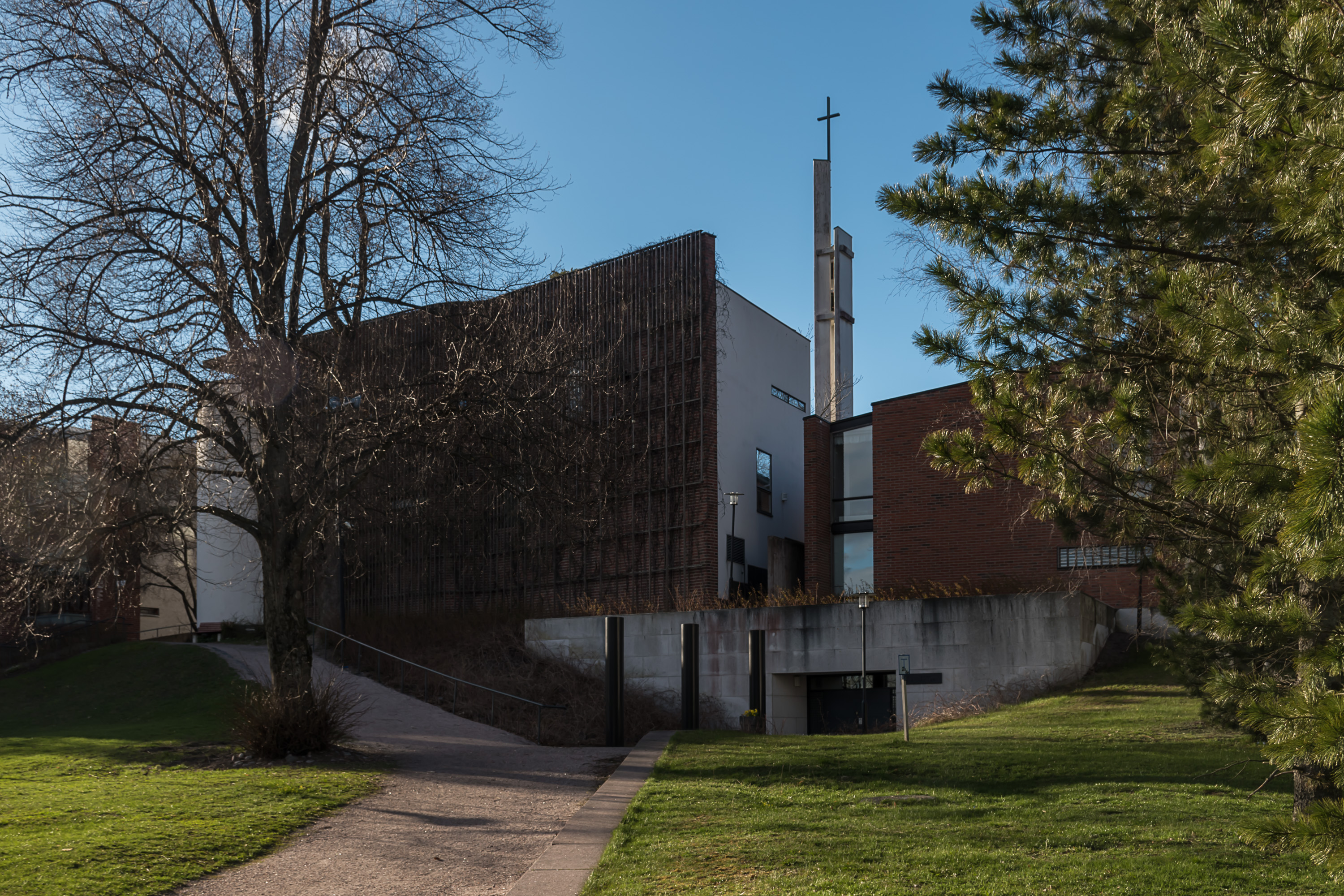 5. Церковь, прямо напротив станции. Как ни странно, эта церковь построена не вместо какой-то старой сгоревшей (чем обычно объясняется существование такого вида церквей в не самых молодых районах); это и есть изначальная церковь Кауниайнена, собственный приход в котором появился лишь в 1978 году, а церковь построили в 1983 по проекту Кристиана Гуллихсена (Kristian Gullichsen, р. 1932), одного из наиболее выдающихся финских архитекторов-модернистов конца 20 века. Достаточно по-своему симпатичная церковь, хотя и не очень похожая на церковь в принципе.