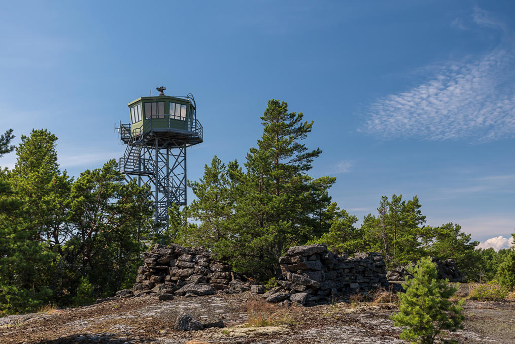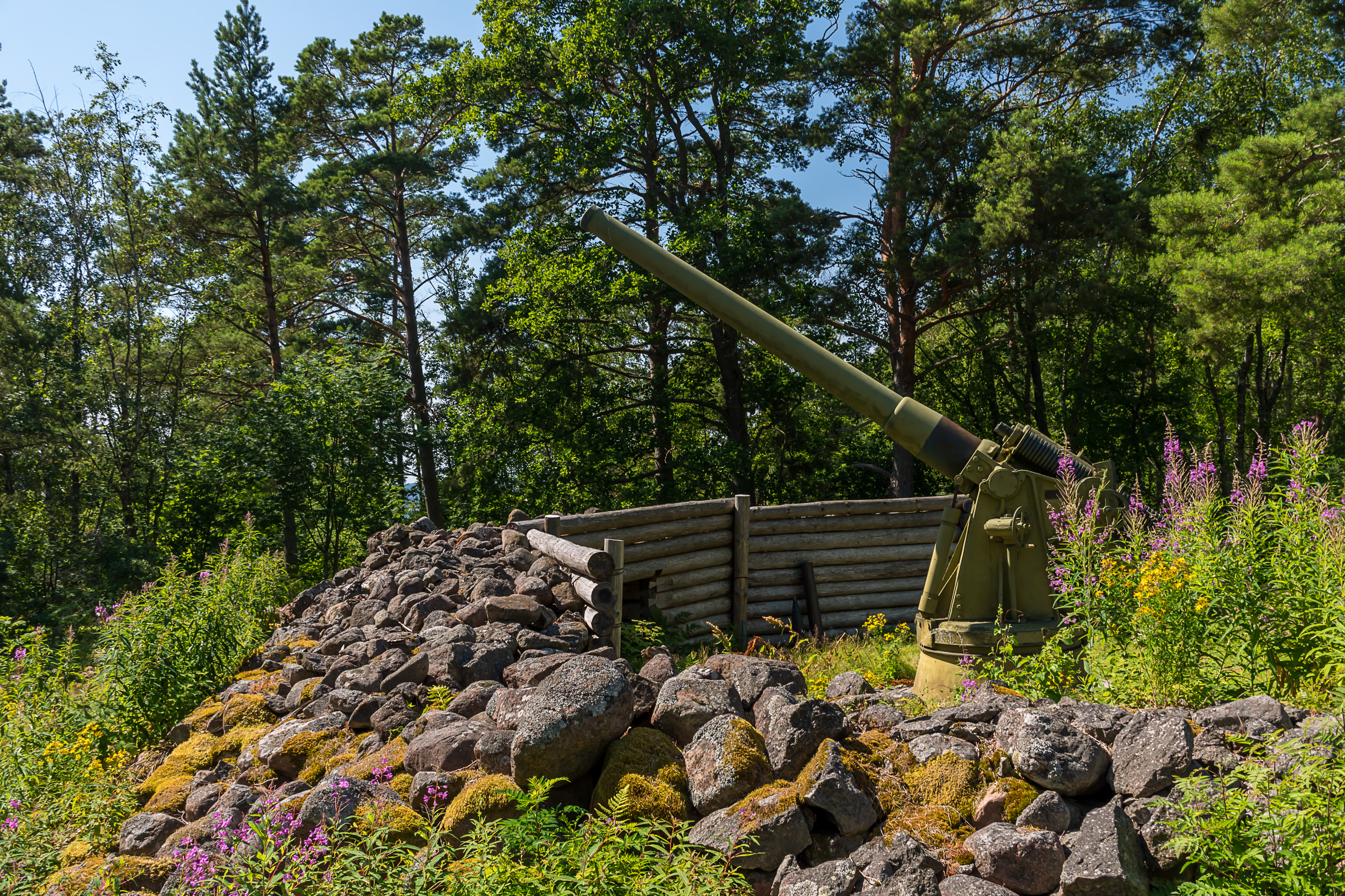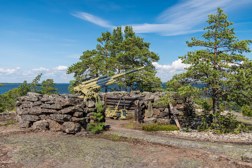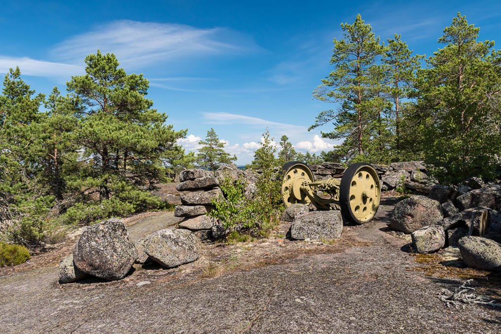 19. Изначально на Улко-Таммио были три батареи с рядом орудий. Сейчас на свои старые позиции установлено два музейных орудия. Одно из них — эта 152-мм пушка Канэ (152/45 C), рядом с гаванью. Спроектированные Гюставом Канэ (Gustave Canet) во Франции, эти пушки массово производились в России, в Петербурге и Перми, в 1897-1916 годах, и, как и в случае могучих 305-мм Обуховских пушек, многие из них (около 100) остались в финских руках после провозглашения независимости Финляндии. Пушки использовались невероятно долго, последние были выведены из эксплуатации в 1990-х, на Хестё-Бусё под Экенесом. Это, впрочем, не какая-то левая пушка, а именно одна из тех, что реально были установлены в войну на Улко-Таммио и участвовали в битве за Соммерс; после войны ее увезли, но для национального парка установили впоследствии обратно.