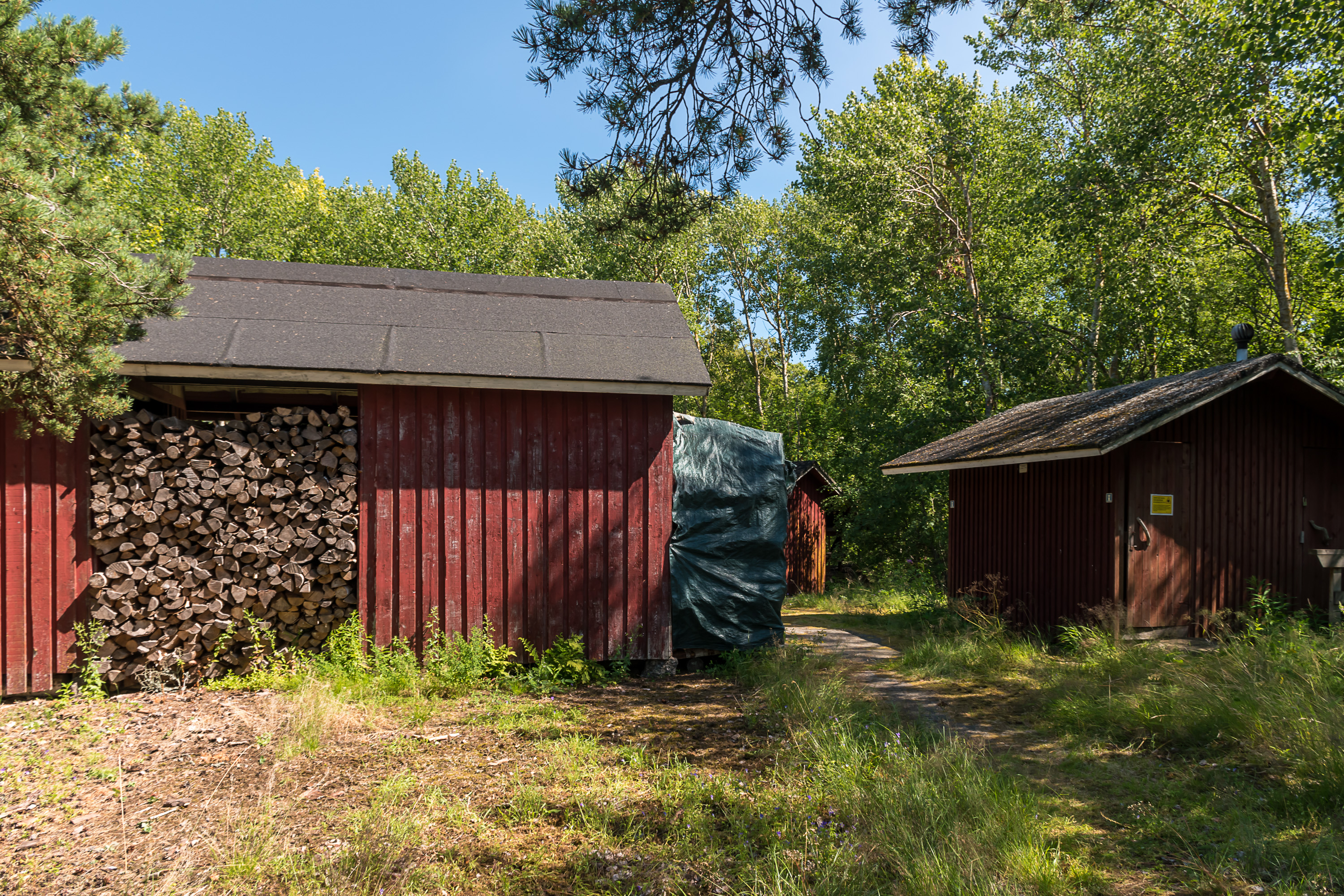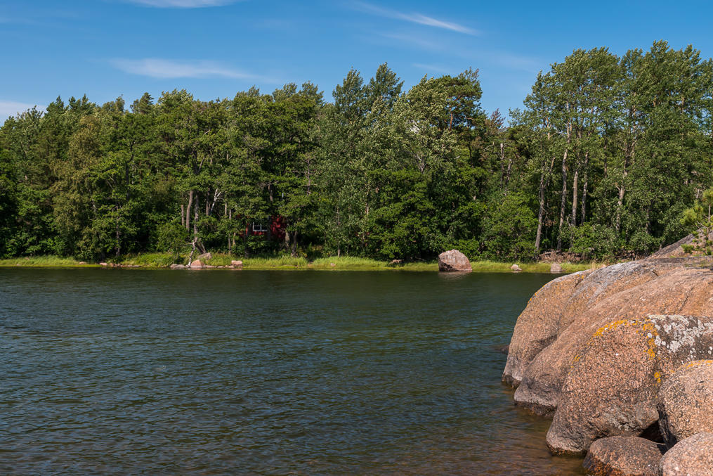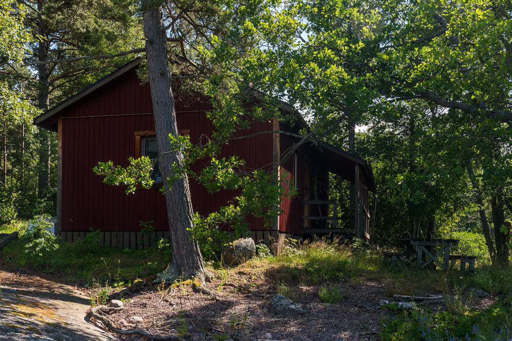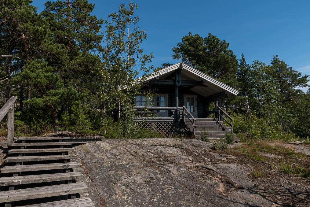 55. Хижину для ночевки (autiotupa), открытую для свободного использованиям всеми, единственное сохраненное со времен войны здание, я каким-то образом пропустил. Тут она чуть-чуть выглядывает из леса через бухту. Если интересно, как она выглядит снаружи и изнутри, поищите картинки по запросу ulko-tammion autiotupa. В бывшей маленькой казарме сейчас есть койки на шесть человек и обычная кухня, включающая как печь, так и газовую плитку. Питьевую воду можно брать из колодца.