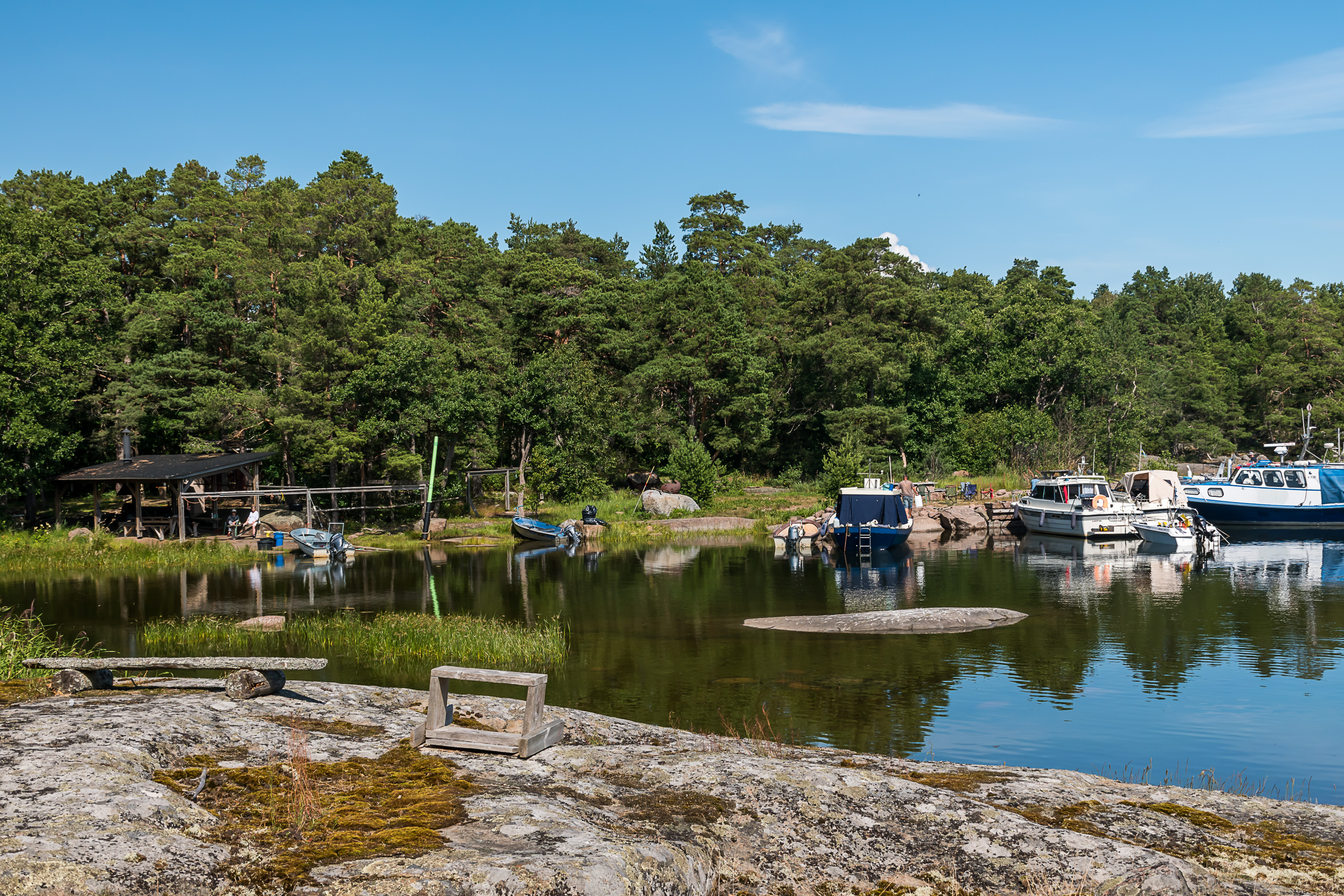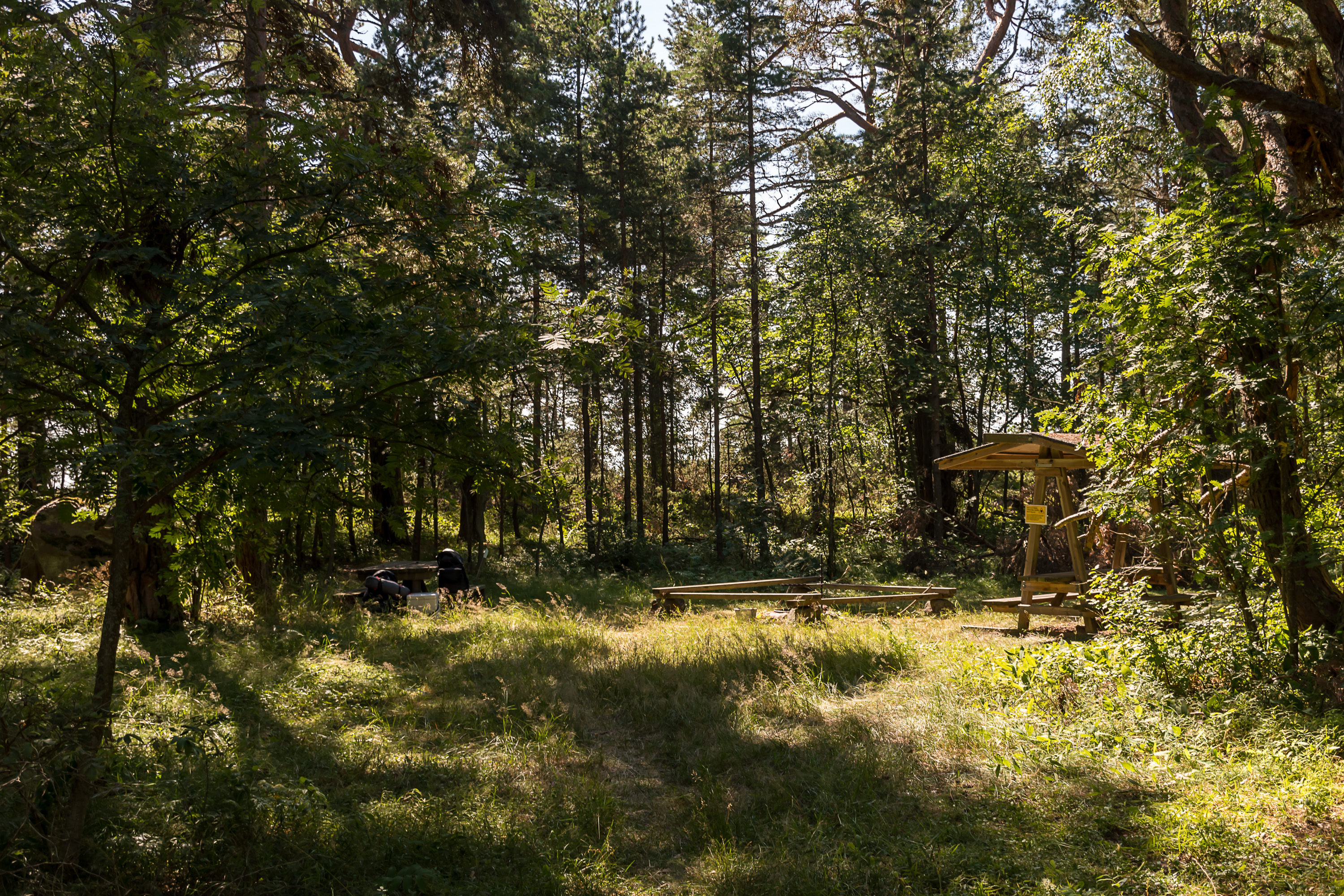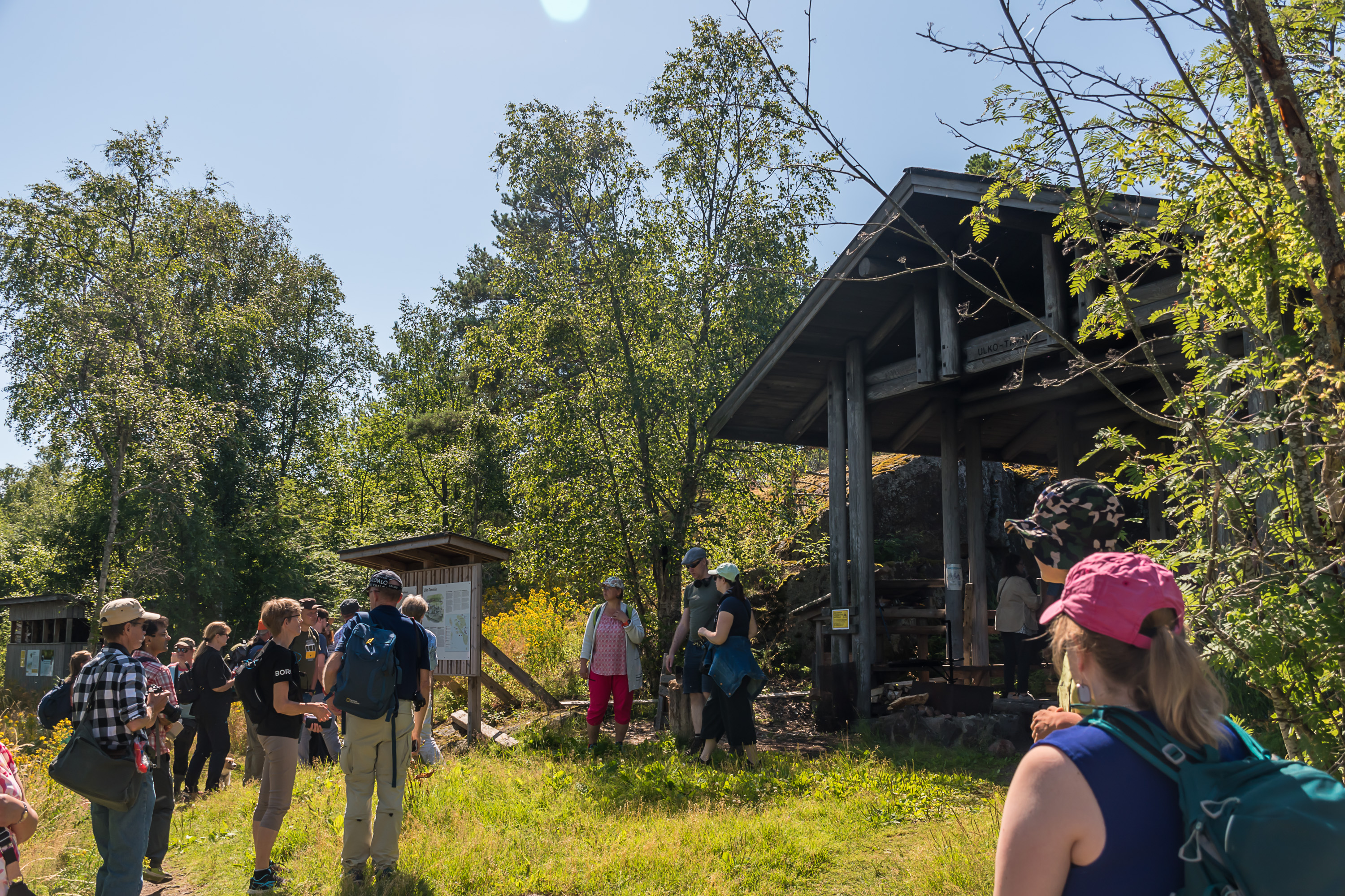 7. У причала нас встречают информационные щиты, довольно огромный навес для гриля, и женщина-экскурсовод. Она встречает пассажиров с "Виклы-III" и проводит экскурсии по острову (на финском, конечно), длительностью в час. Экскурсии бесплатные, а женщина — сотрудник Метсяхаллитуса, Лесной администрации — организации, отвечающей в числе прочего за национальные парки. Очень необычно на самом деле, никогда таких экскурсий не видел в других национальных парках. Конечно, почти во все остальные можно попасть на машине в любое время, а экскурсовод, как я понимаю, летом вообще здесь на острове живет в избушке смотрителя острова, и также занимается уходом за походной инфраструктурой и т. п.