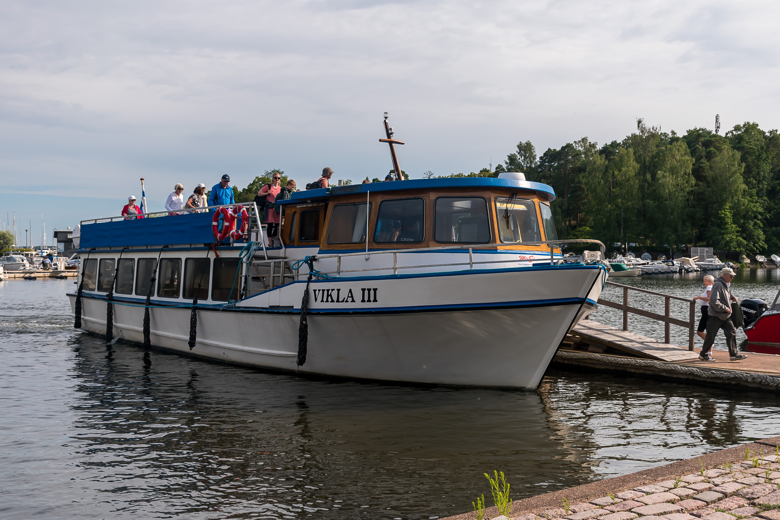 3. Вот и он, теплоход "Викла-III" компании MeriSet. Рассчитан на 130 пассажиров, на борту действует кафе, скорее даже бар. Приятный теплоходик, но примечательного в нем самом ничего нет. Это фото на самом деле уже с возвращения обратно в Котку, поэтому все выходят :)