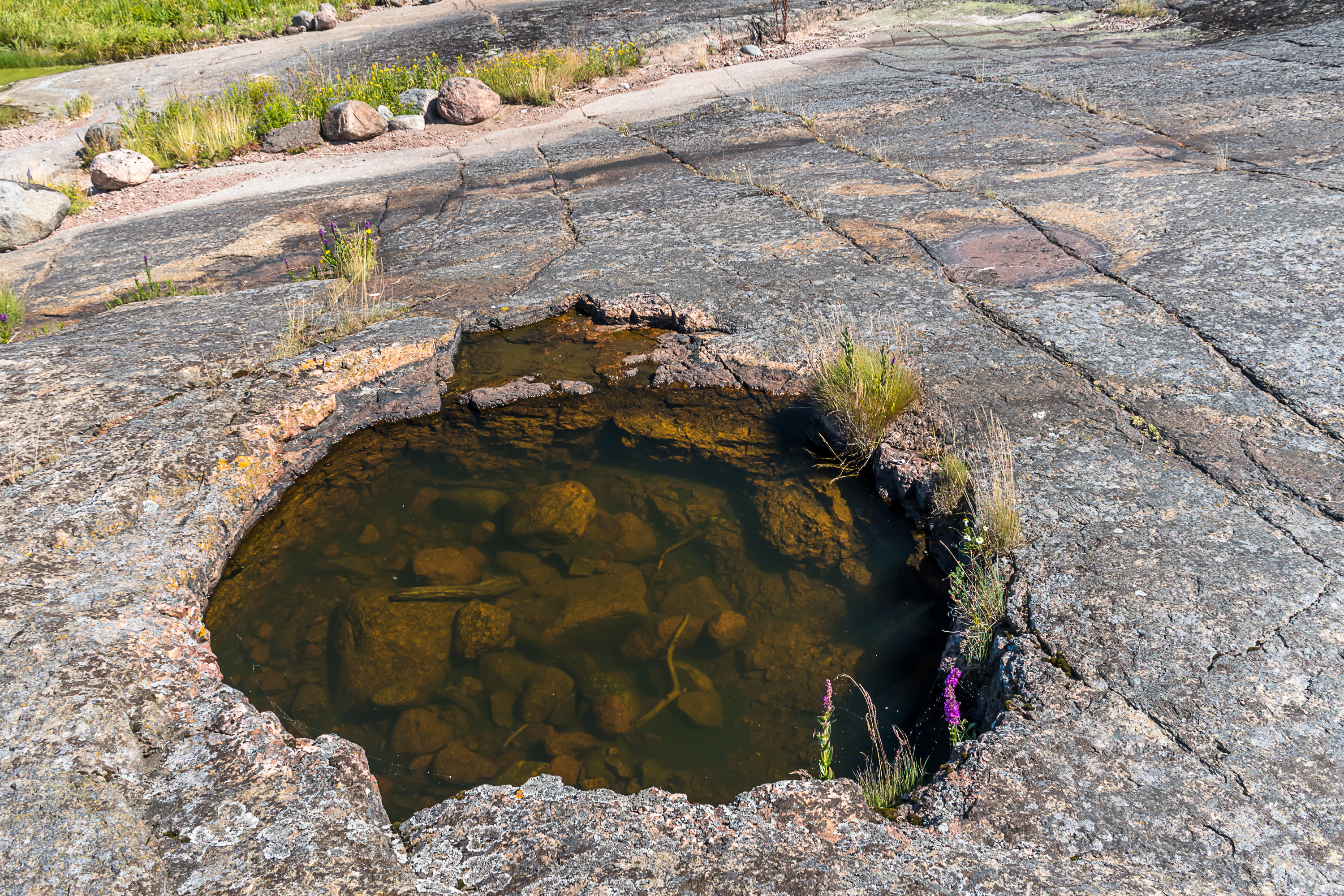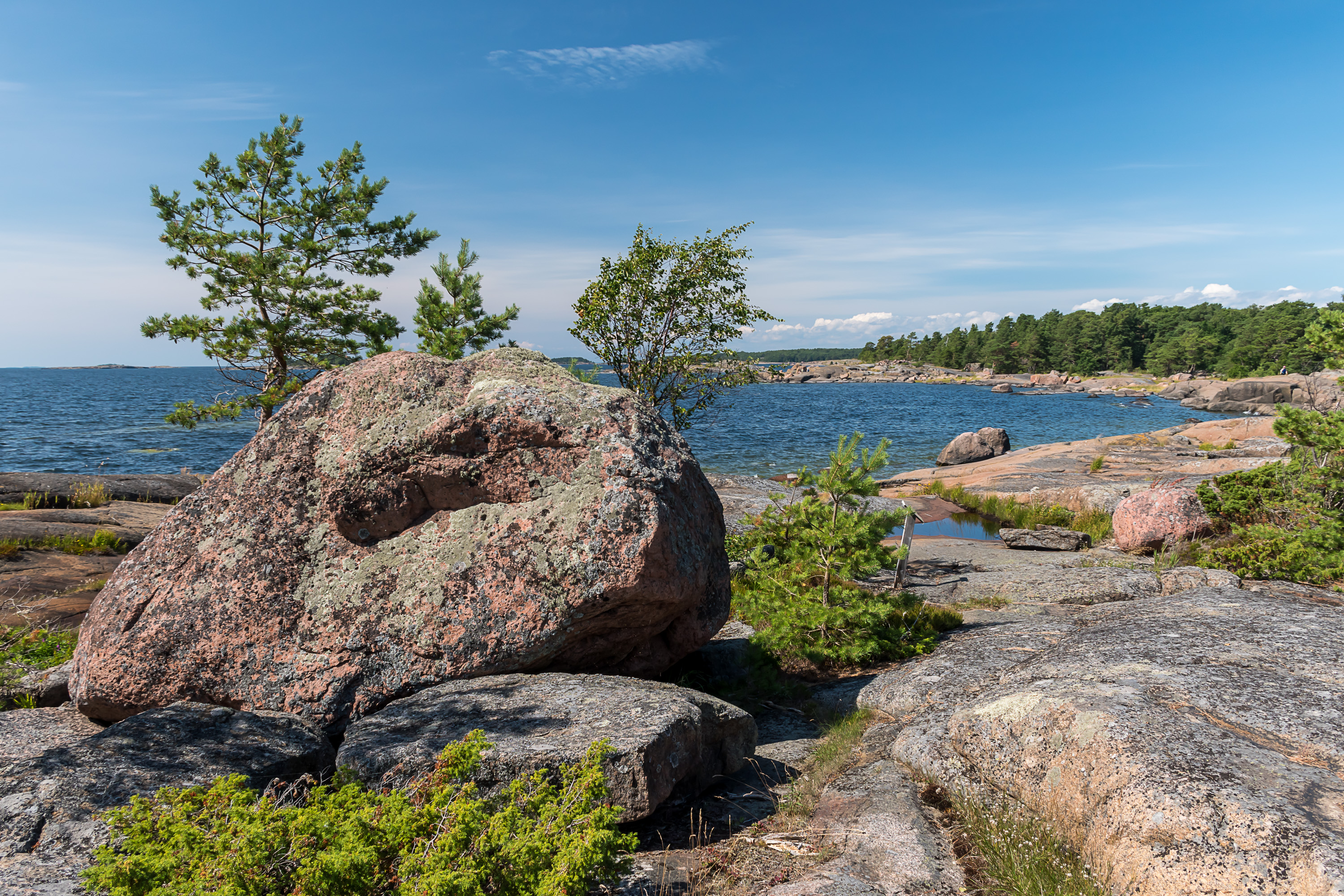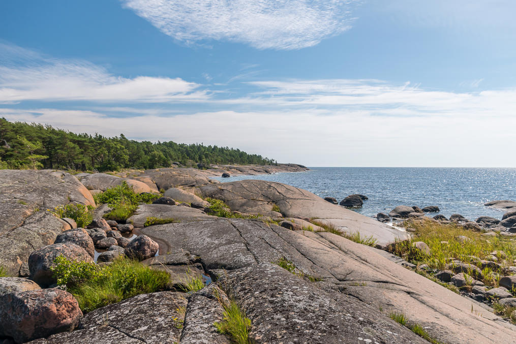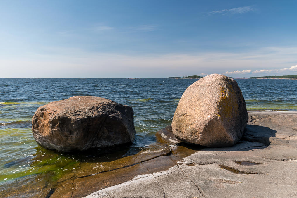 28. Скалы Улко-Таммио сложены красным гранитом-рапакиви. Это, вероятно, один из самых известных характерных финских сортов камня, особенно для нас, россиян — рапакиви широко использовался для строительства и отделки Санкт-Петербурга. Название rapakivi означает "крошащийся камень"; рапакиви вроде как действительно крошится несколько легче других гранитов. Но рапакиви является коренной породой далеко не везде в Финляндии, а только на юго-востоке, на Аландах и в паре небольших районов на юго-западе. В целом в Финляндии довольно много видов коренной породы, хотя для неспециалиста они почти все, конечно, похожи. Увидеть эти породы легко повсеместно в стране; 3% площади Финляндии — голая скала, еще 11% — скала, присыпанная <1 м грунта.