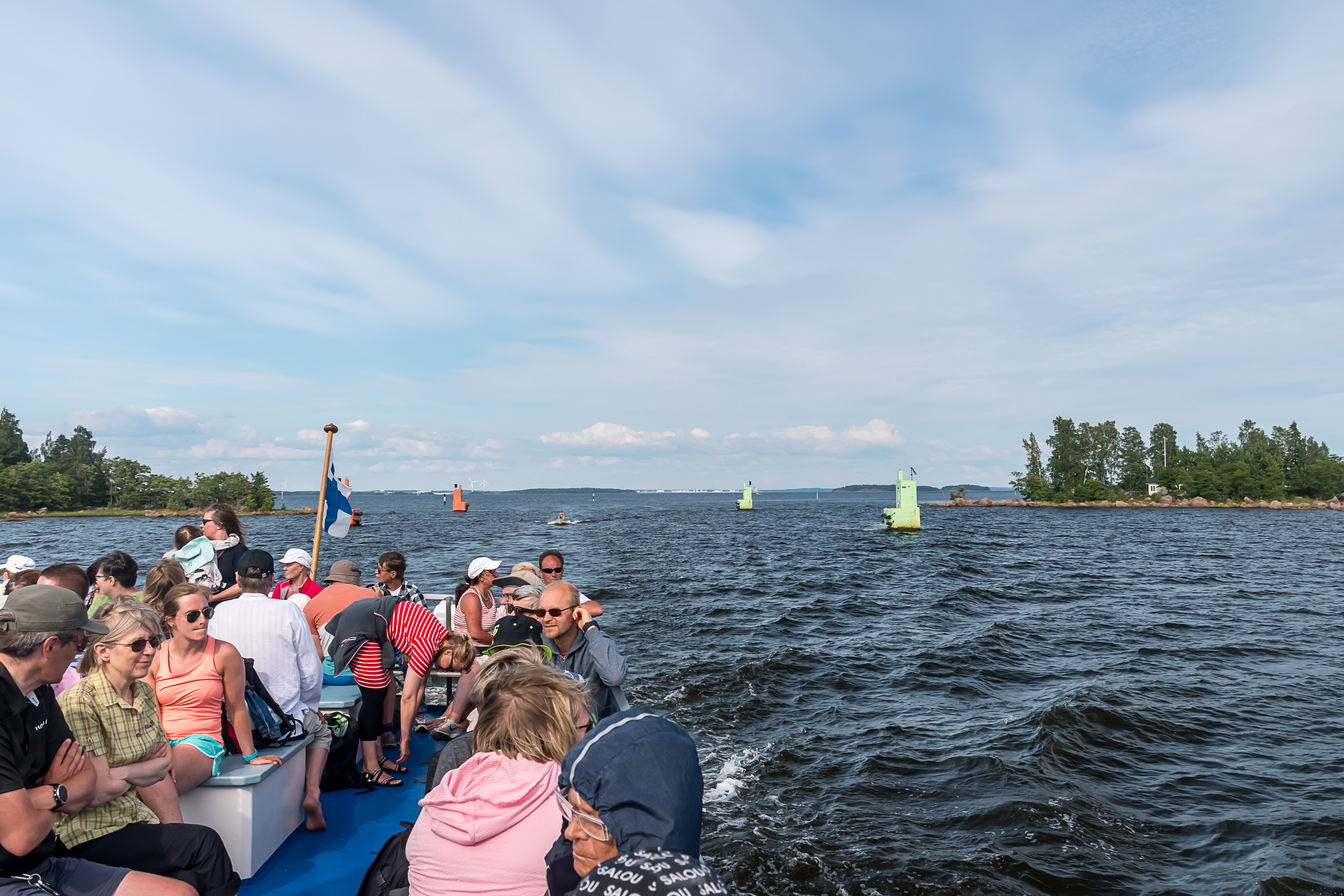 5. Поездка из гавани Сапокка в Котке на Улко-Таммио занимает чуть больше двух часов, и в самой поездке тоже ничего особенного нет (ну, у меня конечно подзамылился уже глаз, раз столько островов уже облазил). По дороге иногда делают объявления про то, мимо чего мы плывем и куда смотреть. Наиболее примечательное место, наверное, Руотсинсалми (Ruotsinsalmi, фин. Шведский пролив), тот самый пролив, где в 1790 состоялось Второе Роченсальмское сражение, крупнейшее морское сражение в истории Балтики. Между Россией и Швецией, конечно; Швеция одержала блестящую победу, и благодаря этому сумела свести вничью войну, которую проигрывала (хотя король Густав III все равно вскоре был убит заговорщиками; война была его идеей изначально). Конечно, сражение было не прямо в этом узеньком проливе, сейчас обнесенном необычно большими бакенами; он просто был одной из стратегически важных точек. Фото тоже сделано по пути обратно с Улко-Таммио, и на заднем плане вдалеке чуть виден крупный порт Хамины, но к нему близко мы не подходили.