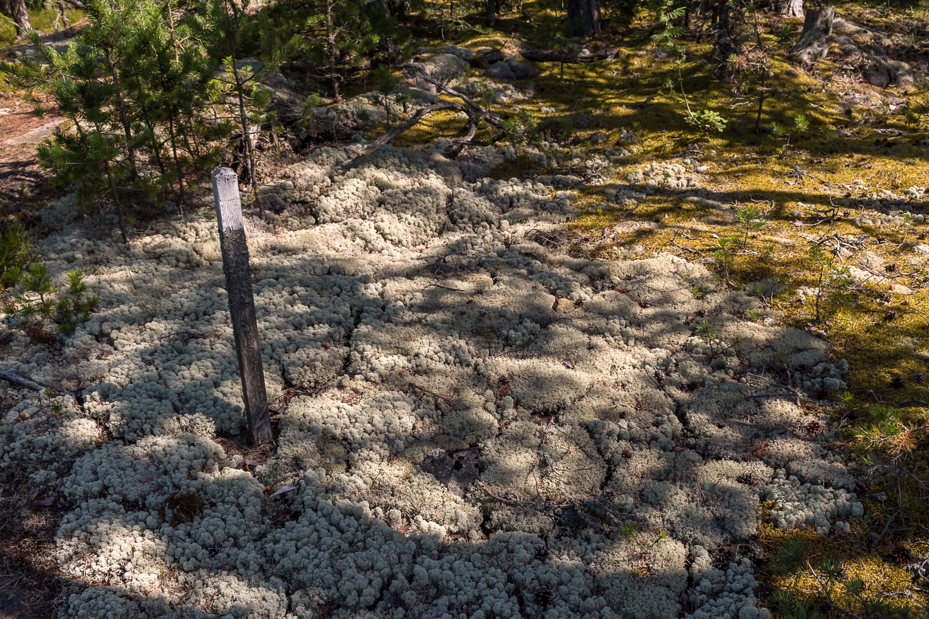 32. Пласт ягеля трескается от сухости. Идти по официальной природной тропе довольно неудобно местами; колышки расставлены на большом расстоянии друг от друга и не так уж хорошо заметны издали, так что особенно на скалистых участках сбиться с пути легко.