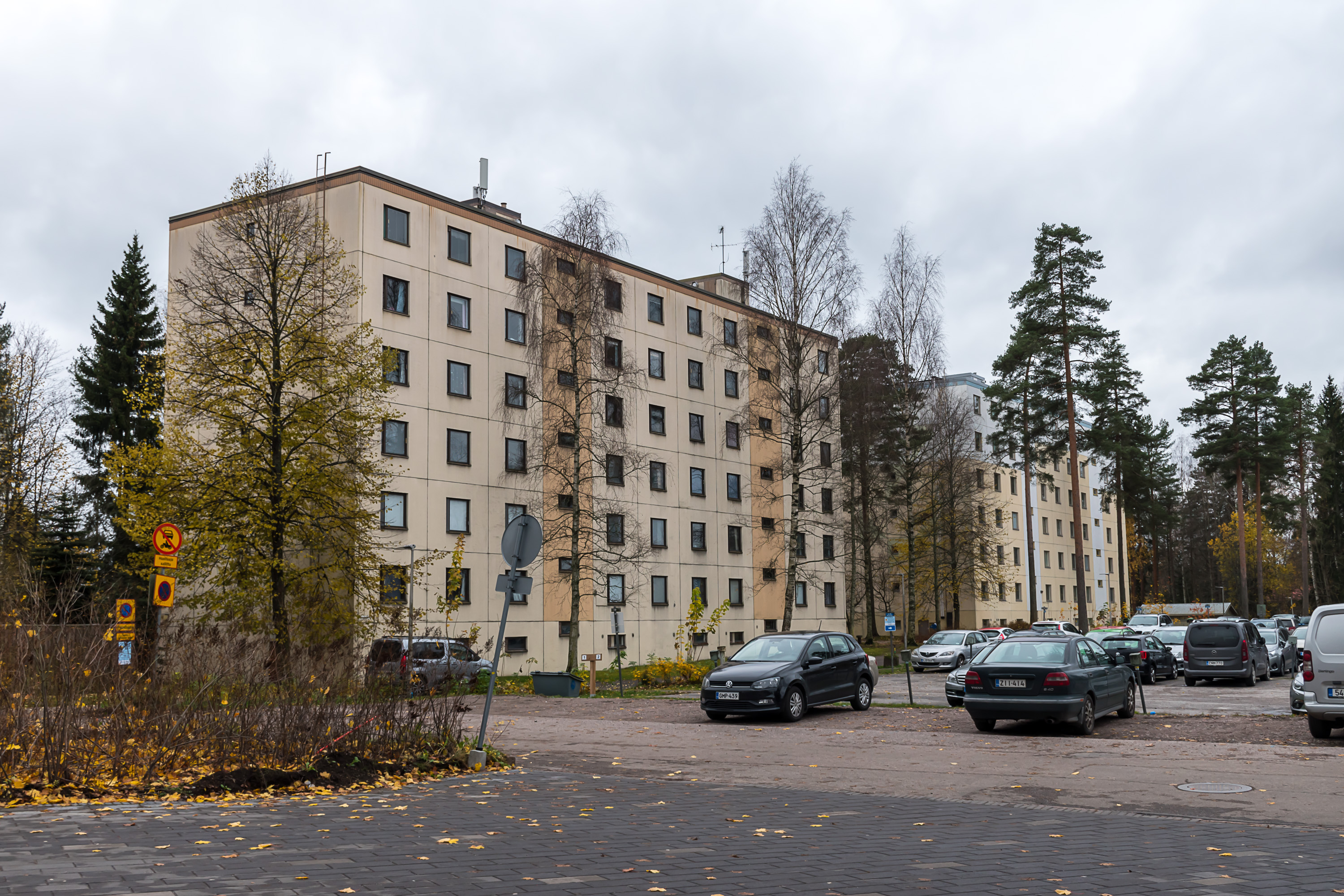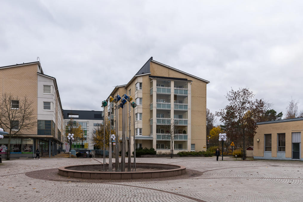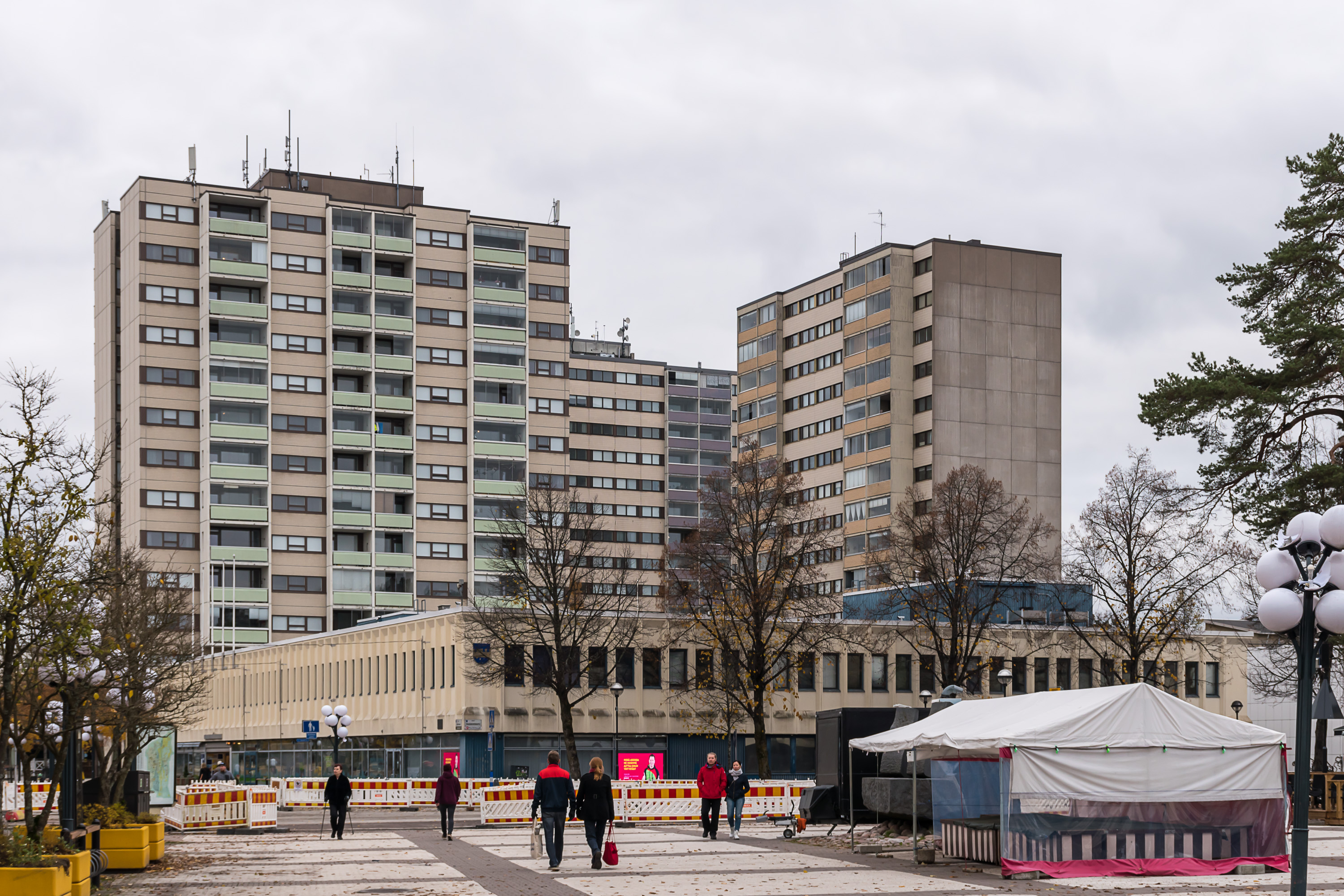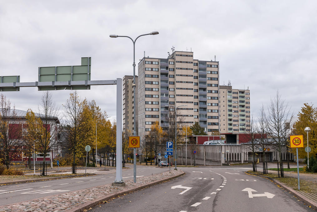 18. Основная доминанта центра Керавы, находящаяся прямо у центральной рыночной площади — квартал из нескольких немолодых многоэтажек, по высоте резко выделяющийся из окружающей застройки. С 16 этажами и высотой в 60 м они входят в число самых высоких зданий Финляндии, а на момент постройки (1975) так и вовсе были самыми высокими жилыми зданиями страны. Невысокое здание на переднем плане к жилым башням не относится — это городская администрация.