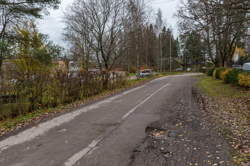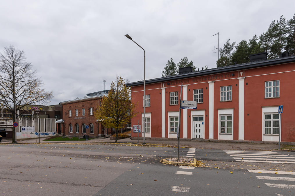 9. Два домика постарше (в Кераве не такое уж частое зрелище) у путепровода. Слева офис Nikkarinkruunu (местной муниципальной компании аренды жилья), справа музыкальная школа. Еще видно знак с названием улицы нестандартного дизайна; Керава сдает на них небольшое пространство под рекламу. В Финляндии так делают редко, но все же припоминаю подобное и в каких-то других городах.