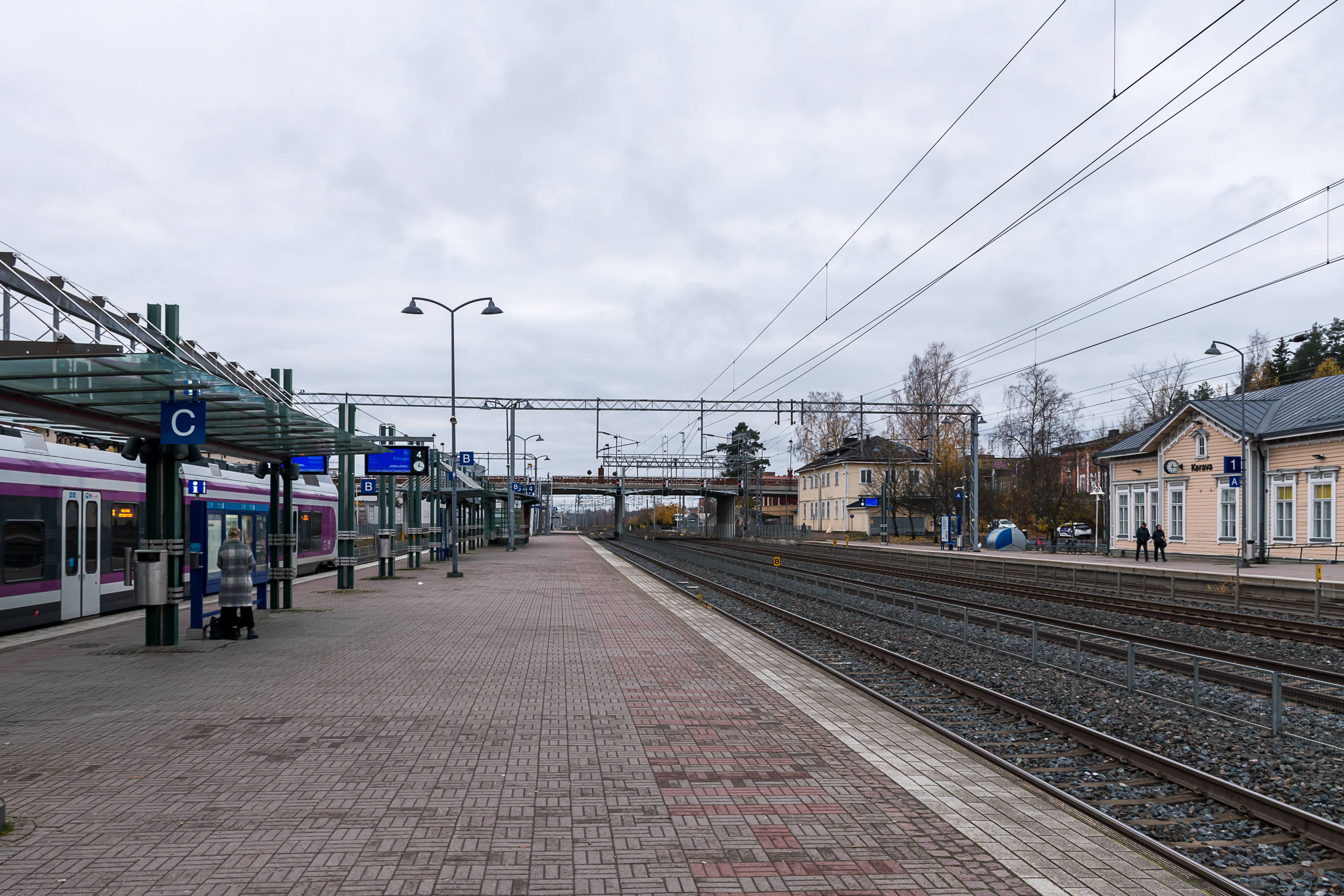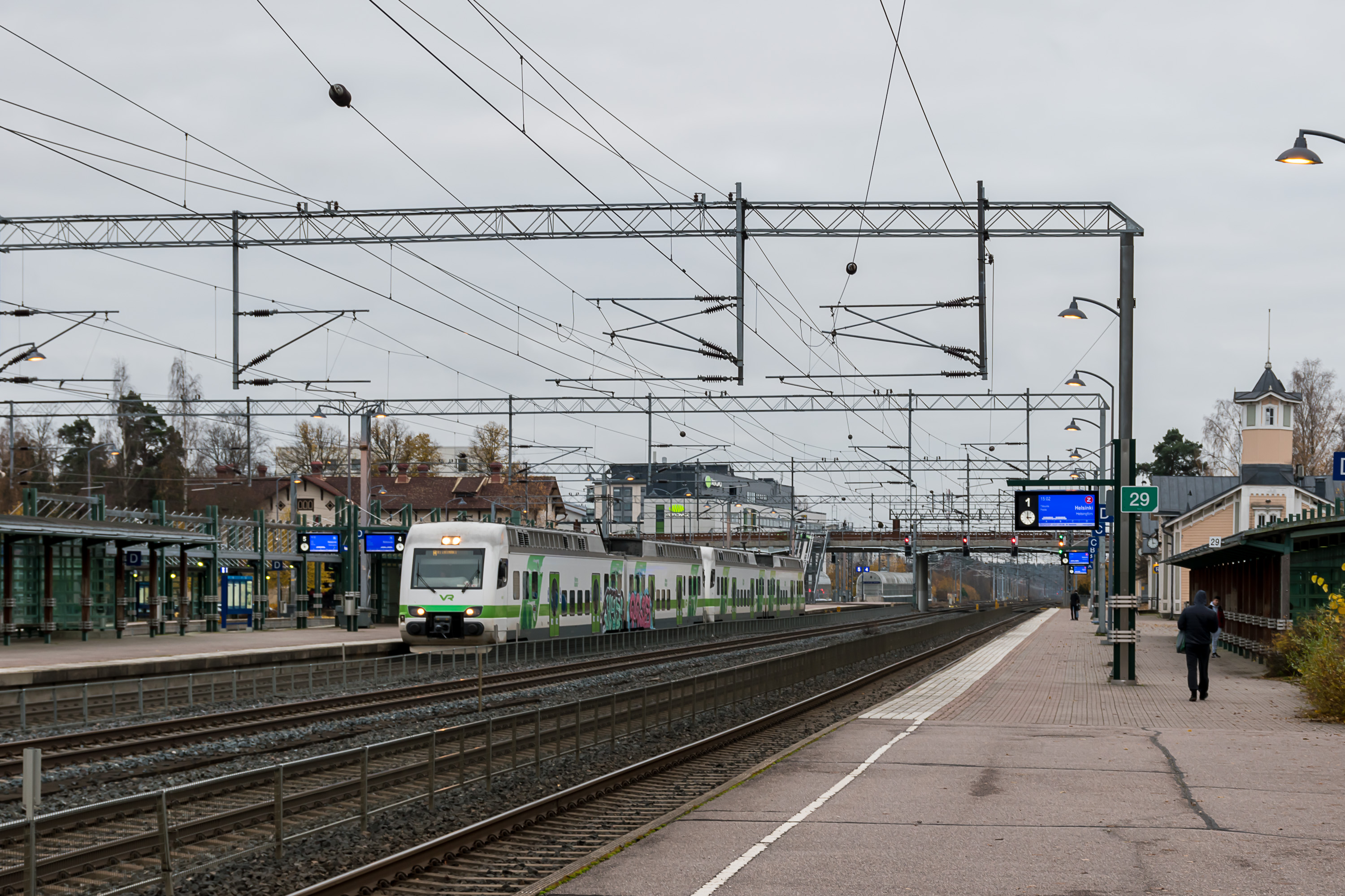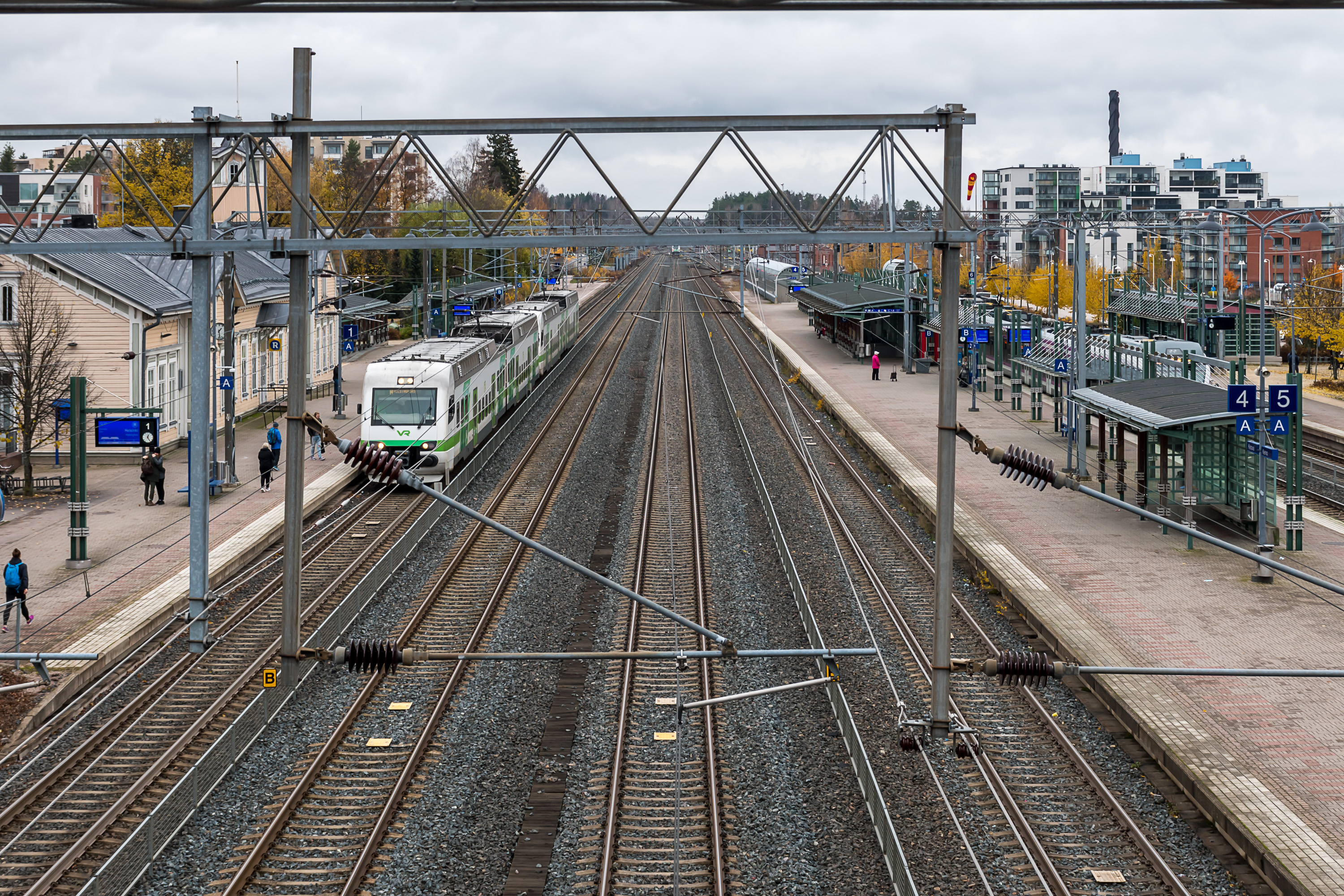 7. Вид на станцию с путепровода. Слева направо: путь 1 для дальних электричек в сторону Хельсинки; пути 2-3 для поездов дальнего следования и товарных поездов, проходящих без остановки; путь 4 для дальних электричек в стороны Рийхимяки/Тампере и Лахти; путь 5 для городских электричек, у которых тут конечная; путь 6 используется только музейными поездами на Порвоо. На 1-м пути стоит электричка Рийхимяки-Хельсинки (маршрут R). Для этих дальних маршрутов используется подвижной состав Sm2 и Sm4, отличающийся от обычных городских Stadler FLIRT (Sm5).