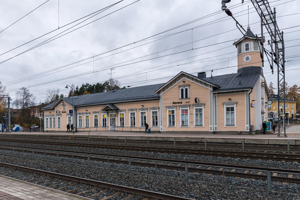 2. Вокзал Керавы построен в 1878 году (архитектором Кнутом Нюландером). Со временем он несколько расширялся и реконструировался. Сейчас в здании размещается кафе, магазинчик R-Kioski и маленький зал ожидания, открытый только по будням с 7 до 17. Поезда дальнего следования в Кераве сейчас не останавливаются, так что зал ожидания на самом деле особо и не нужен.