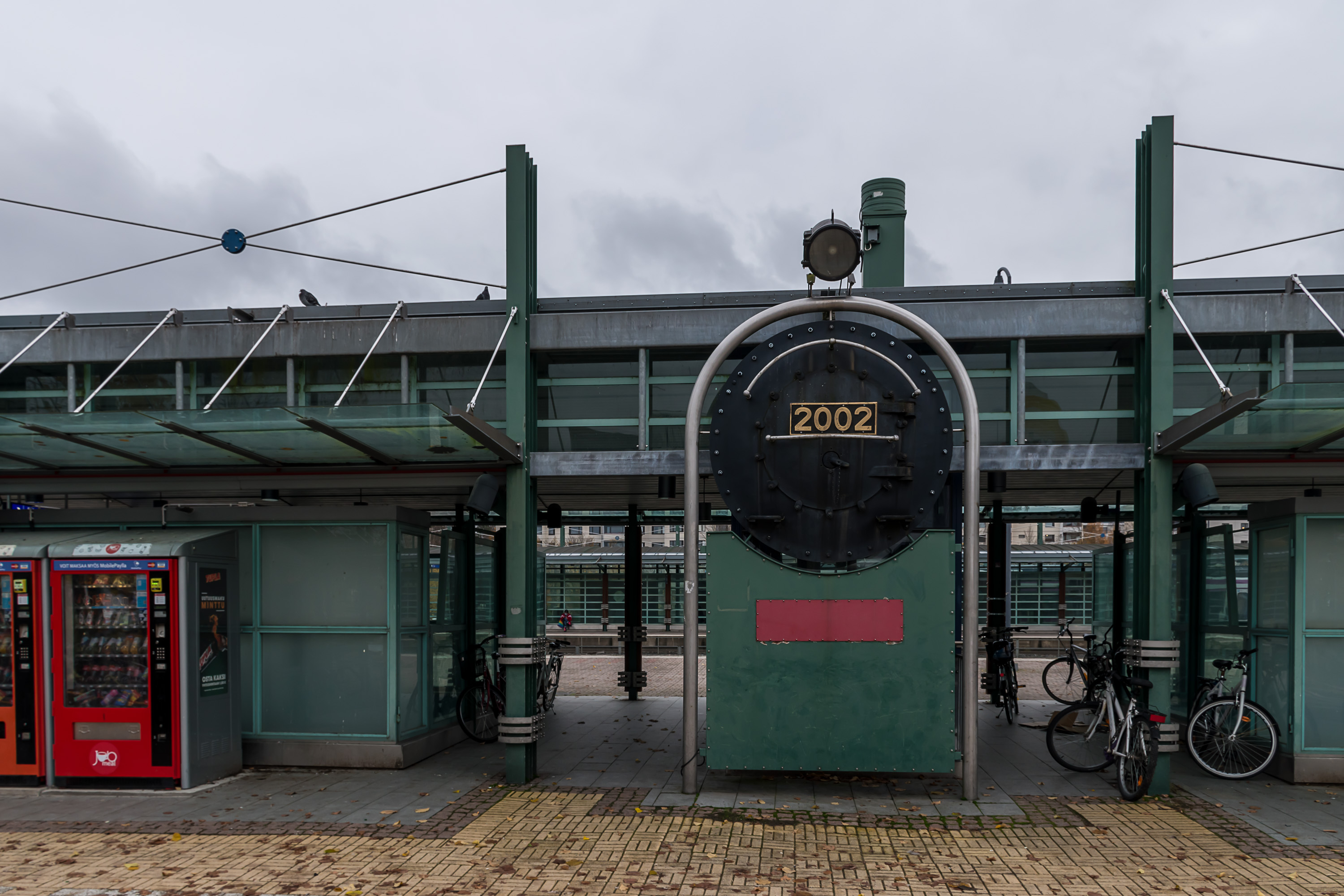 5. Любопытный элемент декора станции. Не уверен точно, это от настоящего паровоза отпилили, или просто макет; скорее последнее. По-моему, и паровоза под номером 2002 никогда не было, это скорее год, когда станцию полностью реконструировали — по сути перестроили с нуля все, кроме вокзала. На самом деле на станции есть и настоящий паровоз-памятник, причем даже редкой модели (Hv3), но он стоит по другую сторону станции от вокзала, и я почему-то забыл его сфотографировать.