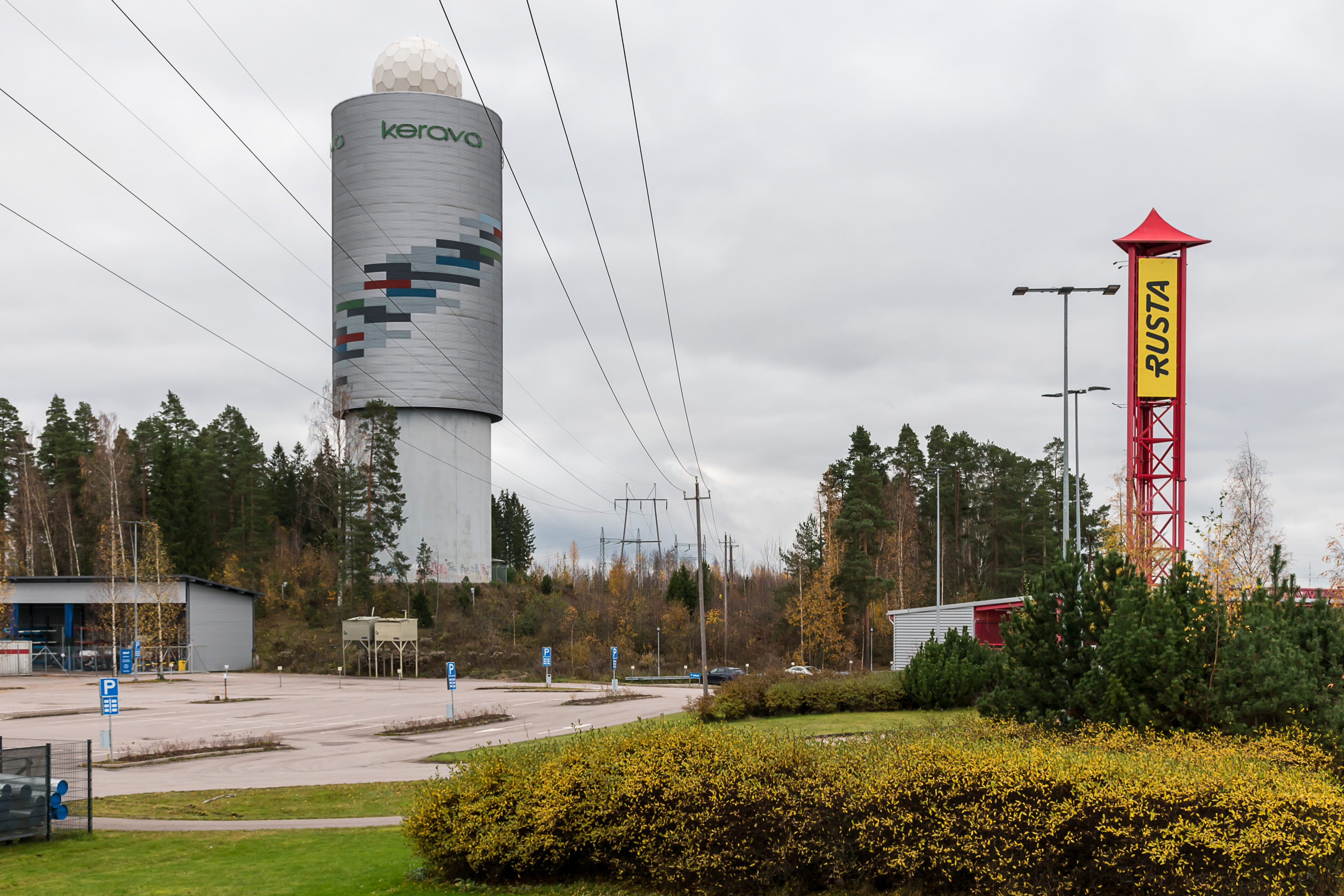 61. Керавская водонапорная башня видна с автомагистрали (она проходит совсем рядом к востоку), возвещая всем проезжающим мимо о существовании Керавы. На самом деле это почти новая водонапорка, 2008 года. Rusta, справа — для Финляндии совсем новый брэнд; шведская сеть Rusta купила несколько лет назад финскую сеть универмагов Hong Kong, и в этом году переименовала их в Rusta. (Понятия не имею, почему они вообще назывались Hong Kong — я, проезжая мимо их магазина в Ваасе, долгое время думал, что это просто азиатский ресторан какой-то.)