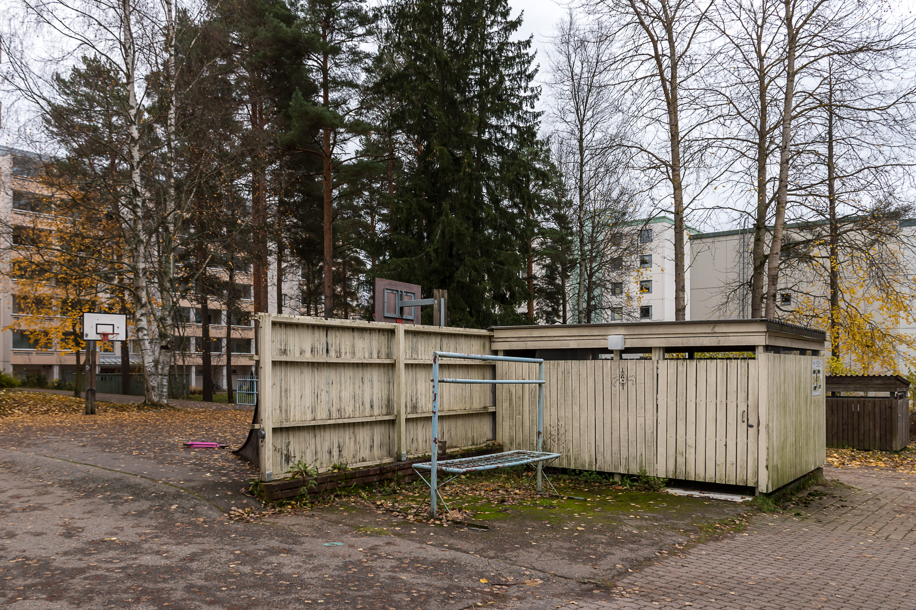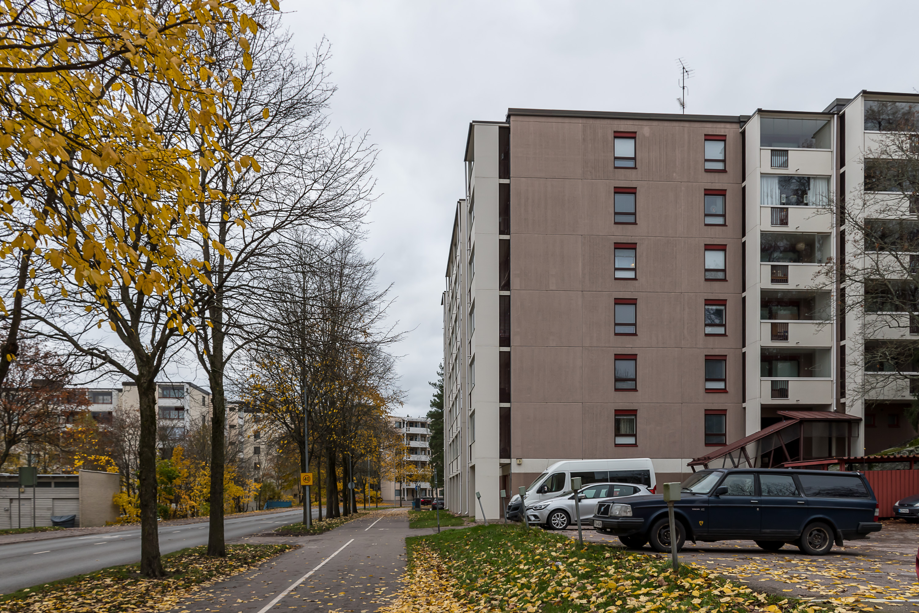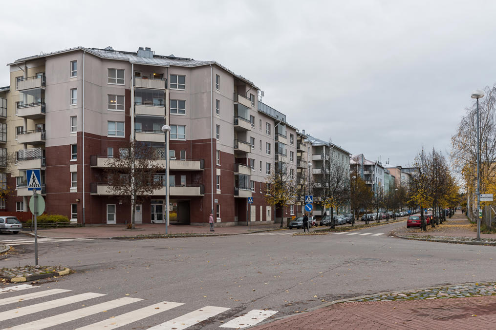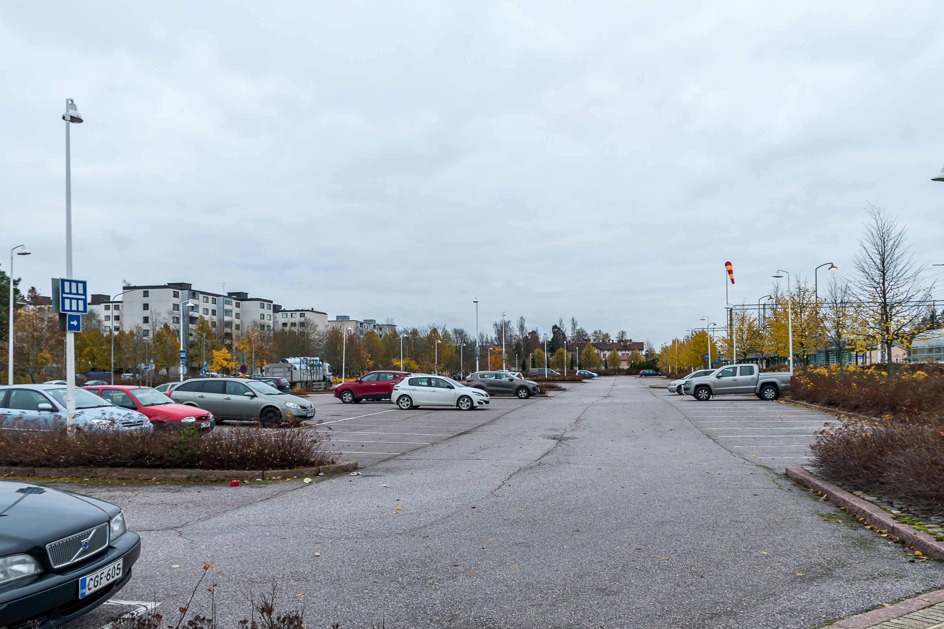 35. Теперь мы дошли до Килты (Kilta), классического панельного спального микрорайона 1970-х, из тех, что зовут lähiö. По меркам lähiö на самом деле Килта выглядит достаточно приличным микрорайоном. Парковки тут все вынесены на край квартала.
